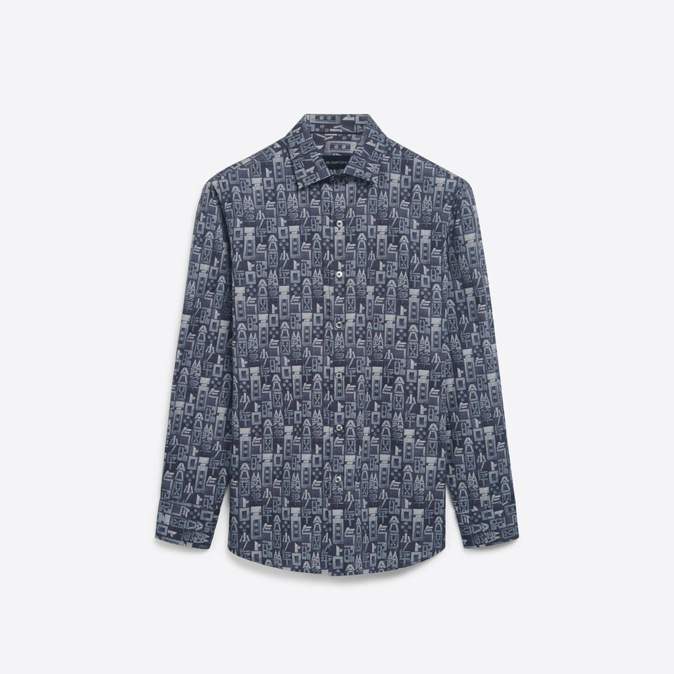 Abstract Liberty print long sleeve 100% cotton shirt with point collar, French placket, adjustable notched cuffs and a curved hem for a clean tucked or untucked look.