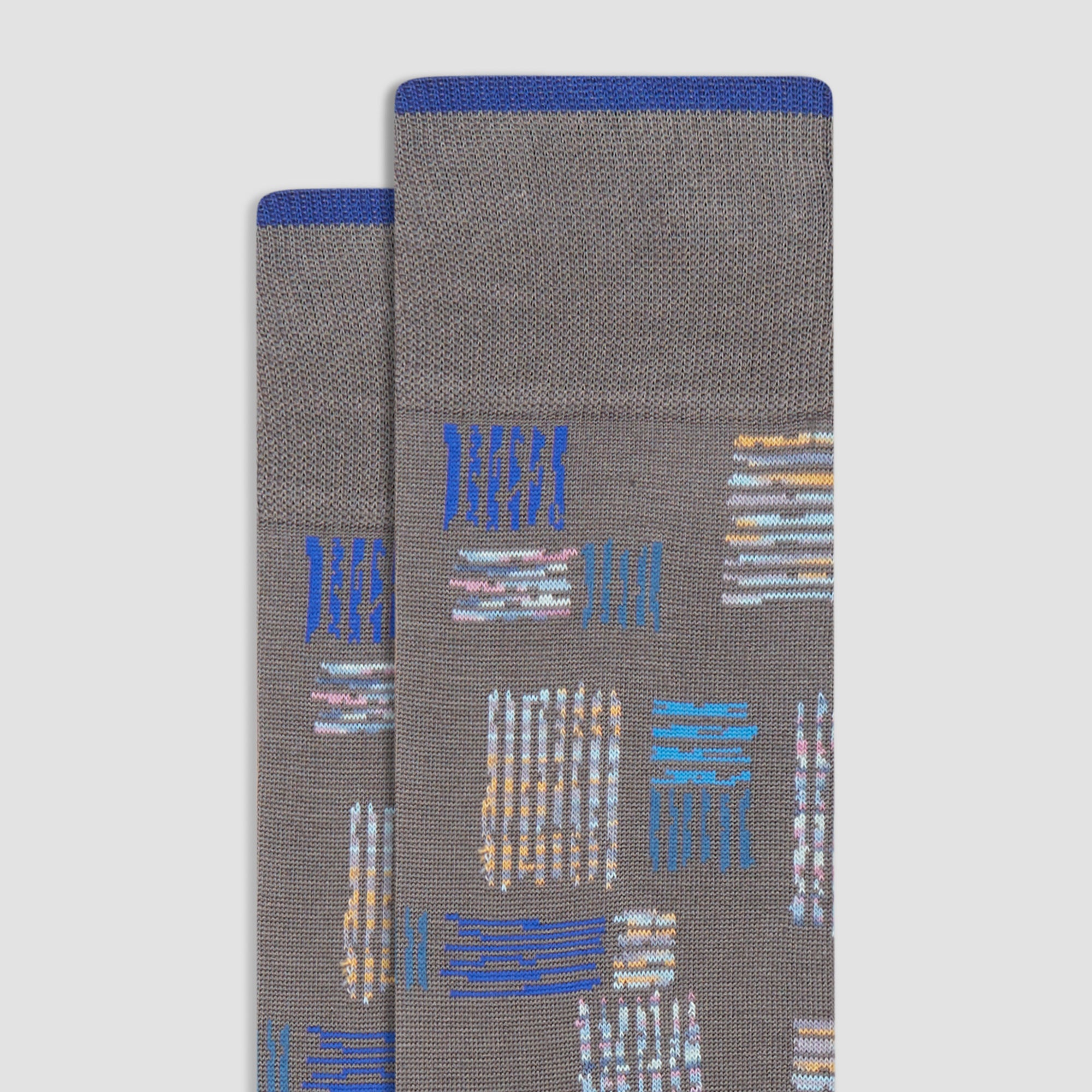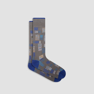 Abstract mid-calf socks in fine gauge mercerized cotton blend with rib knit cuff band, hand linked toe and reinforced heel seams. Made in Italy.