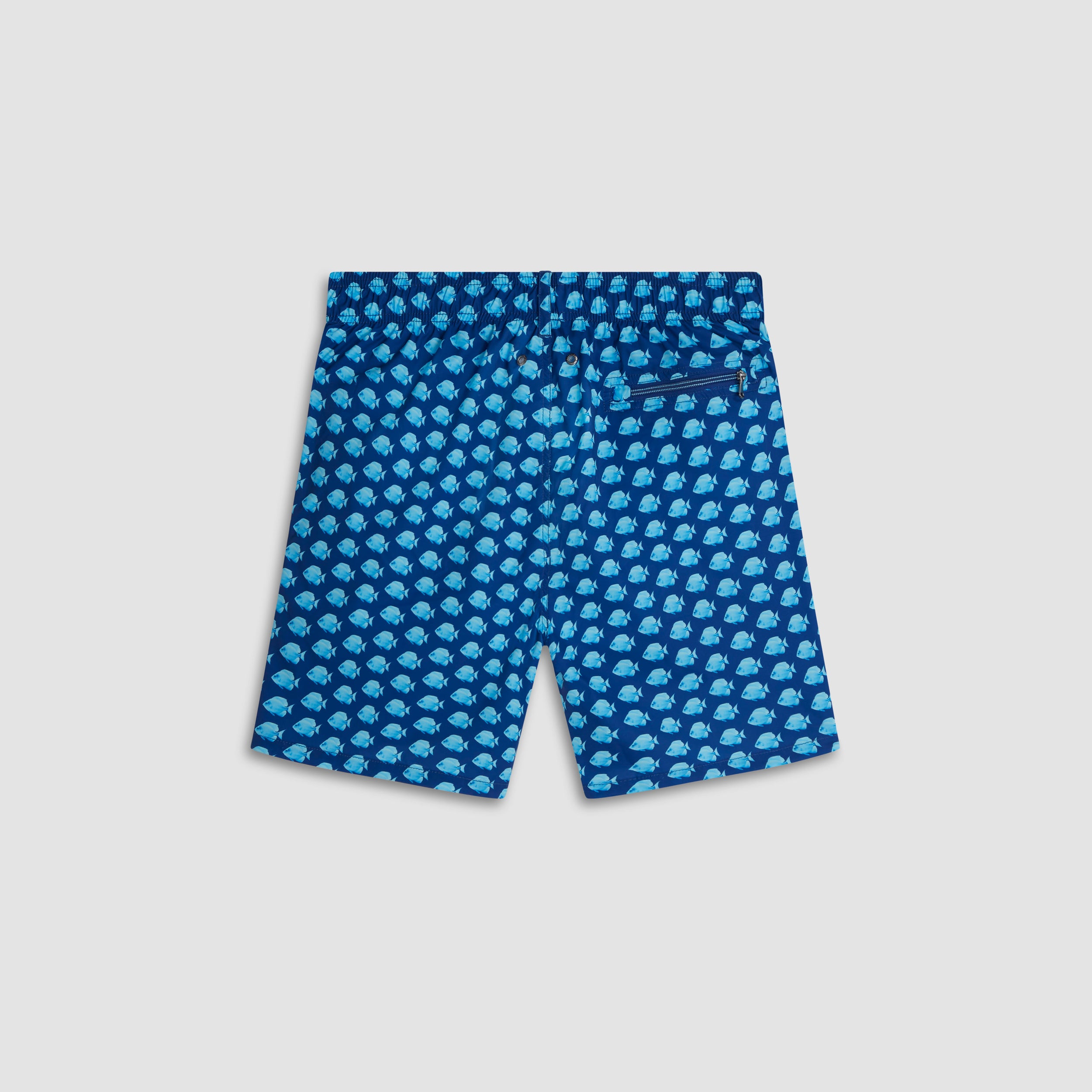 The Adrian swim trunks are crafted from premium comfort stretch polyester in a fish print and feature an elastic waist with adjustable drawstring, a breathable stretch mesh lining, drainage grommets, side pockets, a rear zippered pocket, UV protection and quick-dry technology. The sleek 17.5-inch out seam, offers the perfect balance between coverage and freedom of movement, making it an ideal choice for the beach or relaxing by the pool.