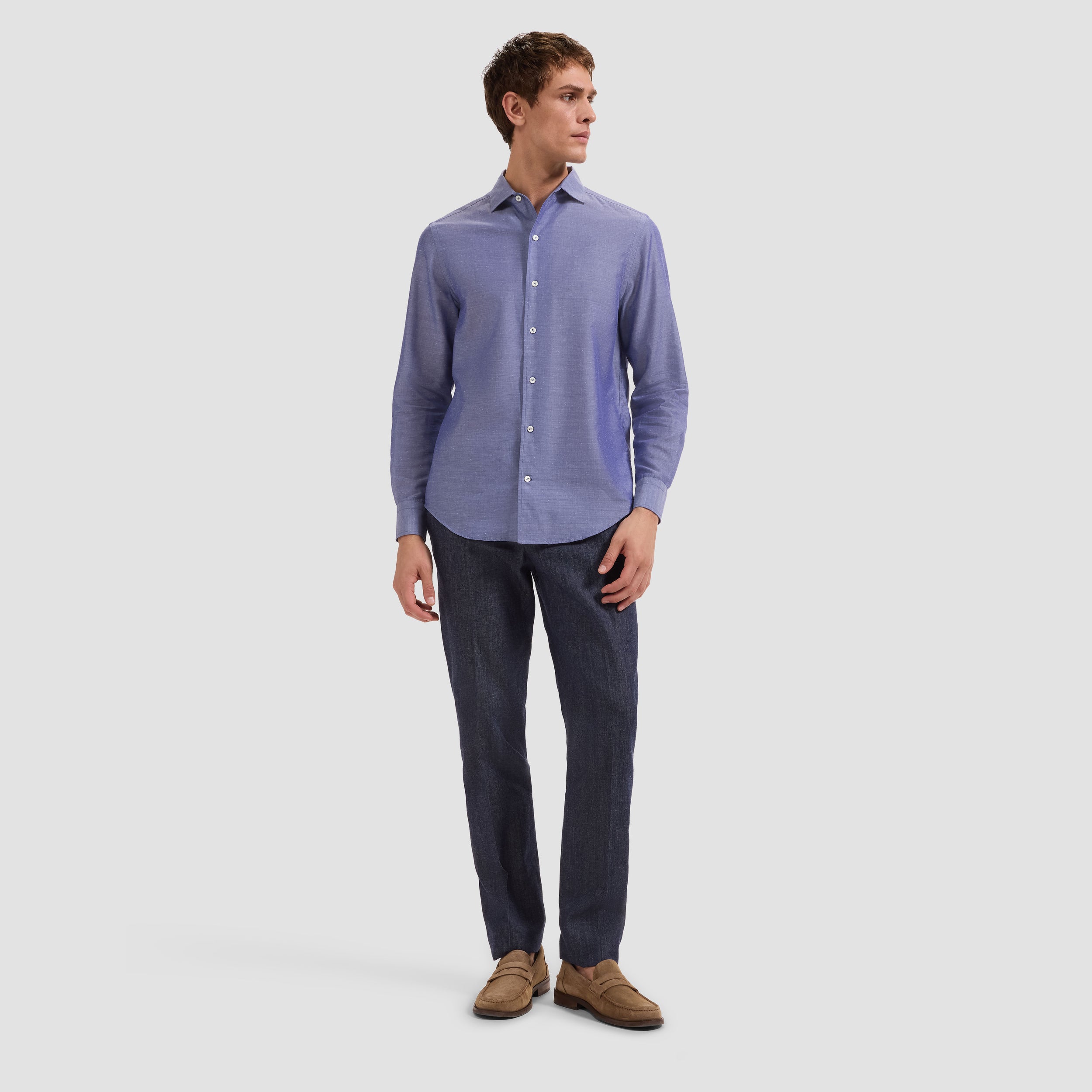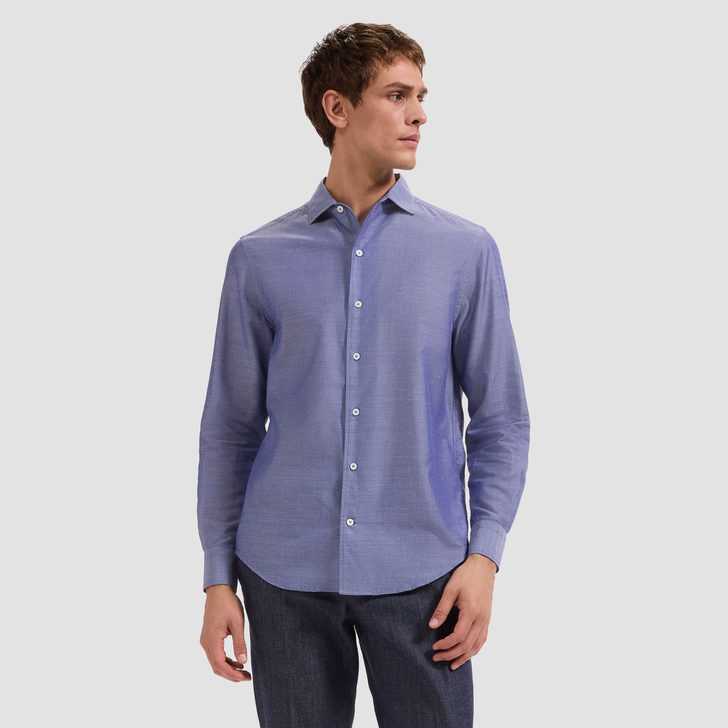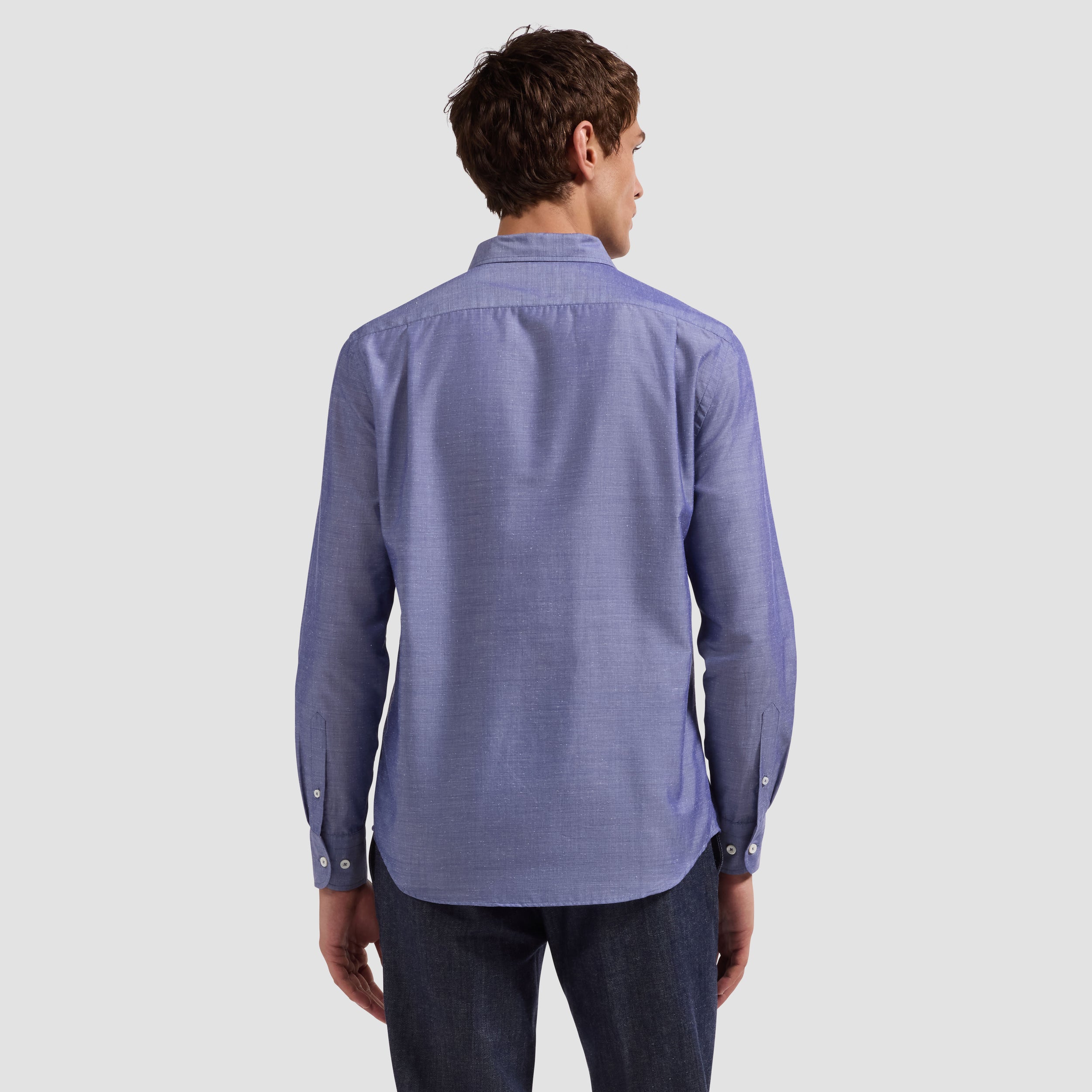 The Alvin long-sleeve shirt is crafted from a premium Italian lyocell-cotton-silk blend, offering a refined balance of softness, breathability, and subtle sheen. The chambray pattern adds understated texture, while the one-piece spread collar, mother-of-pearl buttons, and adjustable notched cuffs that also convert for cufflinks enhance its versatility. A sophisticated casual shirt that looks polished tucked or untucked.