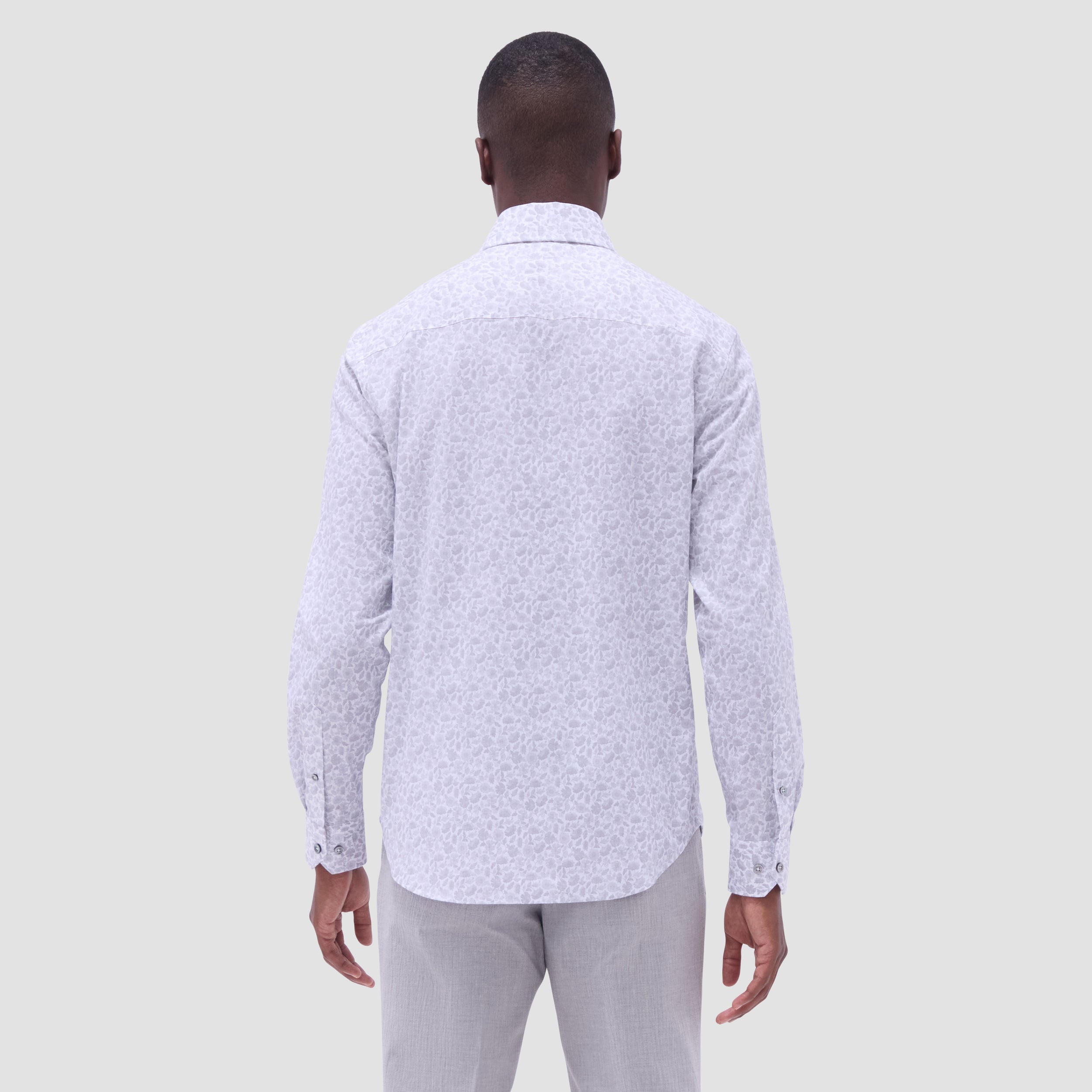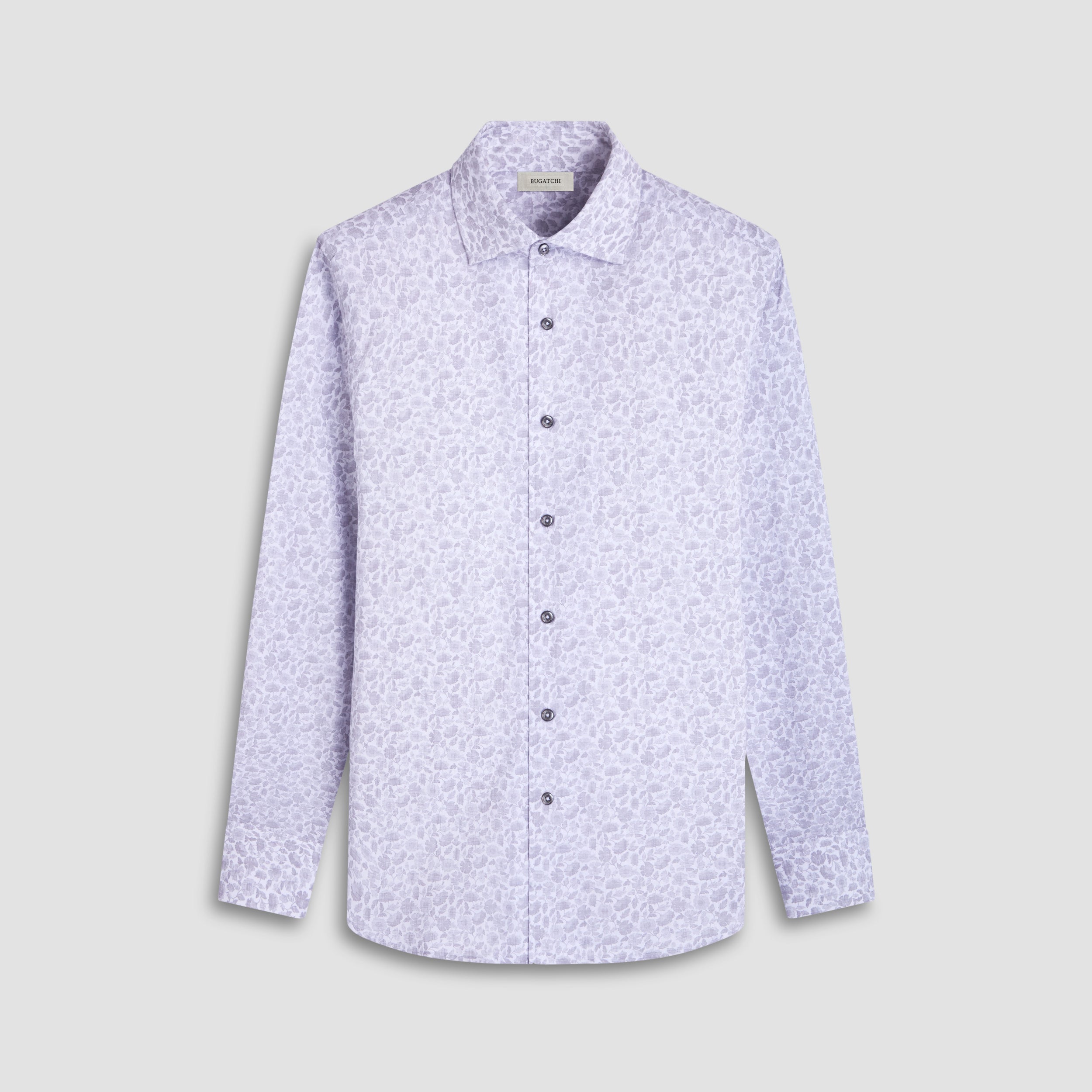 The Alvin long-sleeve shirt in floral print is crafted from 100% cotton fabric. Designed for versatility, it features a sleek, sophisticated one-piece spread collar, mother-of-pearl buttons, a curved hem that can be worn tucked or untucked, and notched cuffs adjustable for a custom fit-wear them snug or loose, or convert them for cufflinks. A refined choice for any occasion.