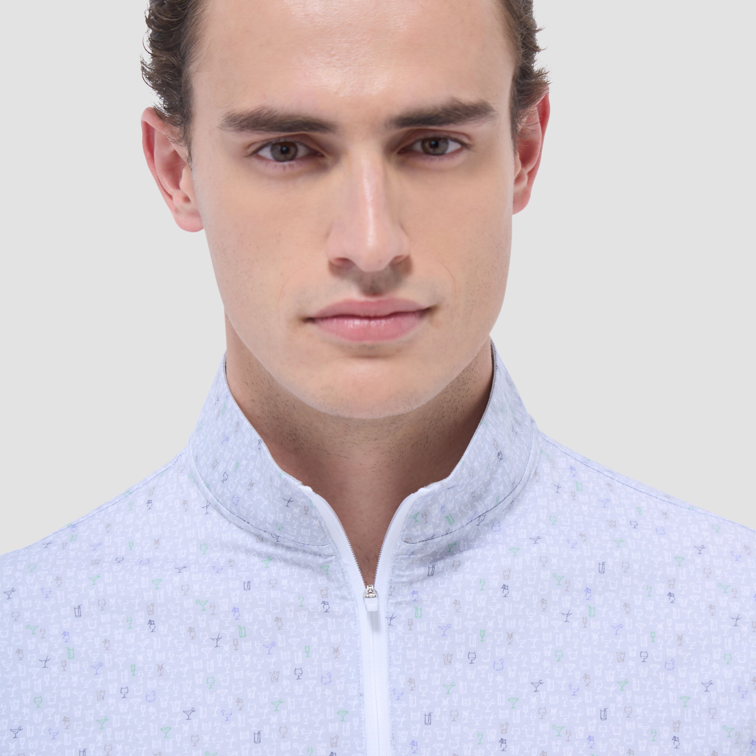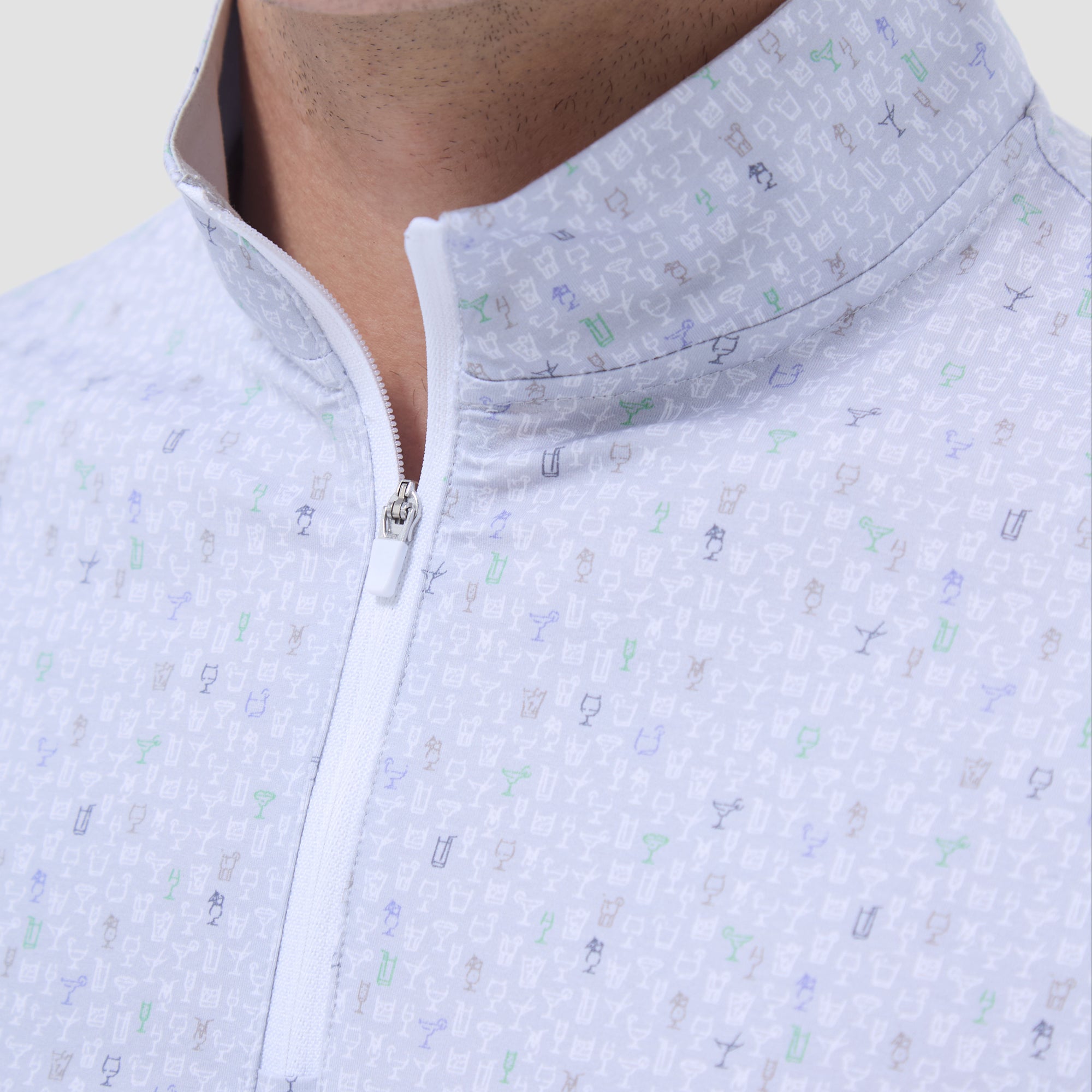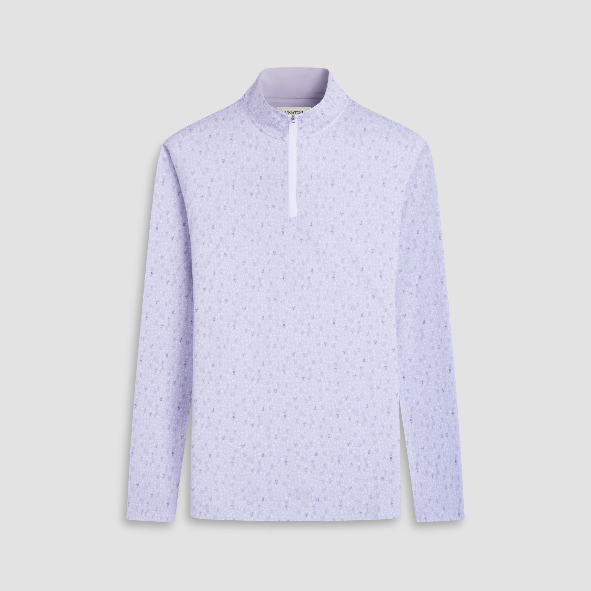 The Anthony OoohCotton long-sleeve pullover in cocktail print features a mock neck and a quarter-zipper closure. OoohCotton is a performance, double-mercerized, wrinkle-resistant, breathable, and easy-care cotton blend with 8-way stretch, quick-dry, and thermal comfort properties.