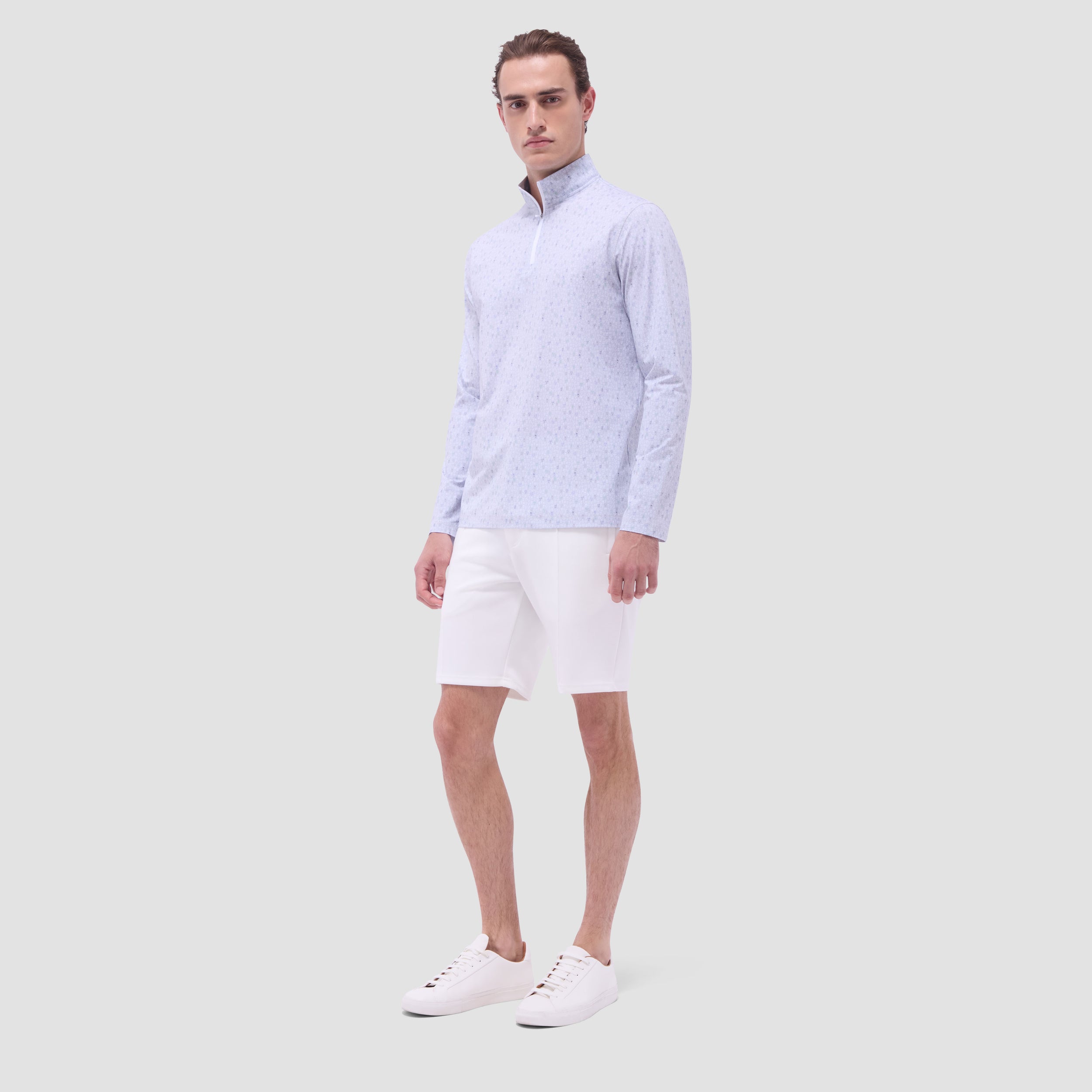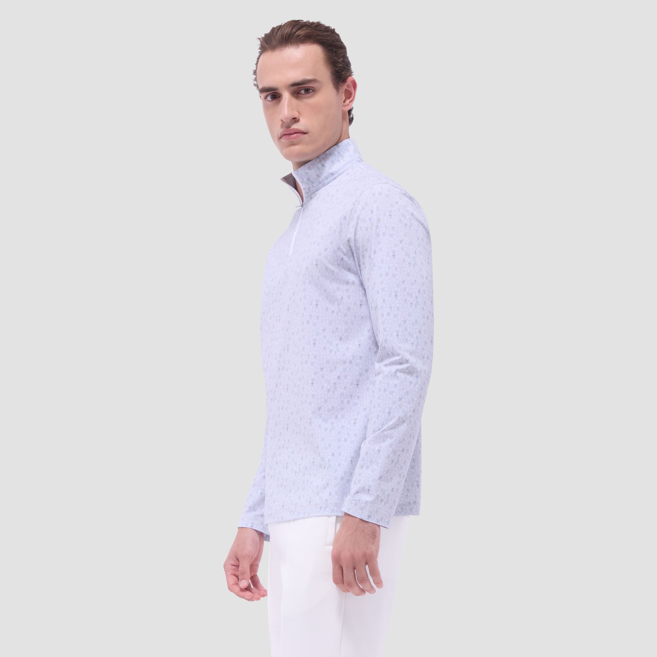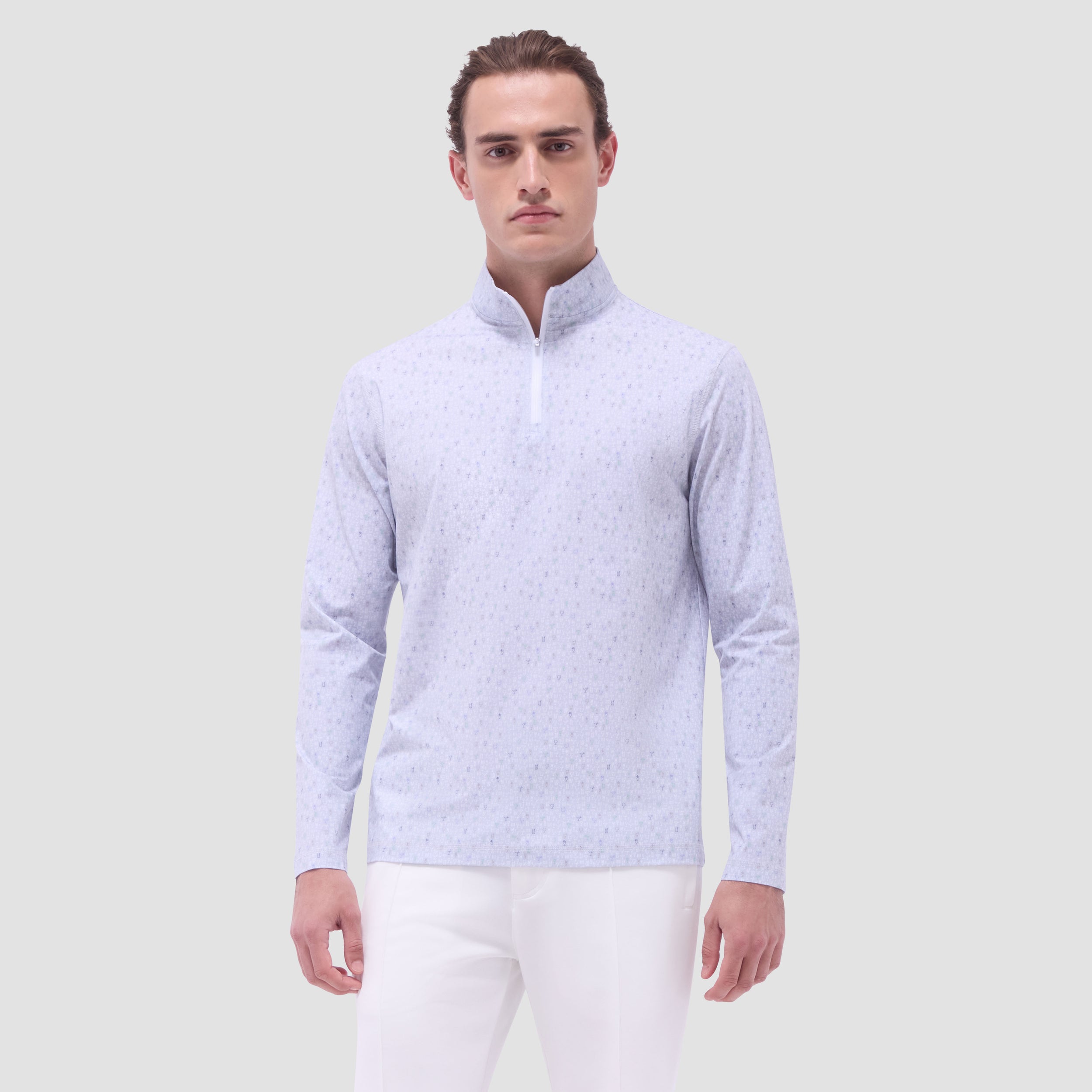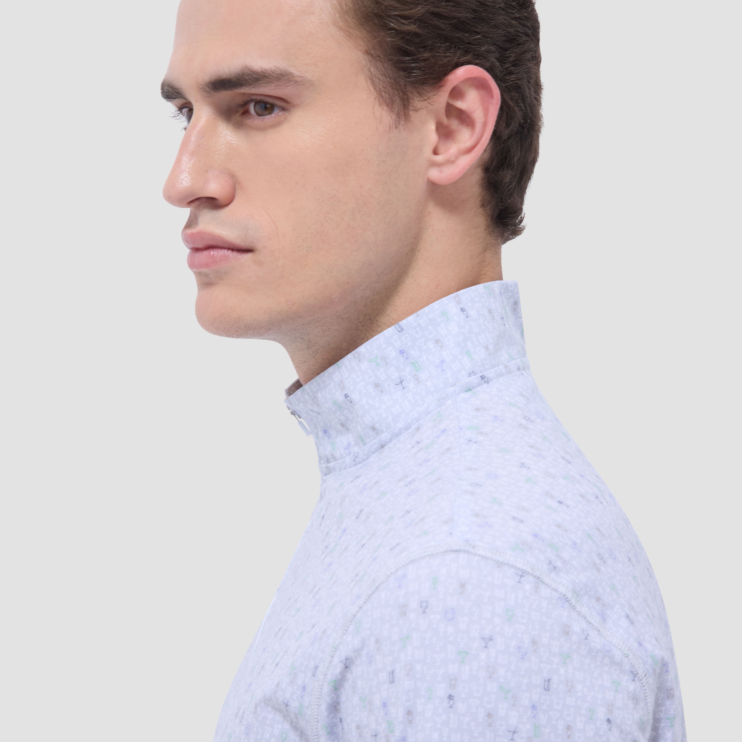 The Anthony OoohCotton long-sleeve pullover in cocktail print features a mock neck and a quarter-zipper closure. OoohCotton is a performance, double-mercerized, wrinkle-resistant, breathable, and easy-care cotton blend with 8-way stretch, quick-dry, and thermal comfort properties.