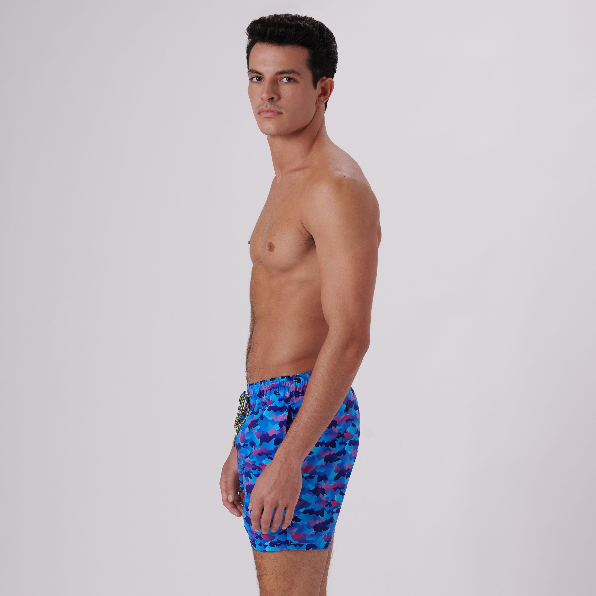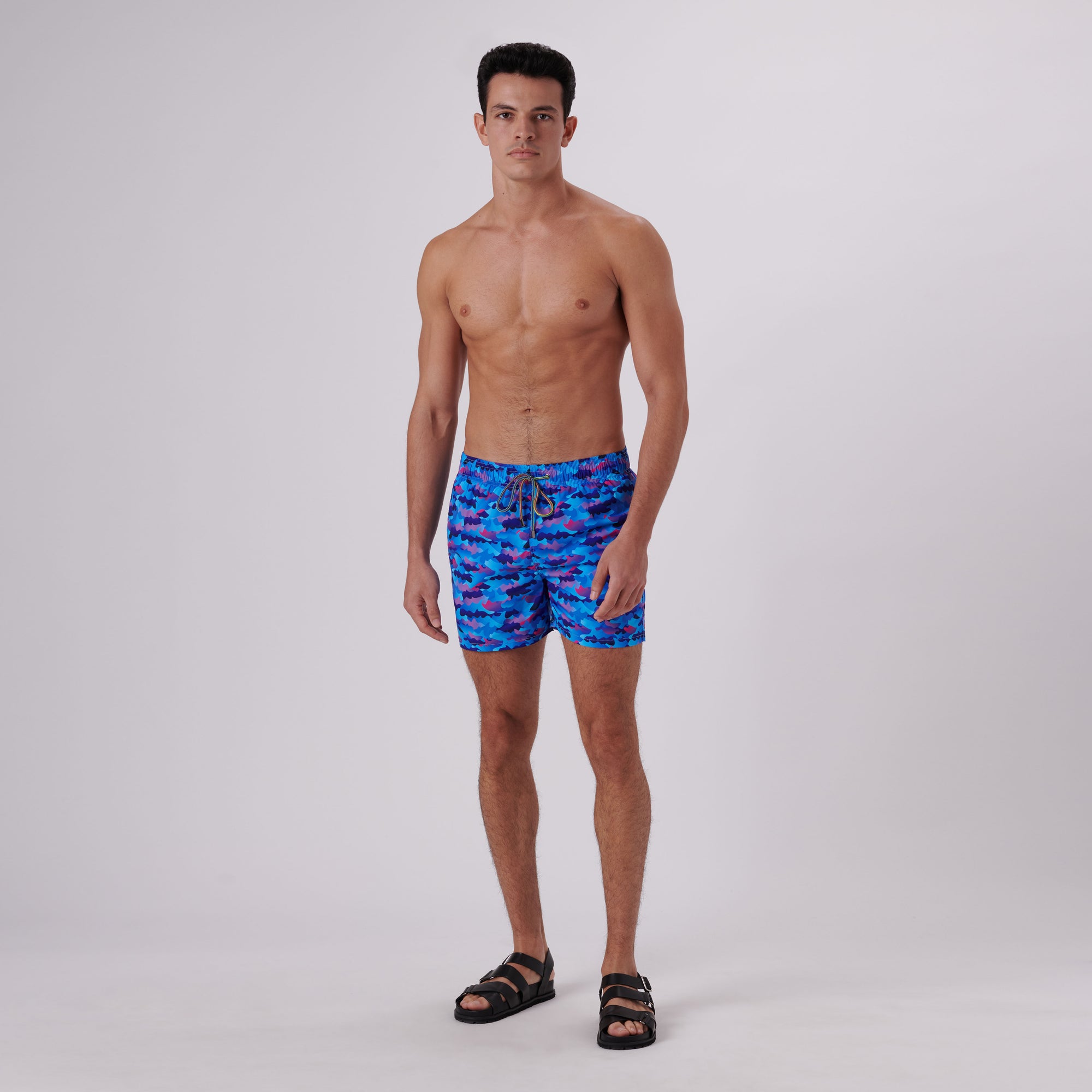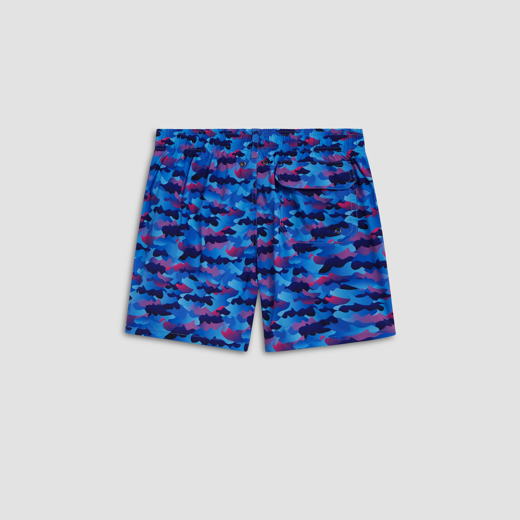 Archer camouflage swim trunks in lightweight, easy care, quick-dry, comfort stretch polyester with resistance to UV rays, chlorine, salt and sunscreen feature an elasticized waistband, drawstring closure, breathable stretch mesh lining, drainage grommets, side pockets and back flap pocket.