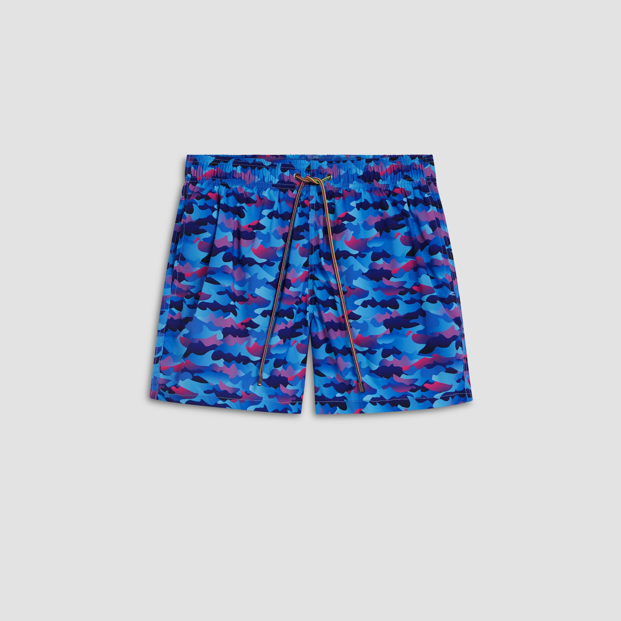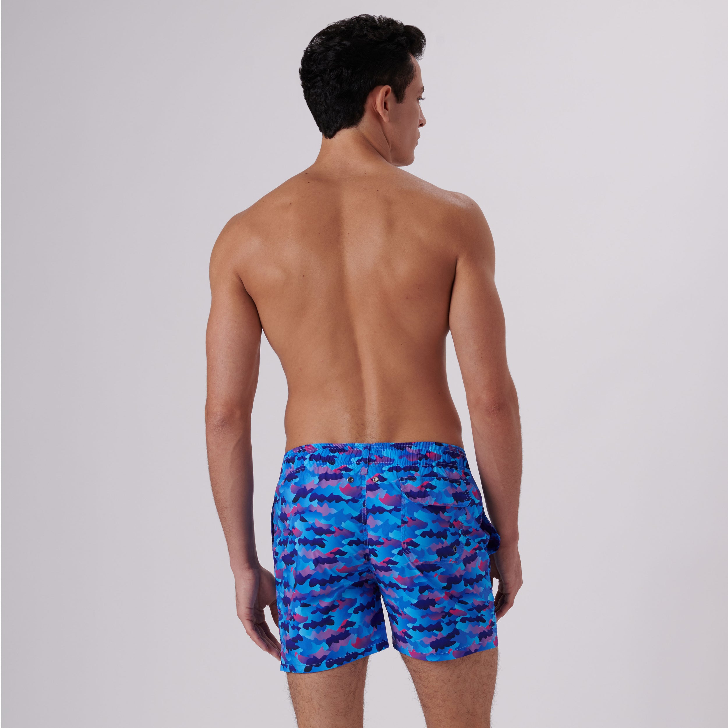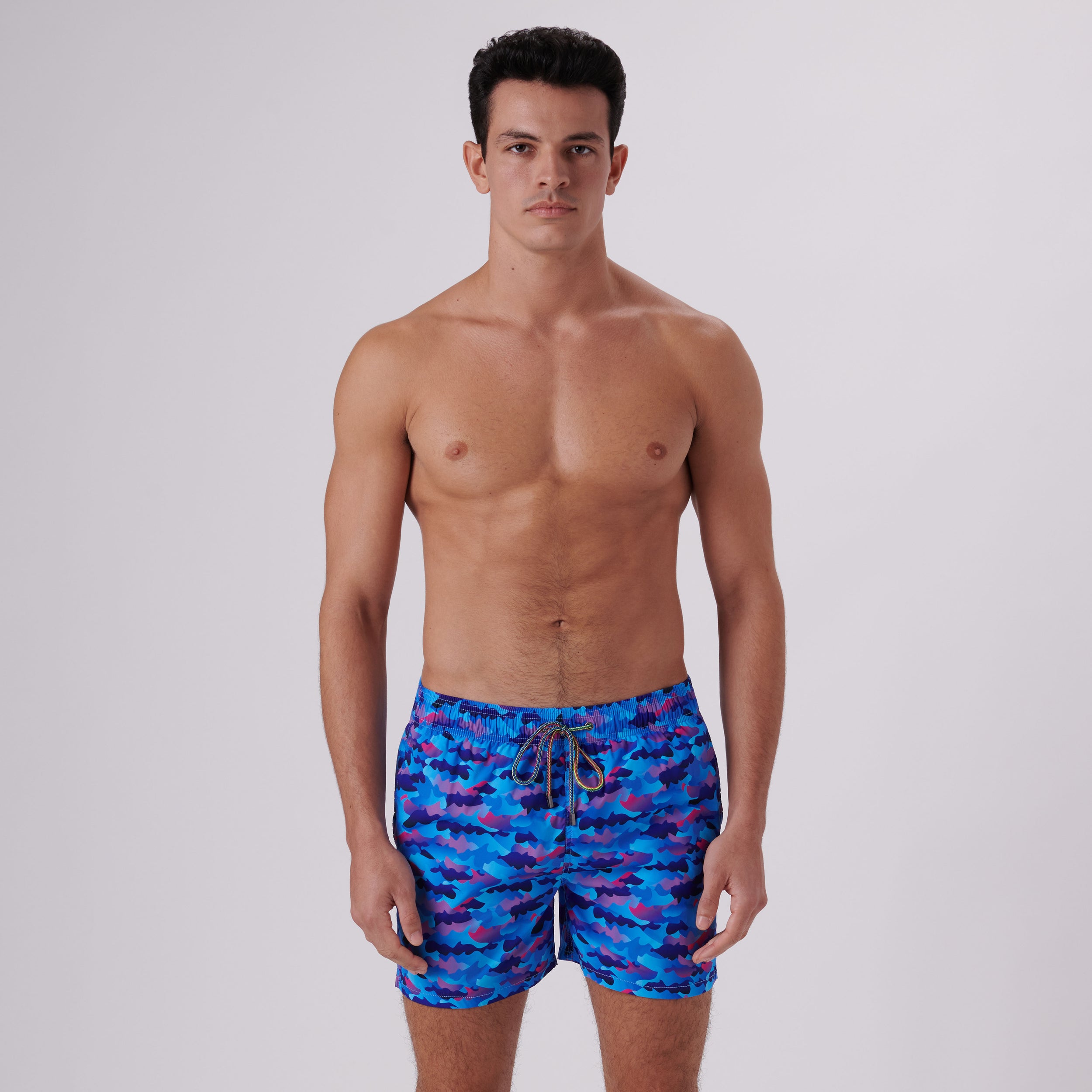 Archer camouflage swim trunks in lightweight, easy care, quick-dry, comfort stretch polyester with resistance to UV rays, chlorine, salt and sunscreen feature an elasticized waistband, drawstring closure, breathable stretch mesh lining, drainage grommets, side pockets and back flap pocket.