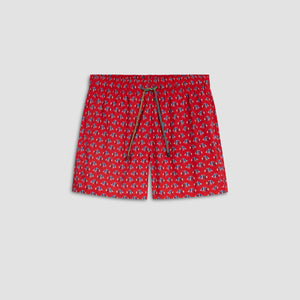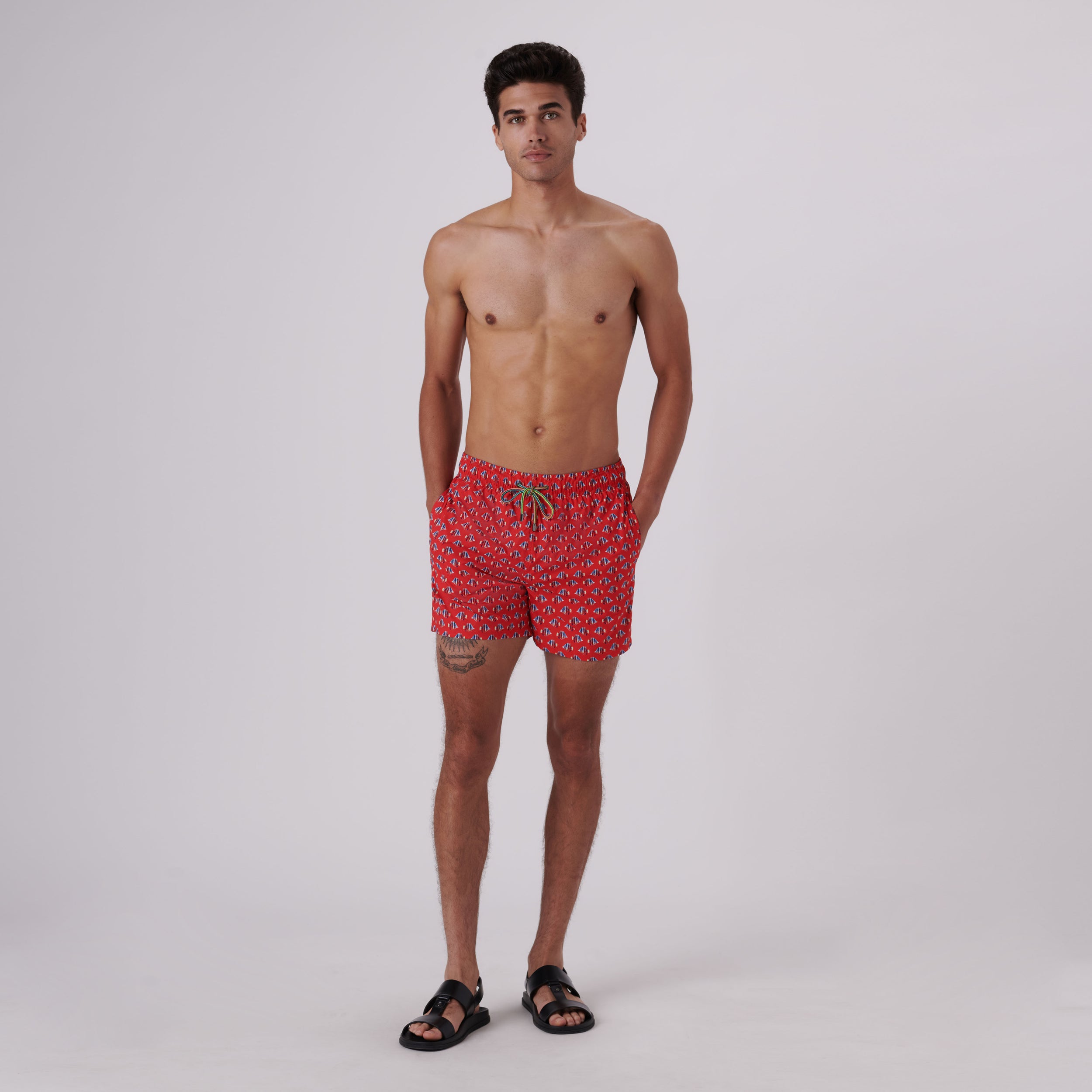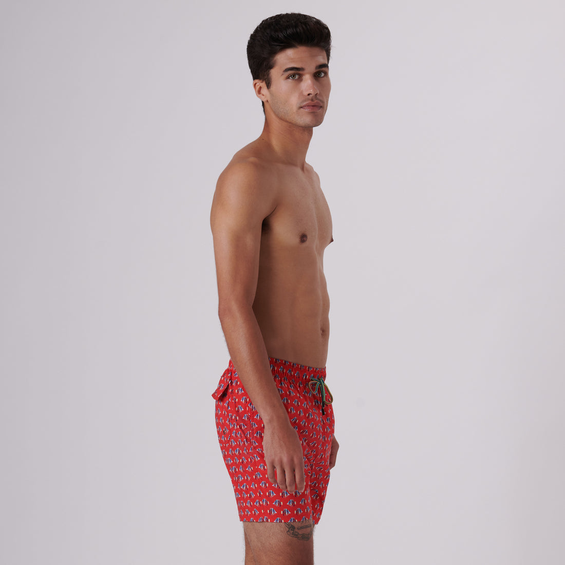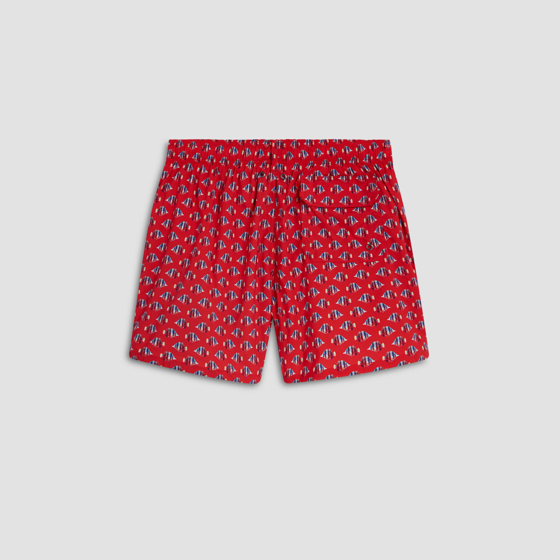Archer striped fish swim trunks in lightweight, easy care, quick-dry, comfort stretch polyester with resistance to UV rays, chlorine, salt and sunscreen feature an elasticized waistband, drawstring closure, breathable stretch mesh lining, drainage grommets, side pockets and back flap pocket.