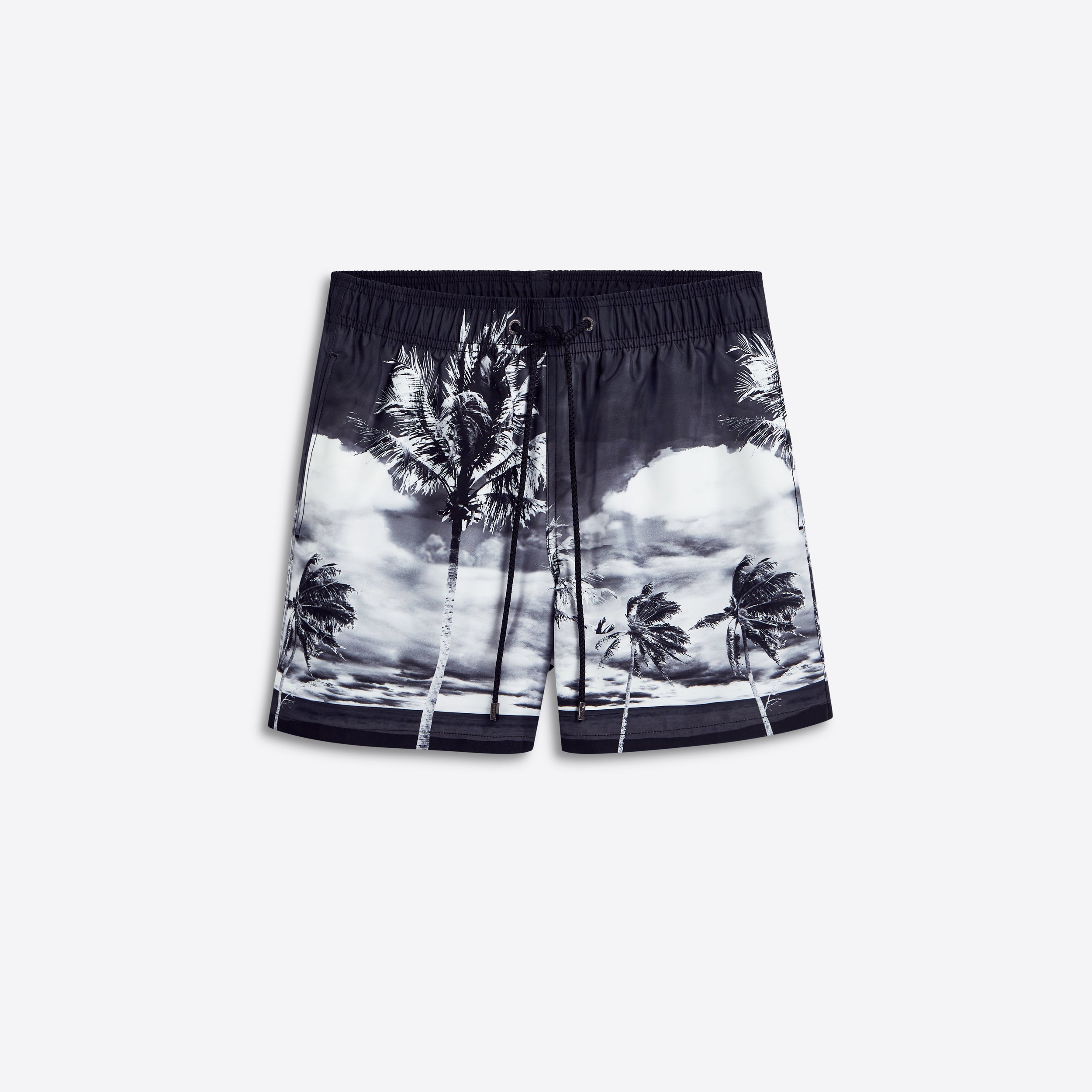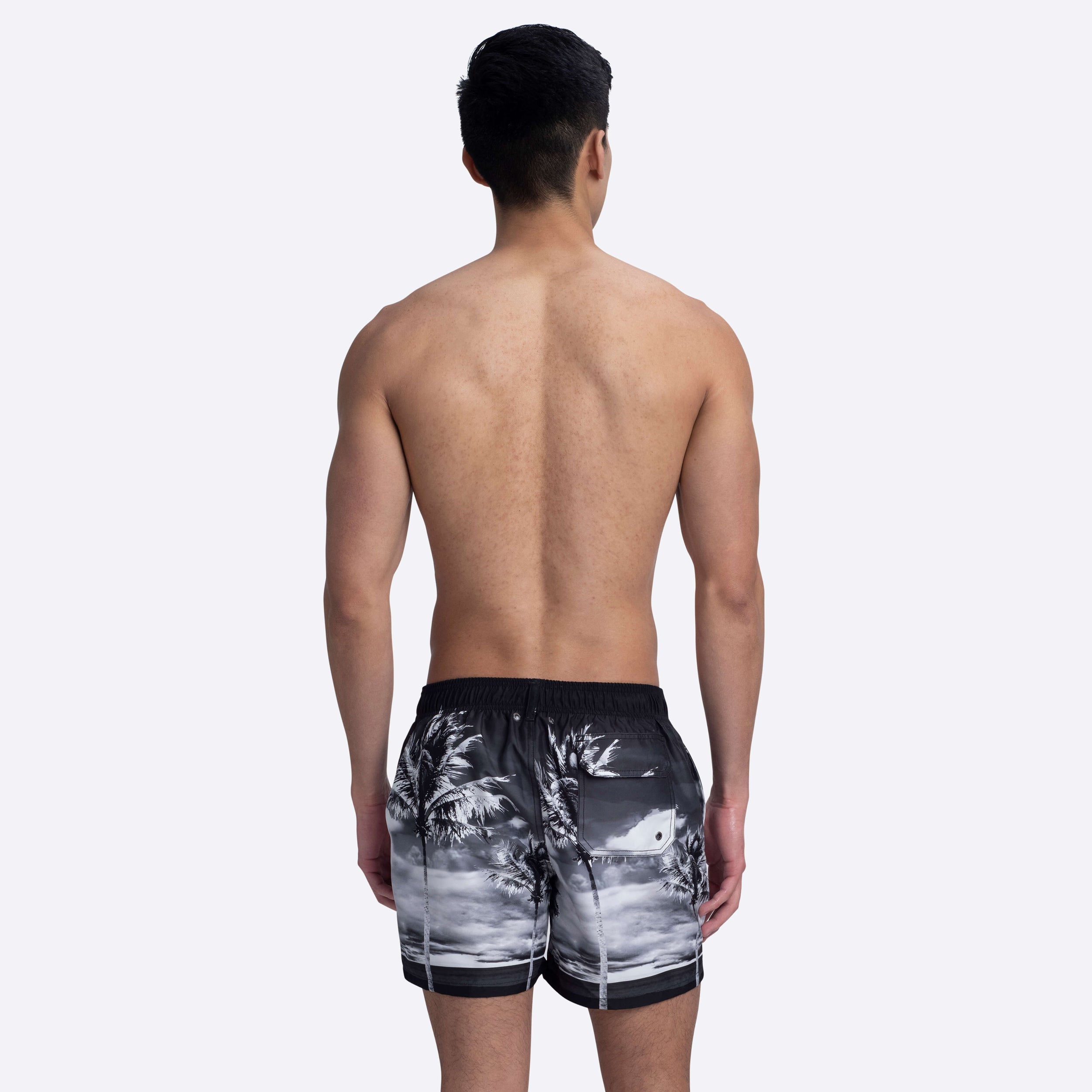 ARCHER monochrome tropical storm print swim trunks in lightweight, quick dry fabric with drawstring elasticized waistband, breathable mesh lining and back patch flap pocket.