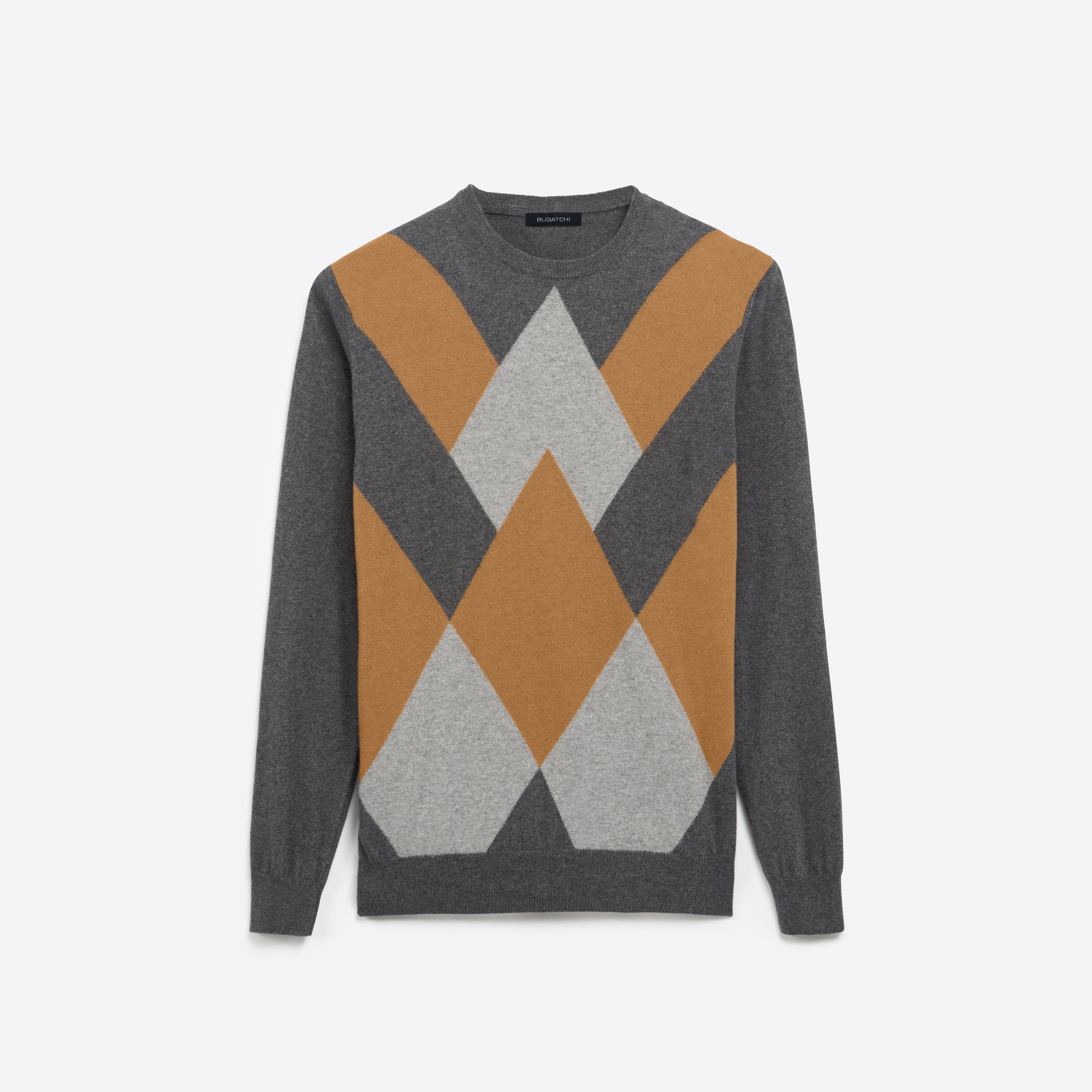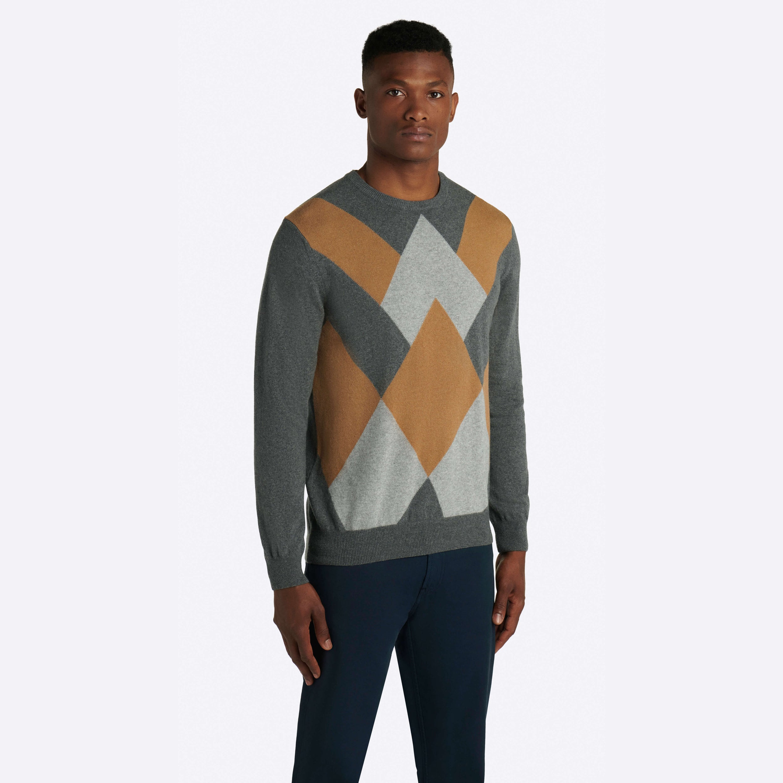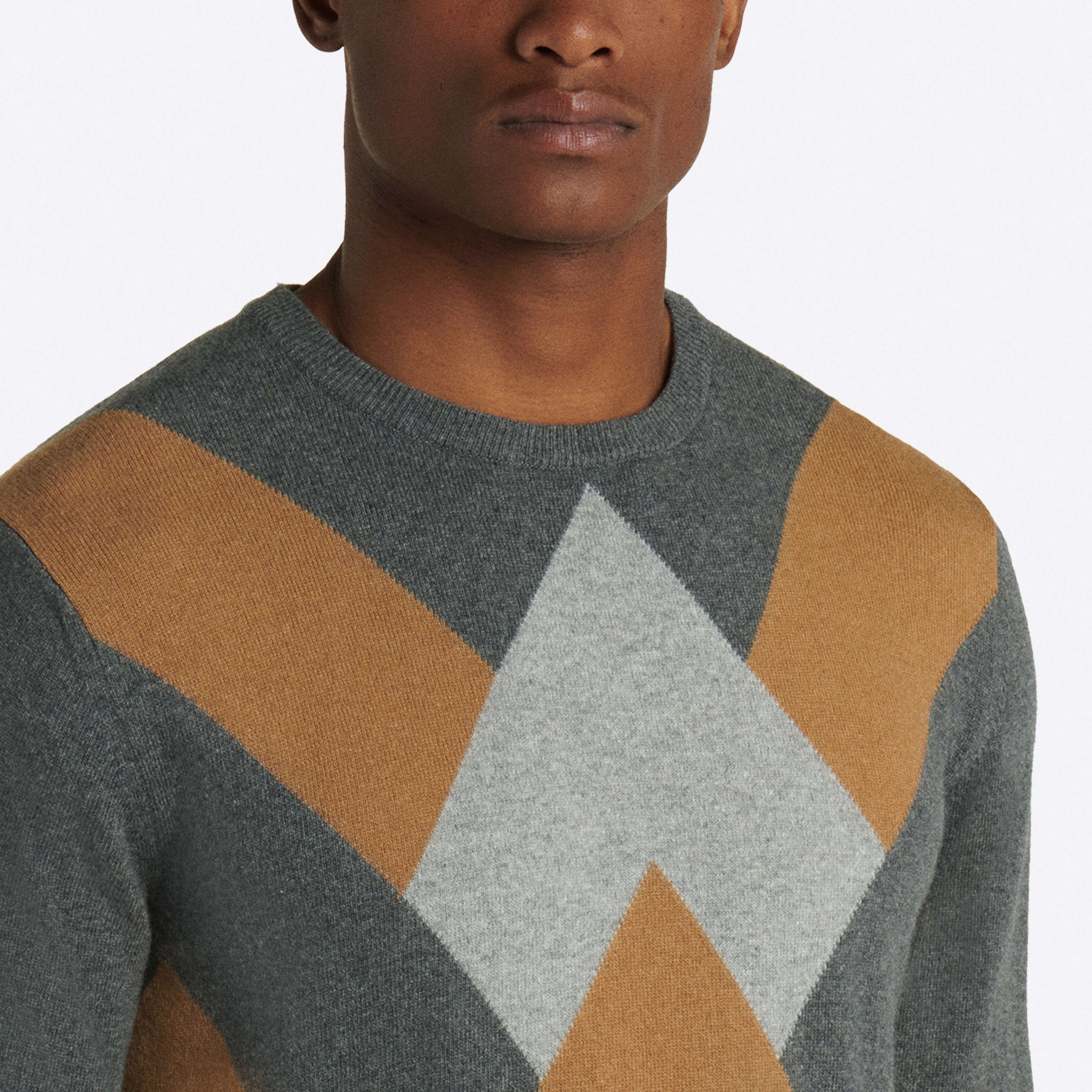 Argyle long sleeve crew neck sweater in Merino wool blend with solid rib knit collar, cuffs and waistband.