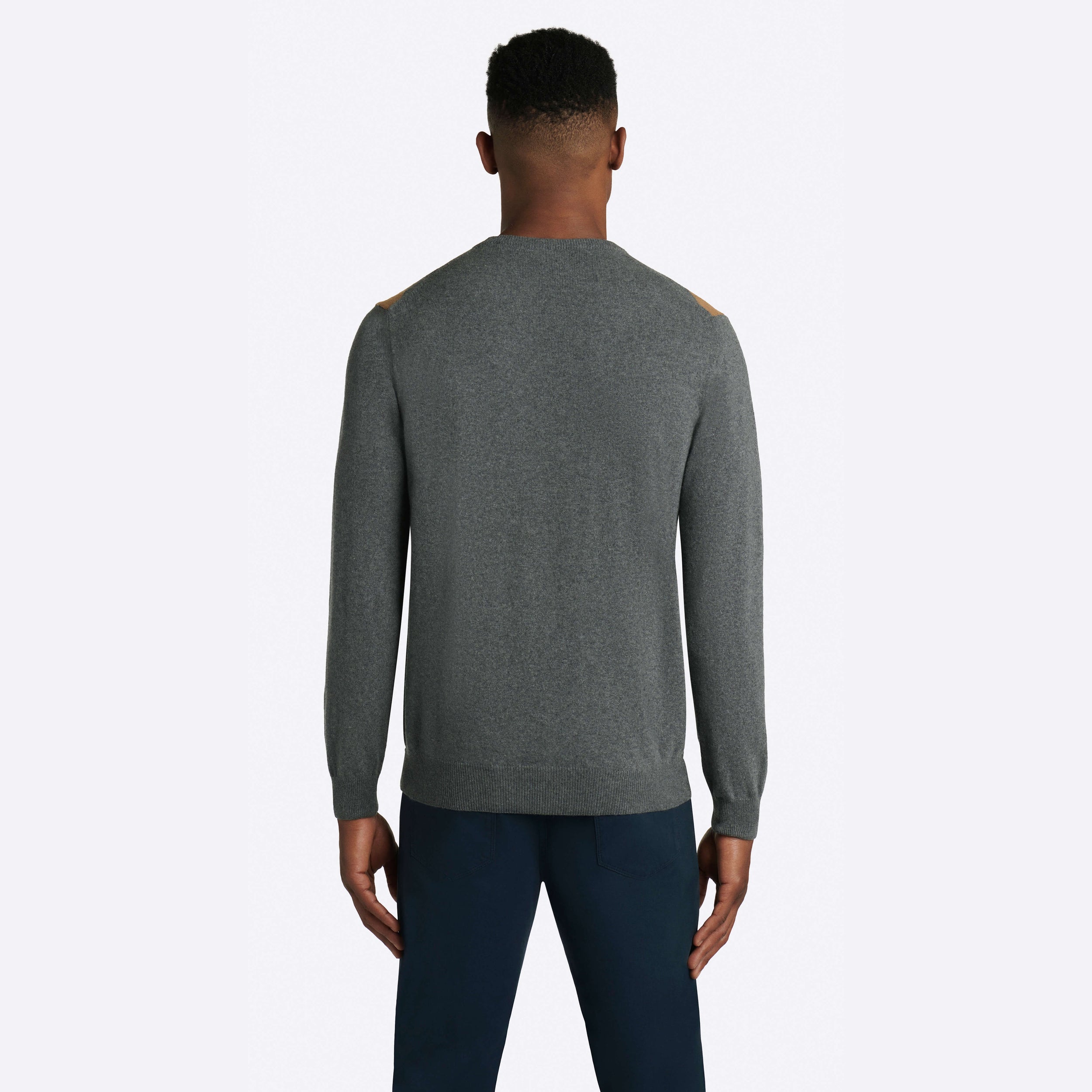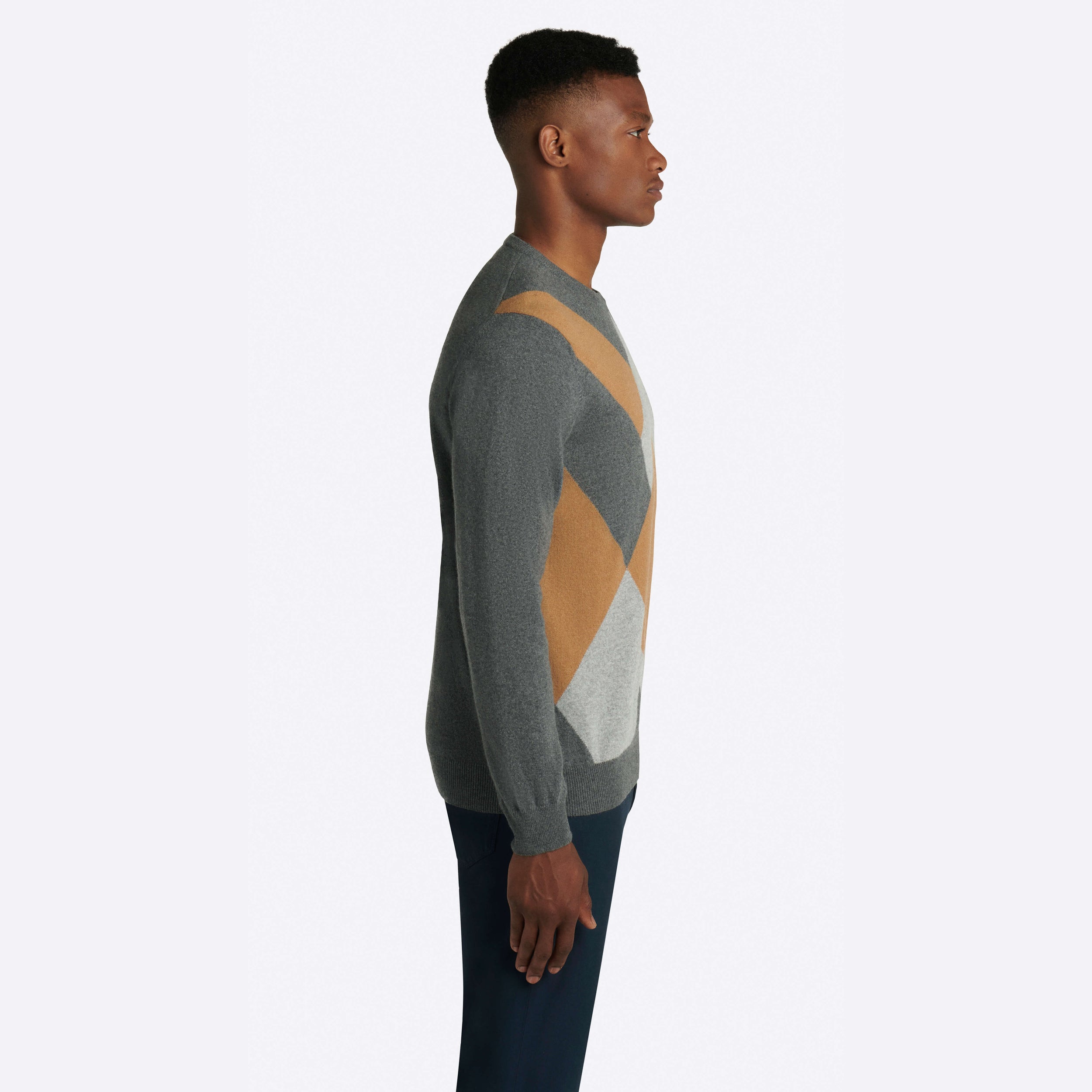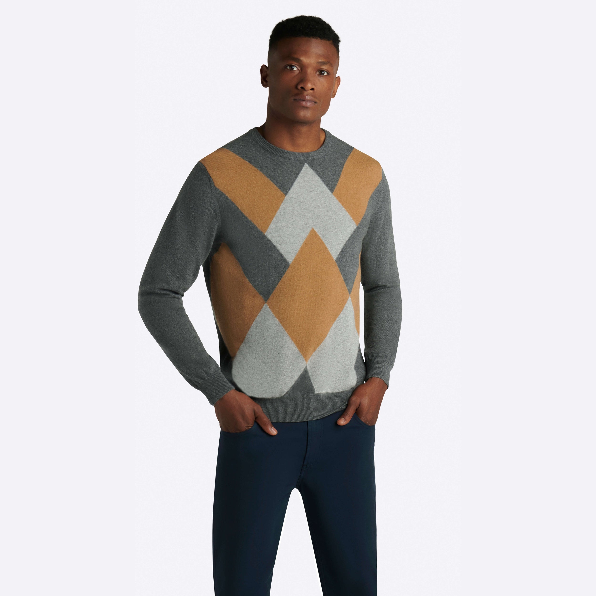 Argyle long sleeve crew neck sweater in Merino wool blend with solid rib knit collar, cuffs and waistband.