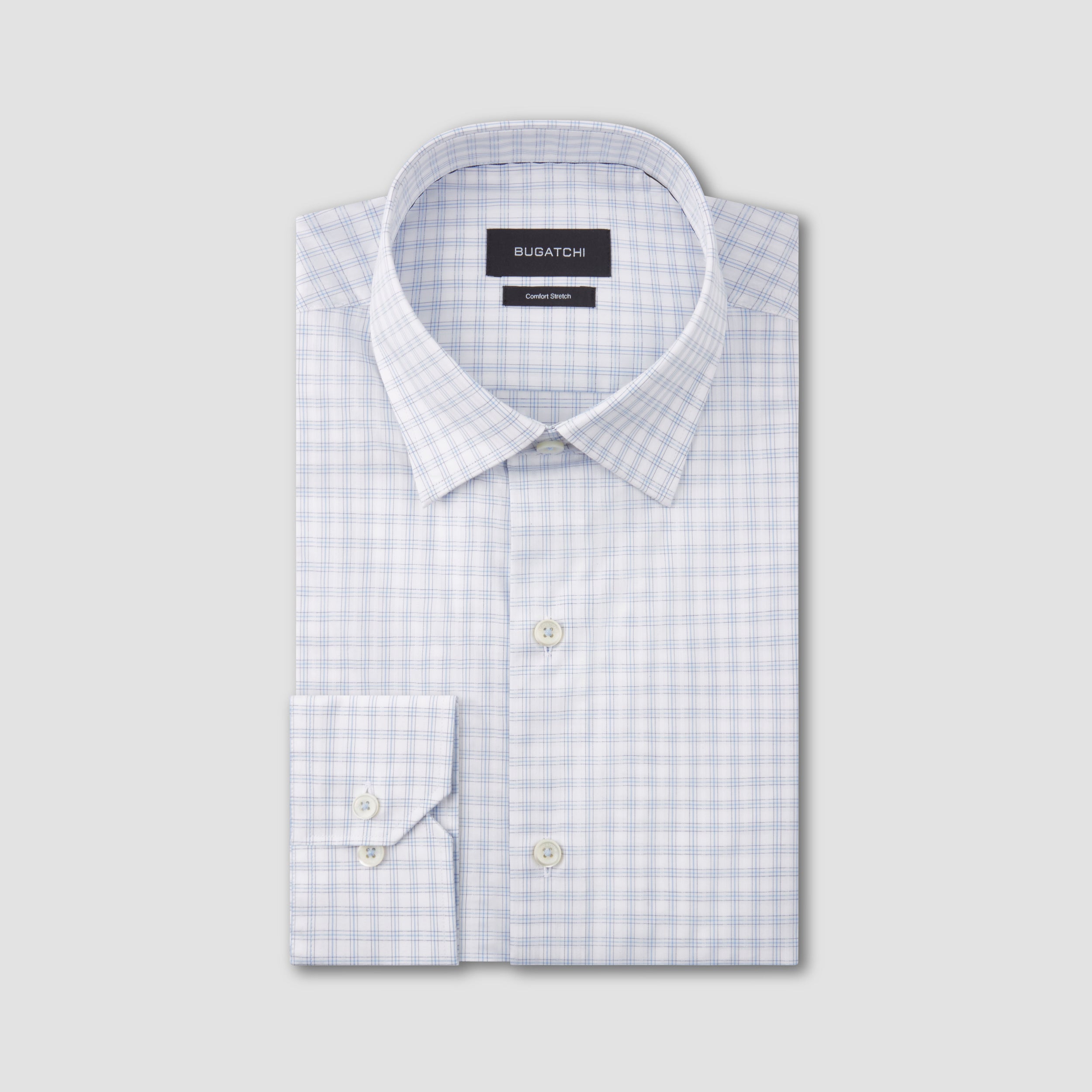 Arthur small check long-sleeved dress shirt in comfort stretch cotton with point collar, French placket, adjustable notched cuffs, genuine shell buttons and a curved hemline.