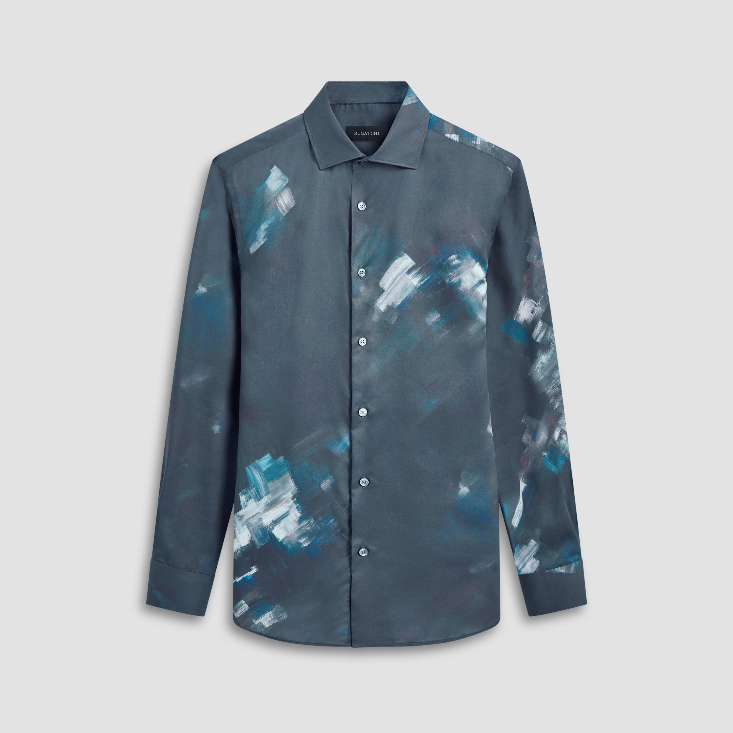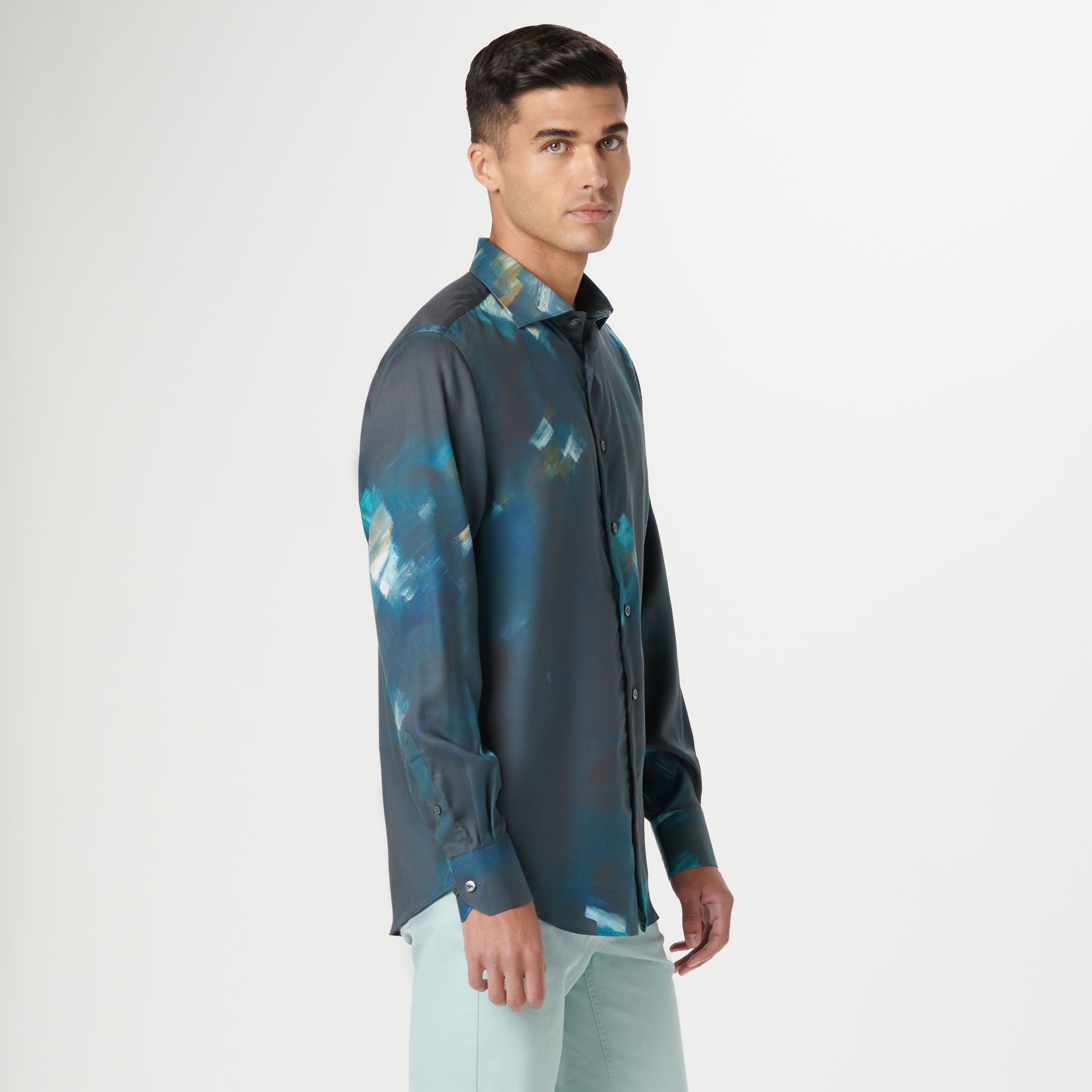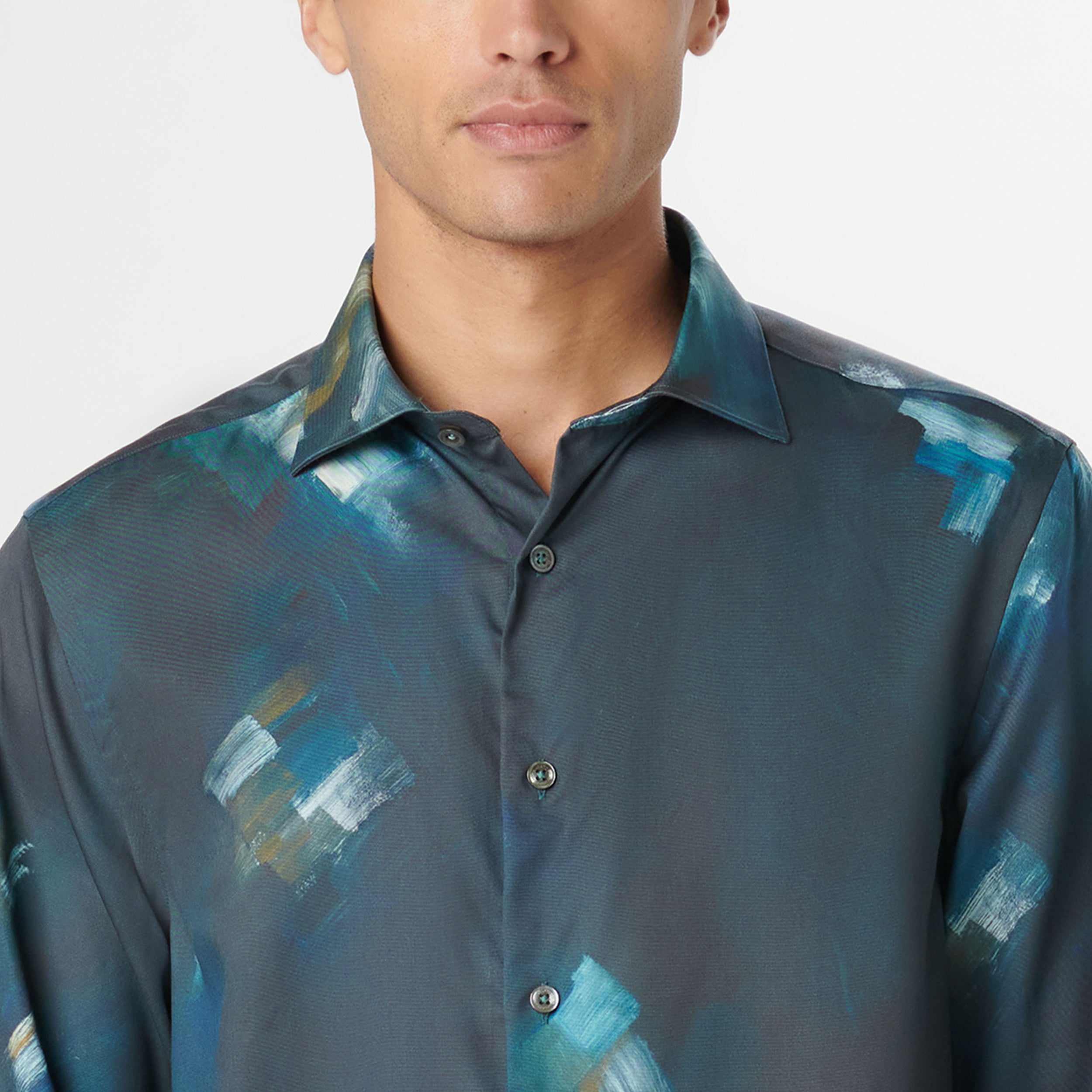 The Axel long-sleeved shirt is crafted from 100% sustainable lyocell and features an abstract print, a spread collar, adjustable notched cuffs, and a curved hem.