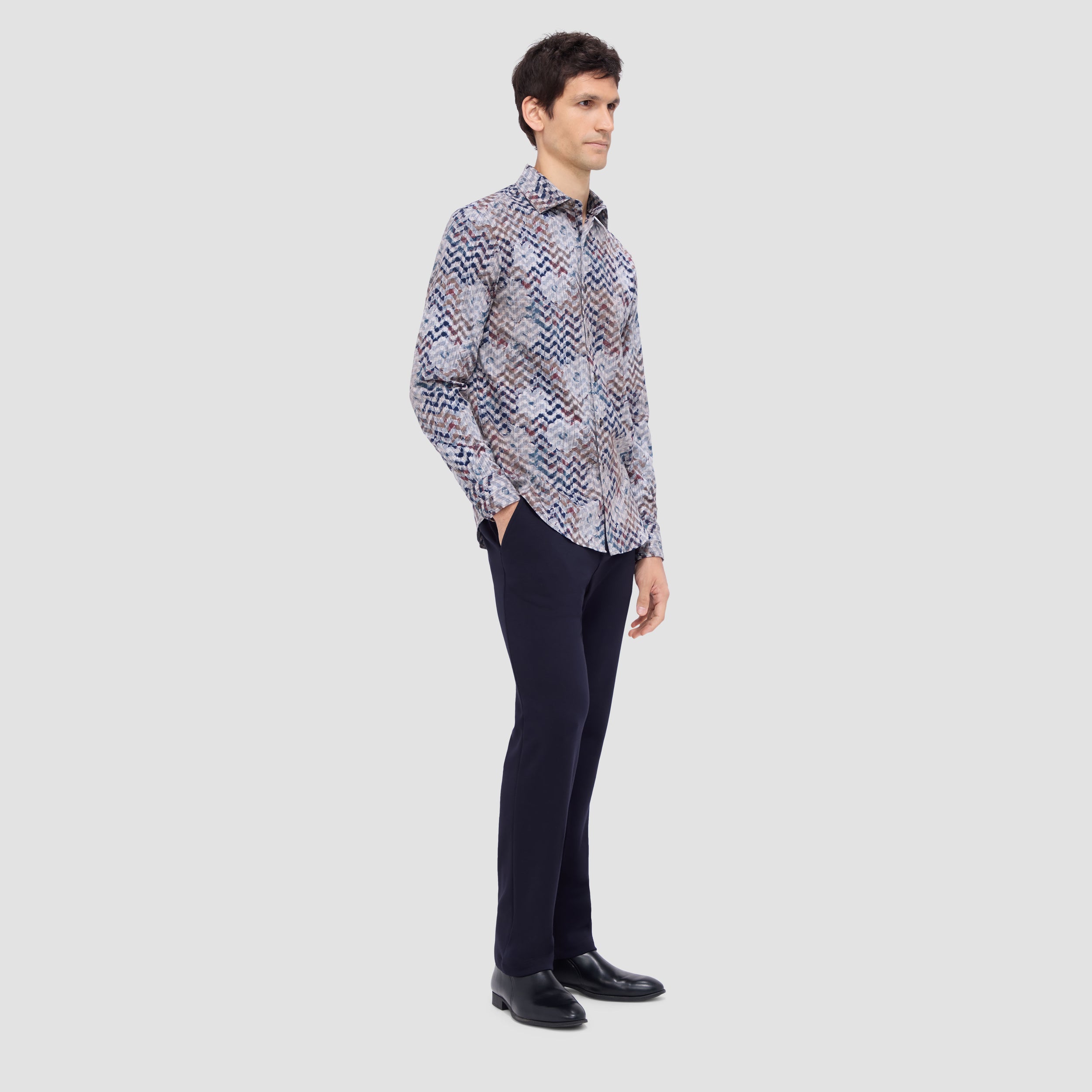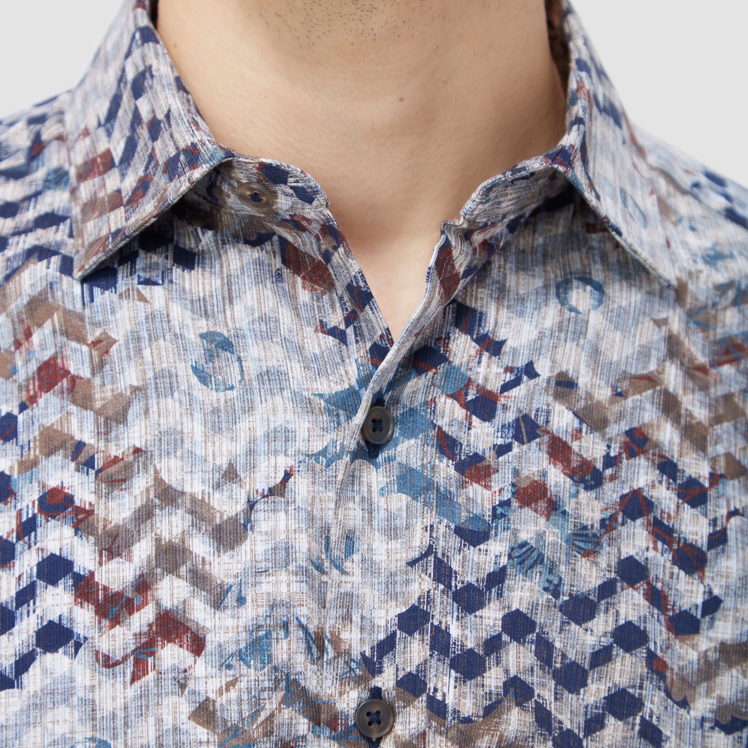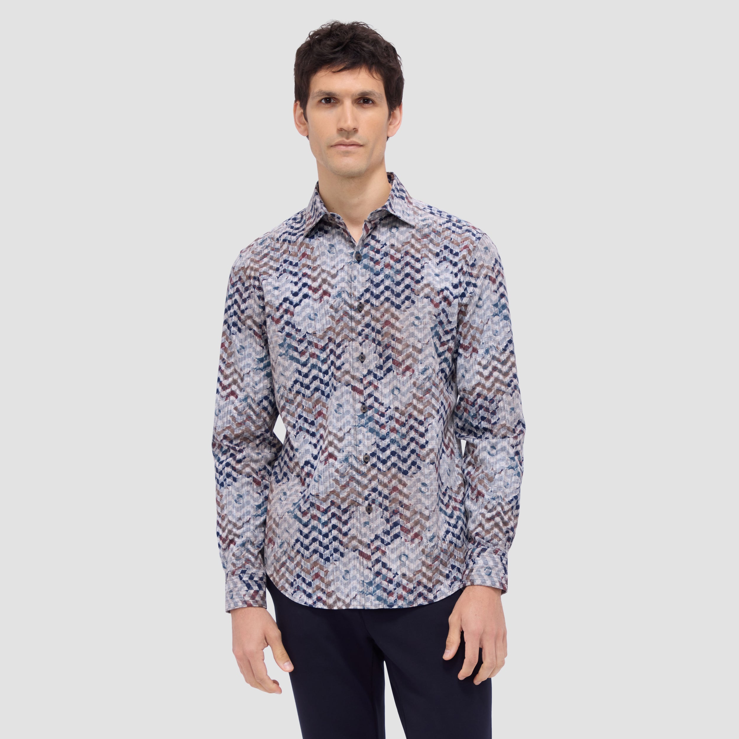 The Axel shirt in COMFORT STRETCH cotton is a contemporary and versatile shirt with optimal comfort and freedom of movement properties. Its timeless and sleek silhouette features long sleeves, a spread collar, adjustable notched cuffs, a curved hem, and an floral chevron print. Wear it tucked or untucked with chinos or trousers for a smart-casual vibe, or with jeans for a relaxed look.