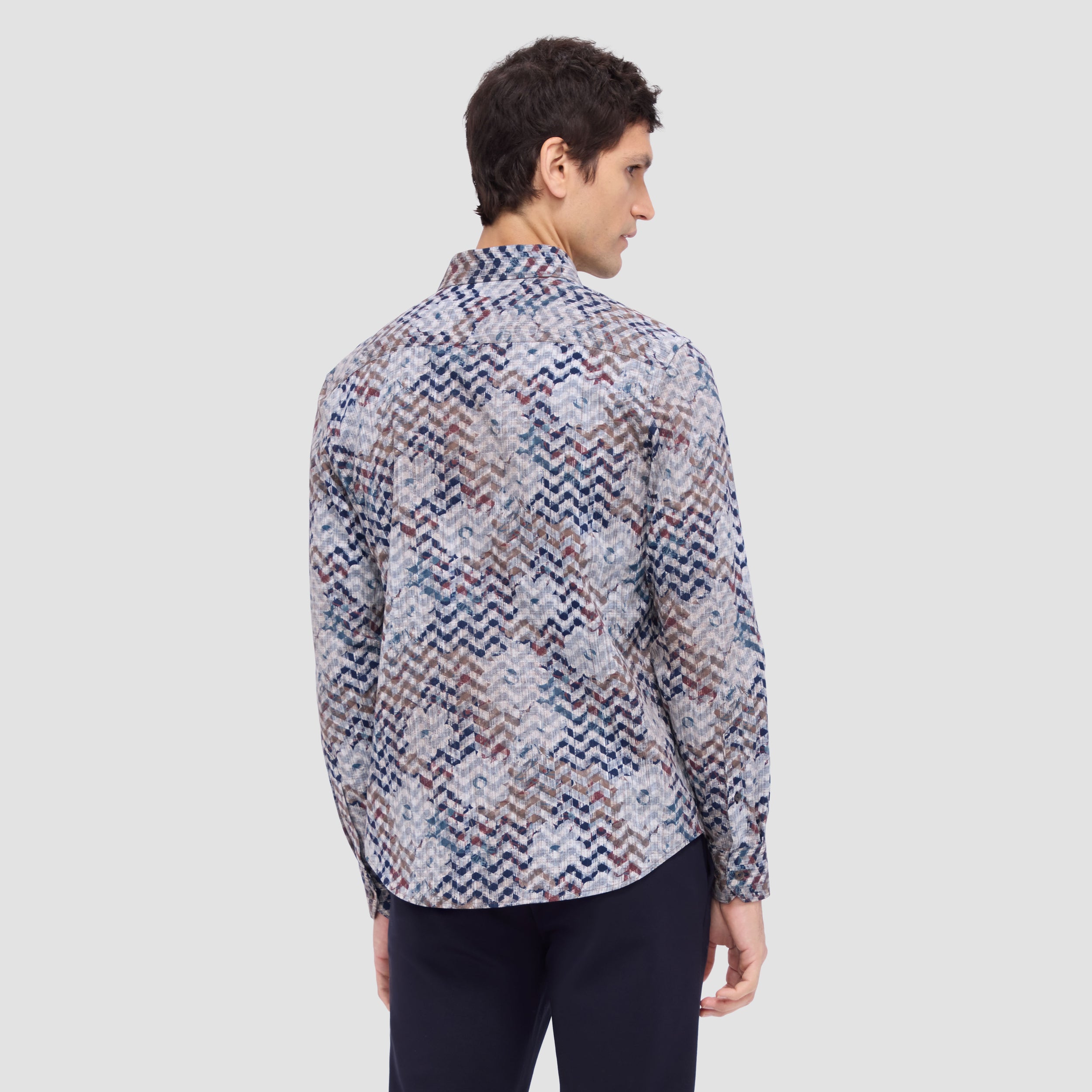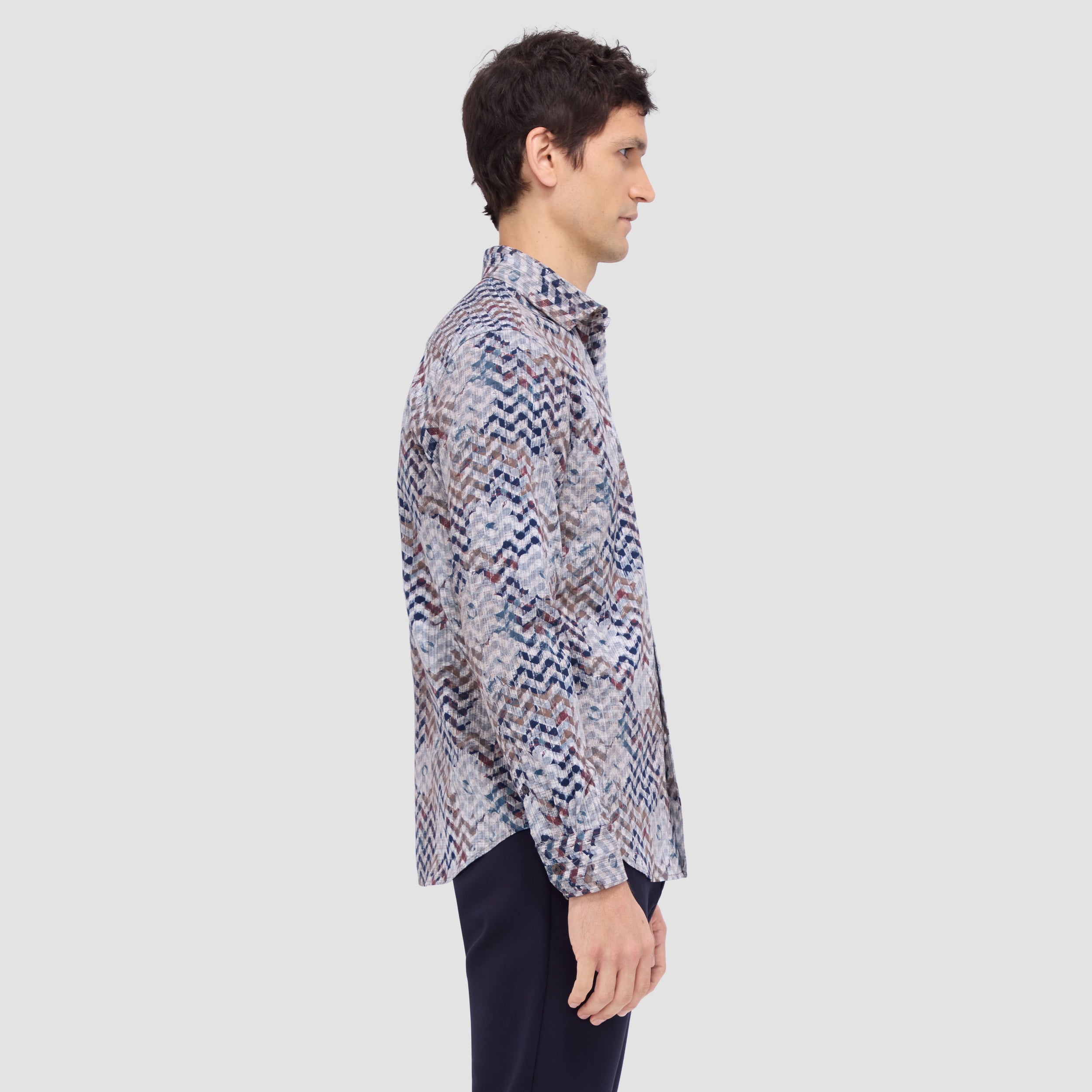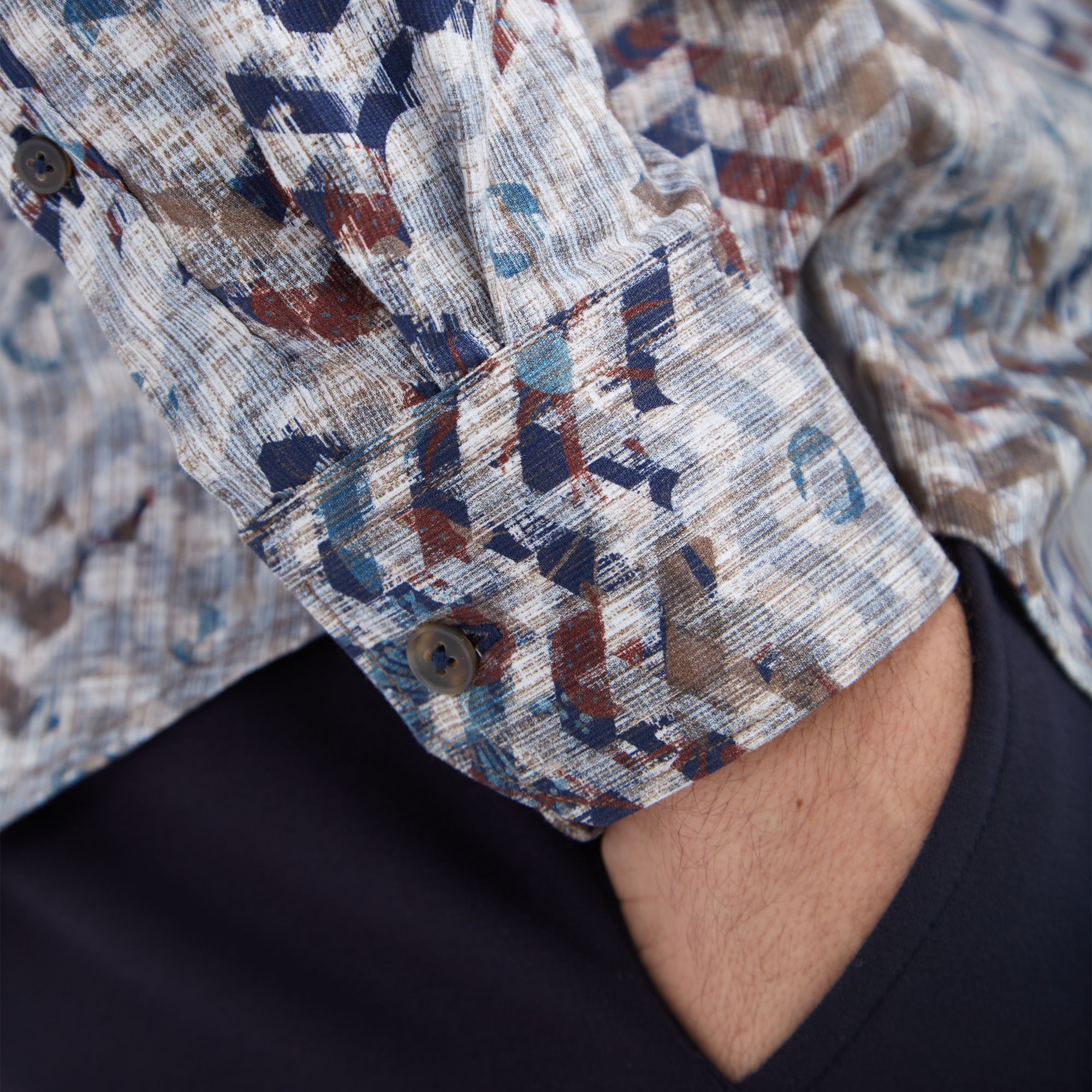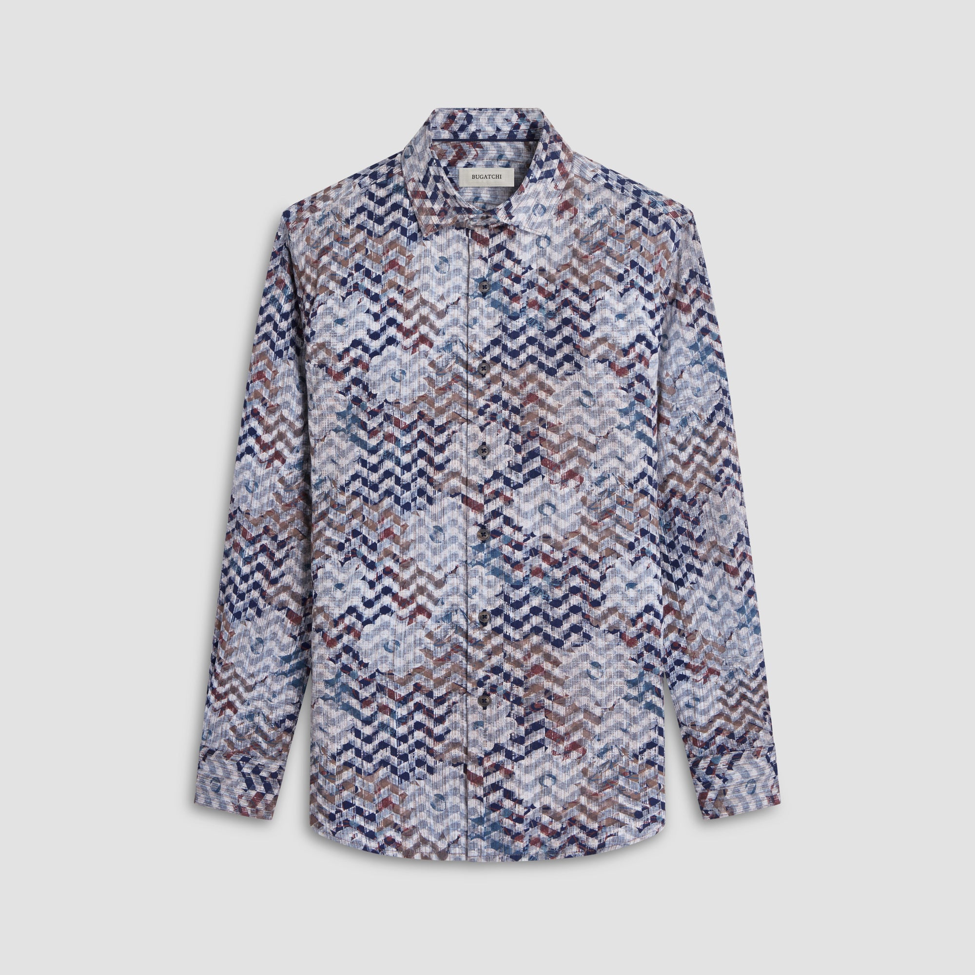 The Axel shirt in COMFORT STRETCH cotton is a contemporary and versatile shirt with optimal comfort and freedom of movement properties. Its timeless and sleek silhouette features long sleeves, a spread collar, adjustable notched cuffs, a curved hem, and an floral chevron print. Wear it tucked or untucked with chinos or trousers for a smart-casual vibe, or with jeans for a relaxed look.