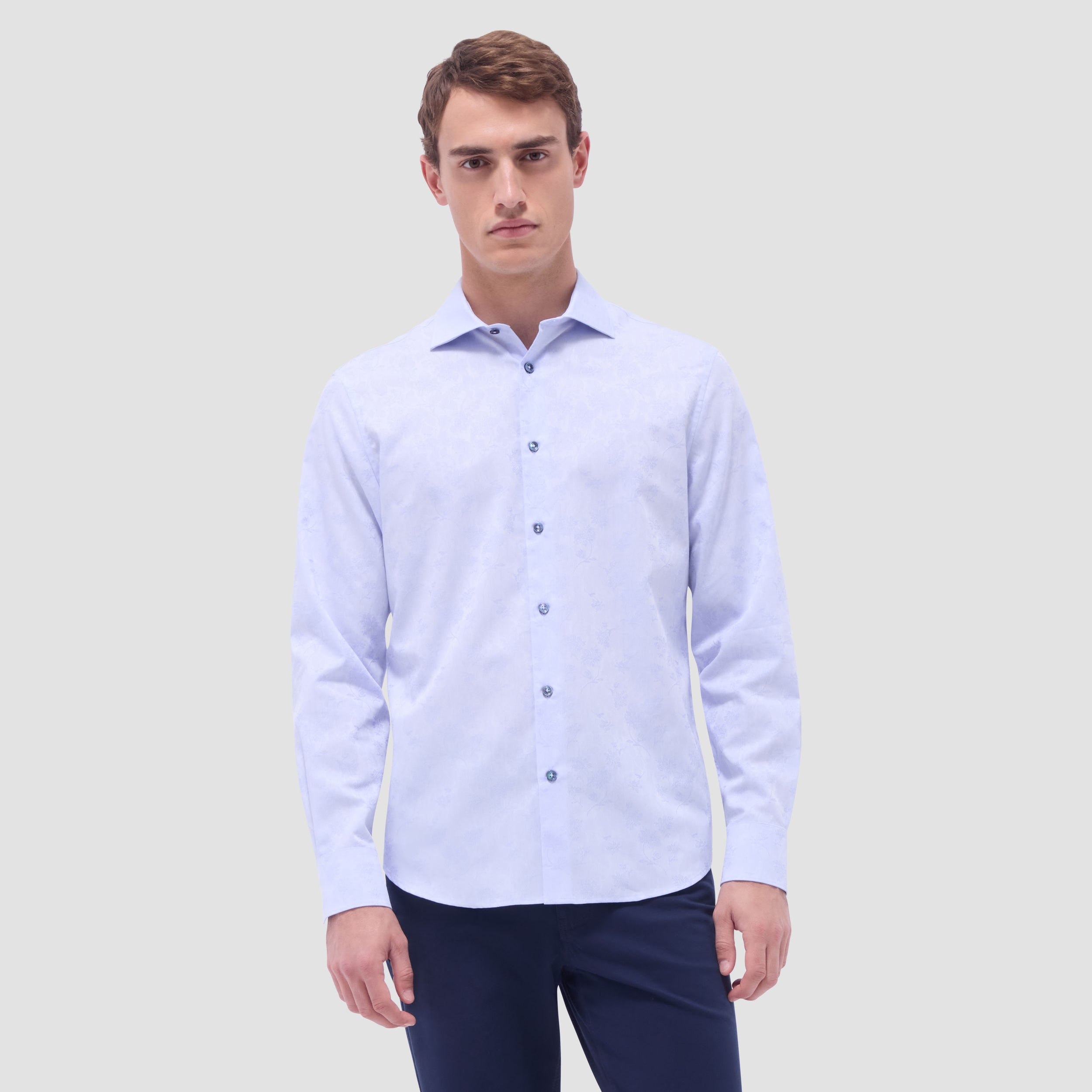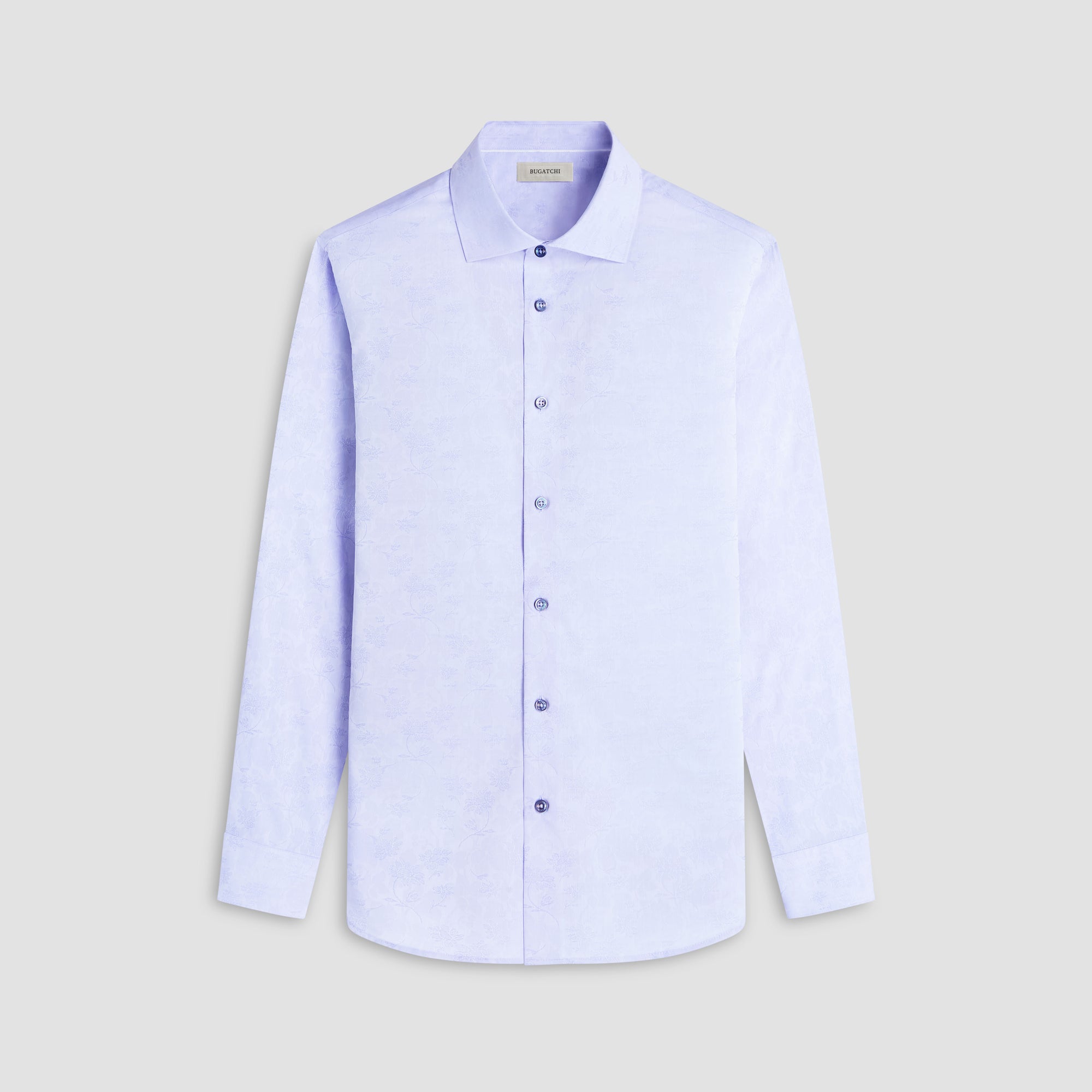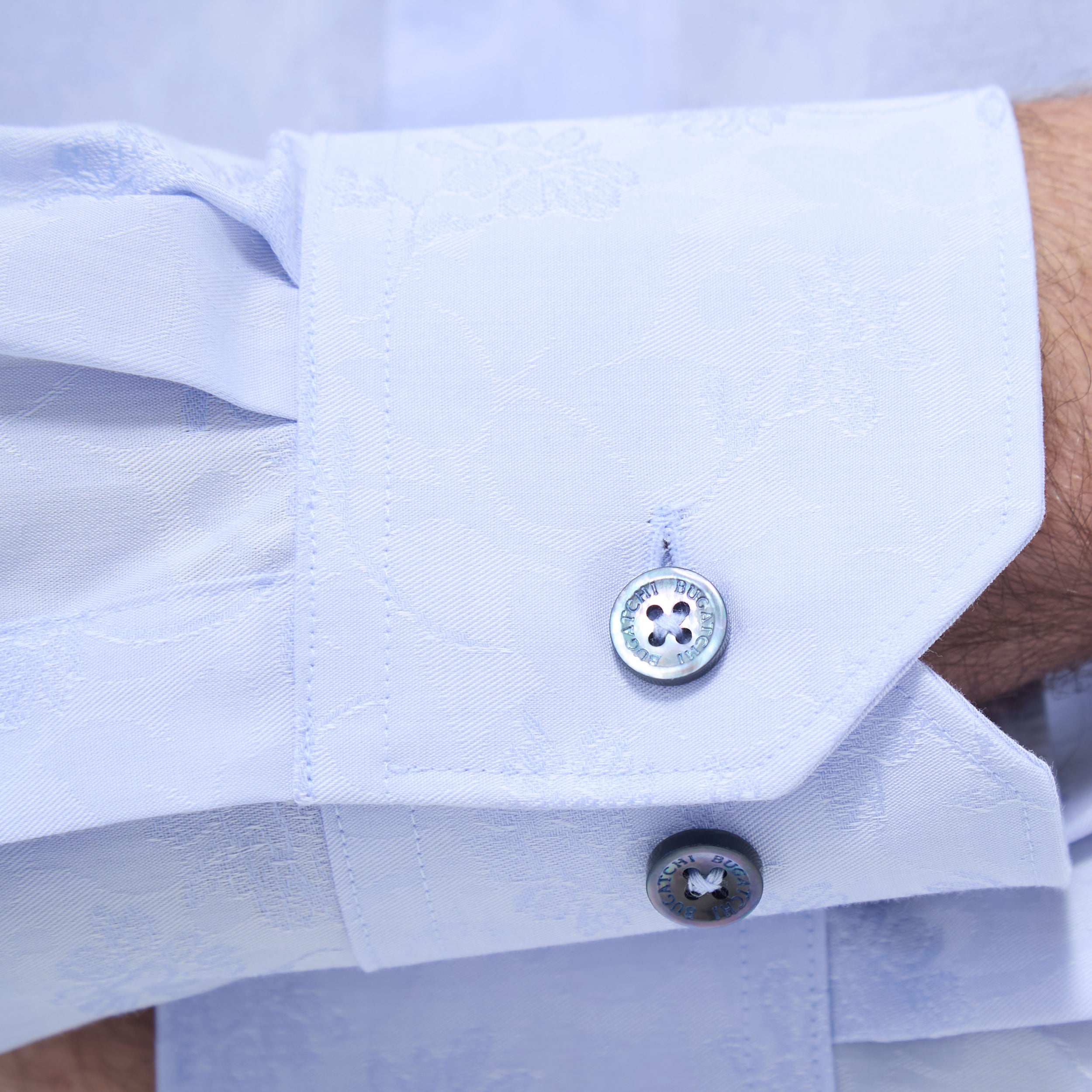 The Axel long-sleeve shirt in tonal floral jacquard is crafted from 100% cotton fabric. Designed for versatility, it features a spread collar, mother-of-pearl buttons, a curved hem that can be worn tucked or untucked, and notched cuffs adjustable for a custom fit-wear them snug or loose, or convert them for cufflinks. A refined choice for any occasion.