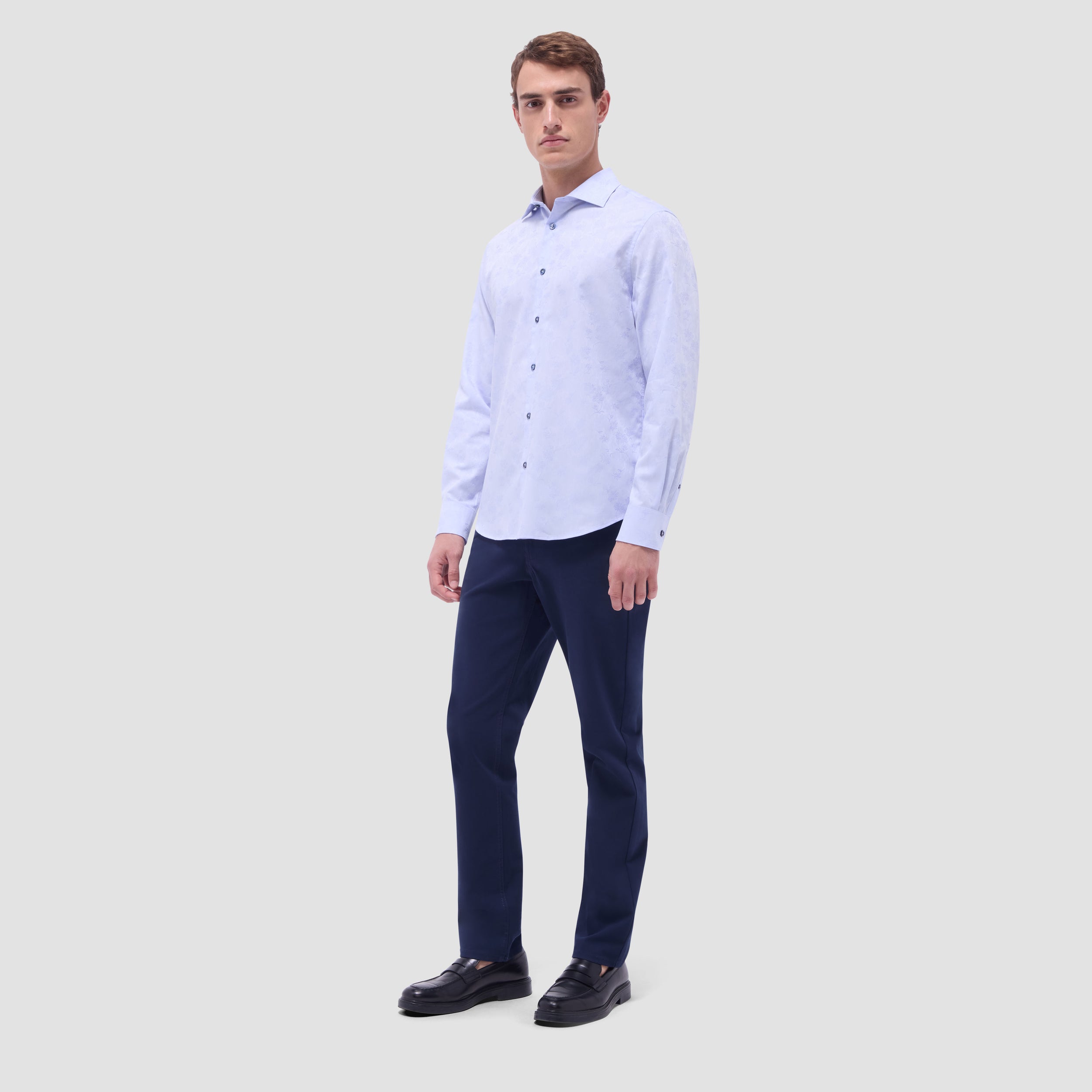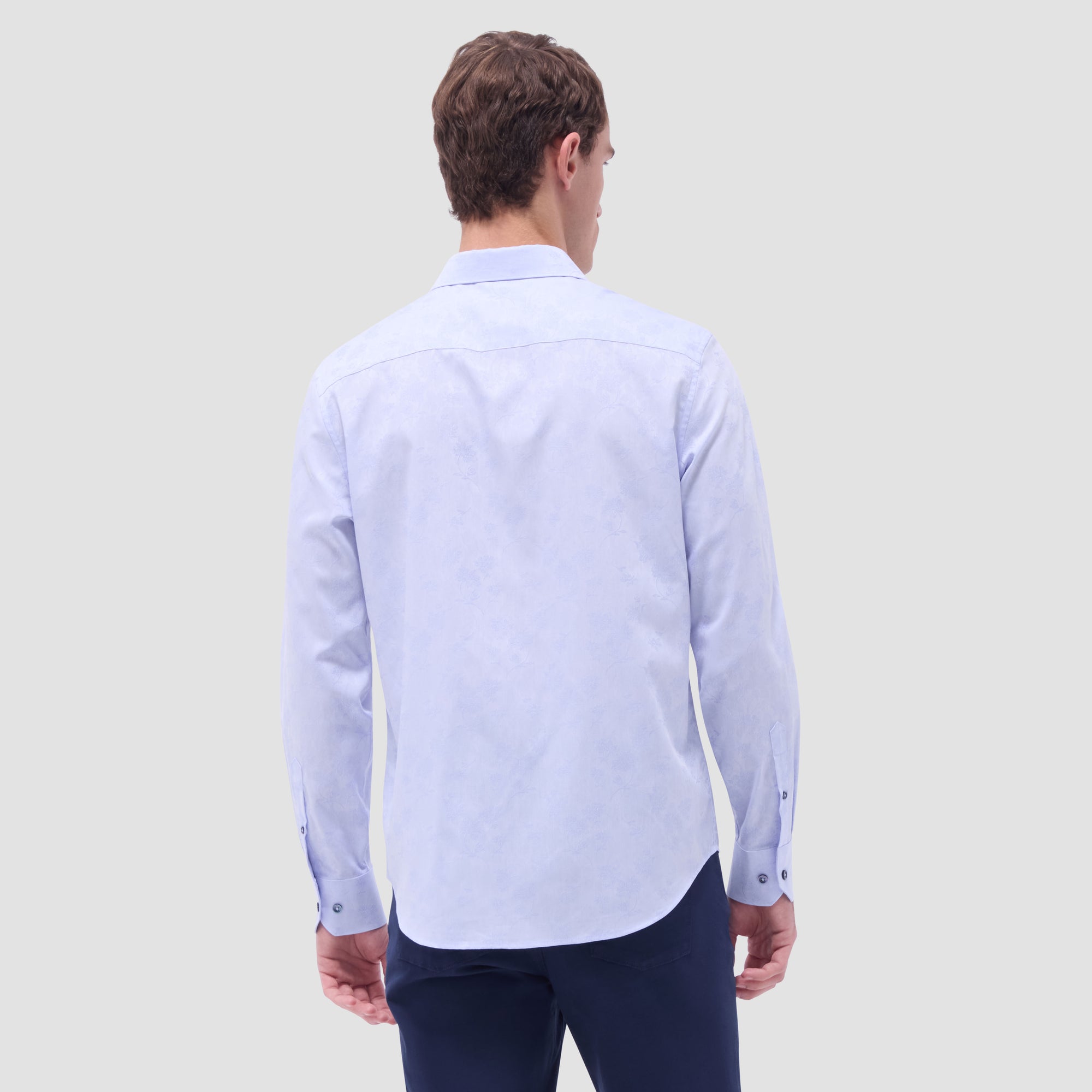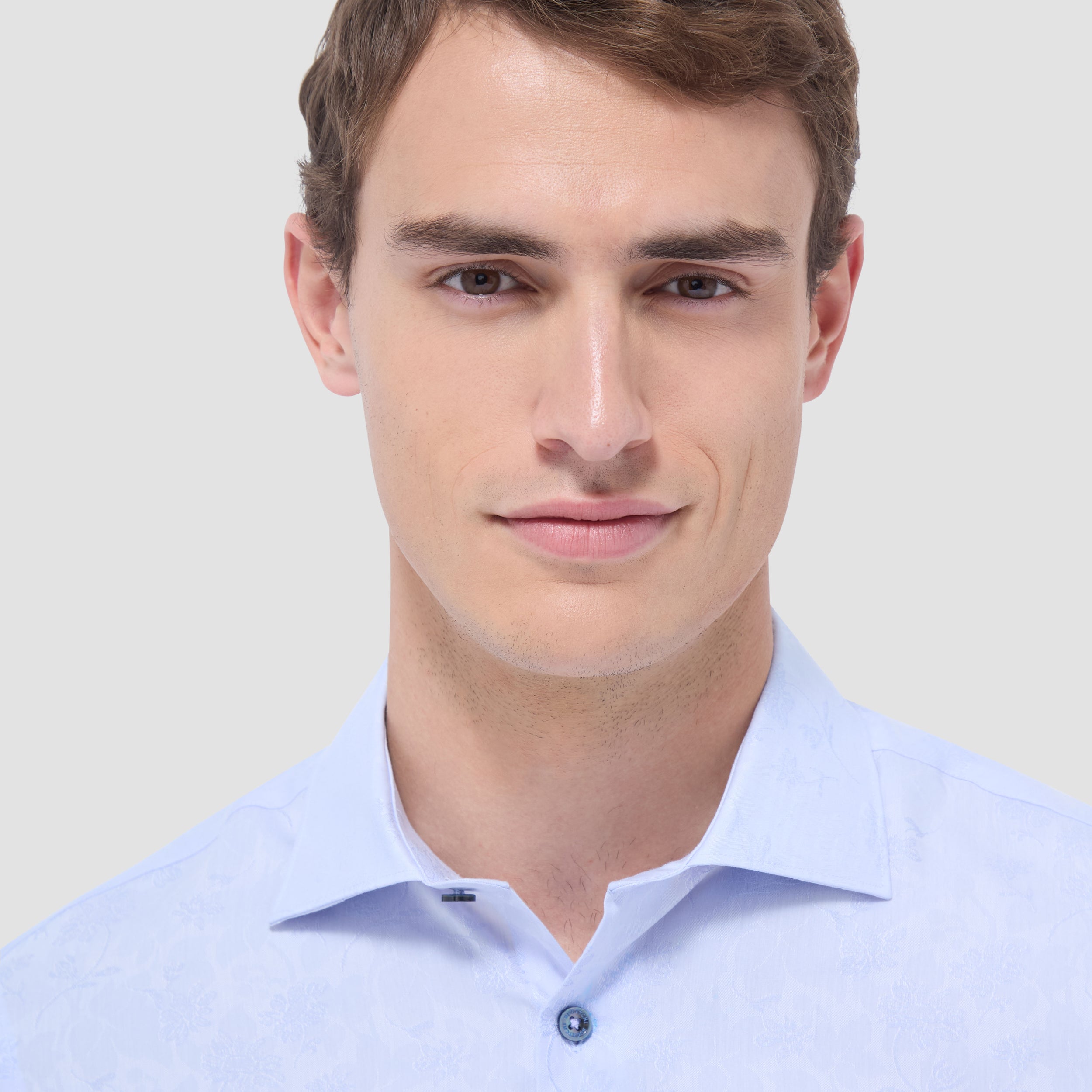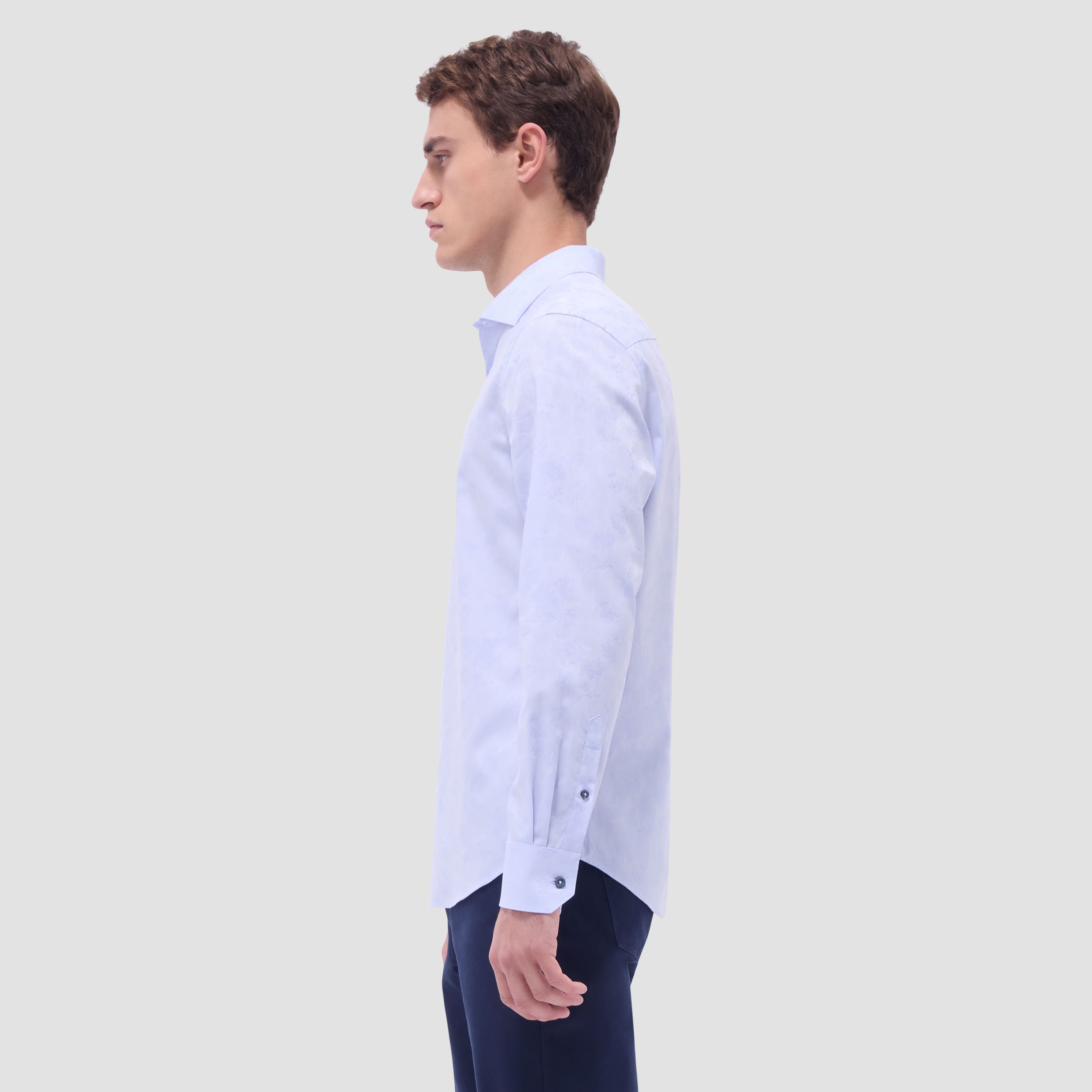 The Axel long-sleeve shirt in tonal floral jacquard is crafted from 100% cotton fabric. Designed for versatility, it features a spread collar, mother-of-pearl buttons, a curved hem that can be worn tucked or untucked, and notched cuffs adjustable for a custom fit-wear them snug or loose, or convert them for cufflinks. A refined choice for any occasion.