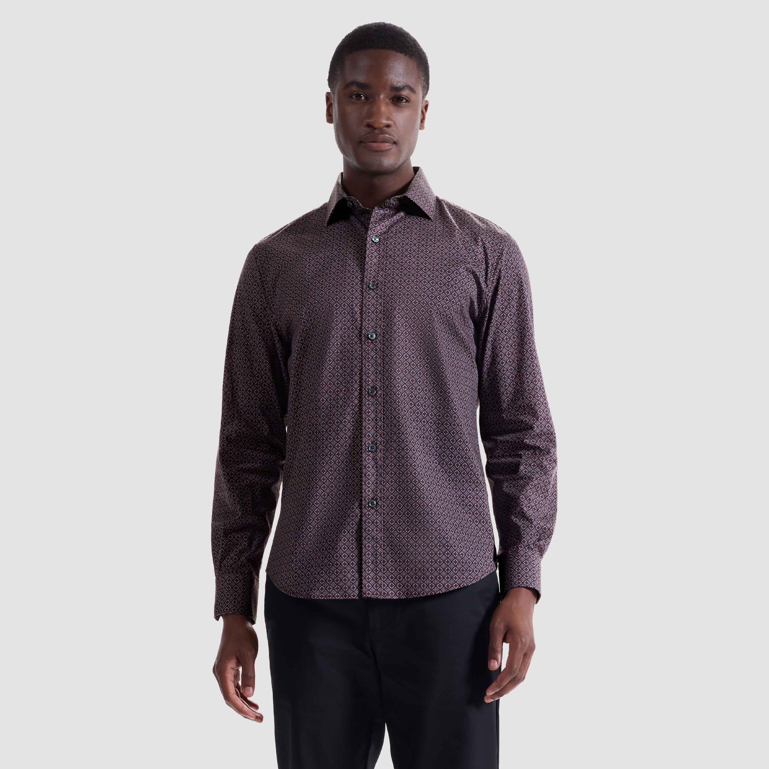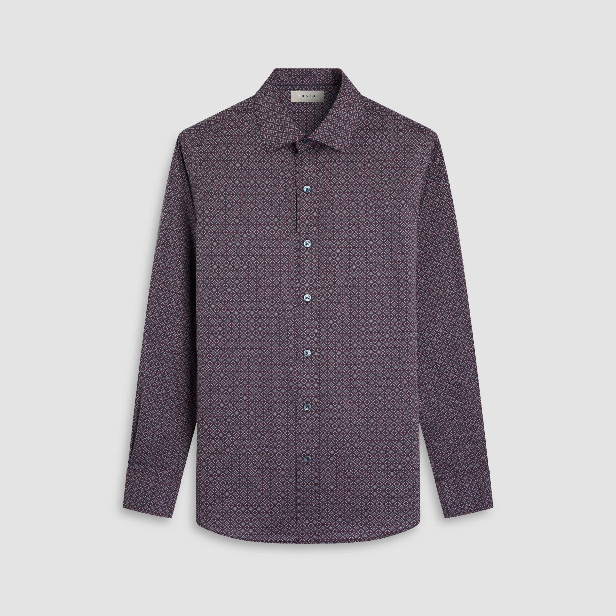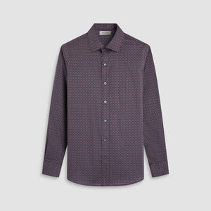 The Axel long-sleeve Comfort Stretch shirt in geometric print is crafted from premium Italian cotton with a hint of stretch for all-day comfort. It features a spread collar, mother-of-pearl buttons, a curved hem that looks great tucked or untucked, and adjustable notched cuffs that also convert for cufflinks. A refined, all-occasion shirt.