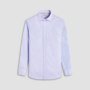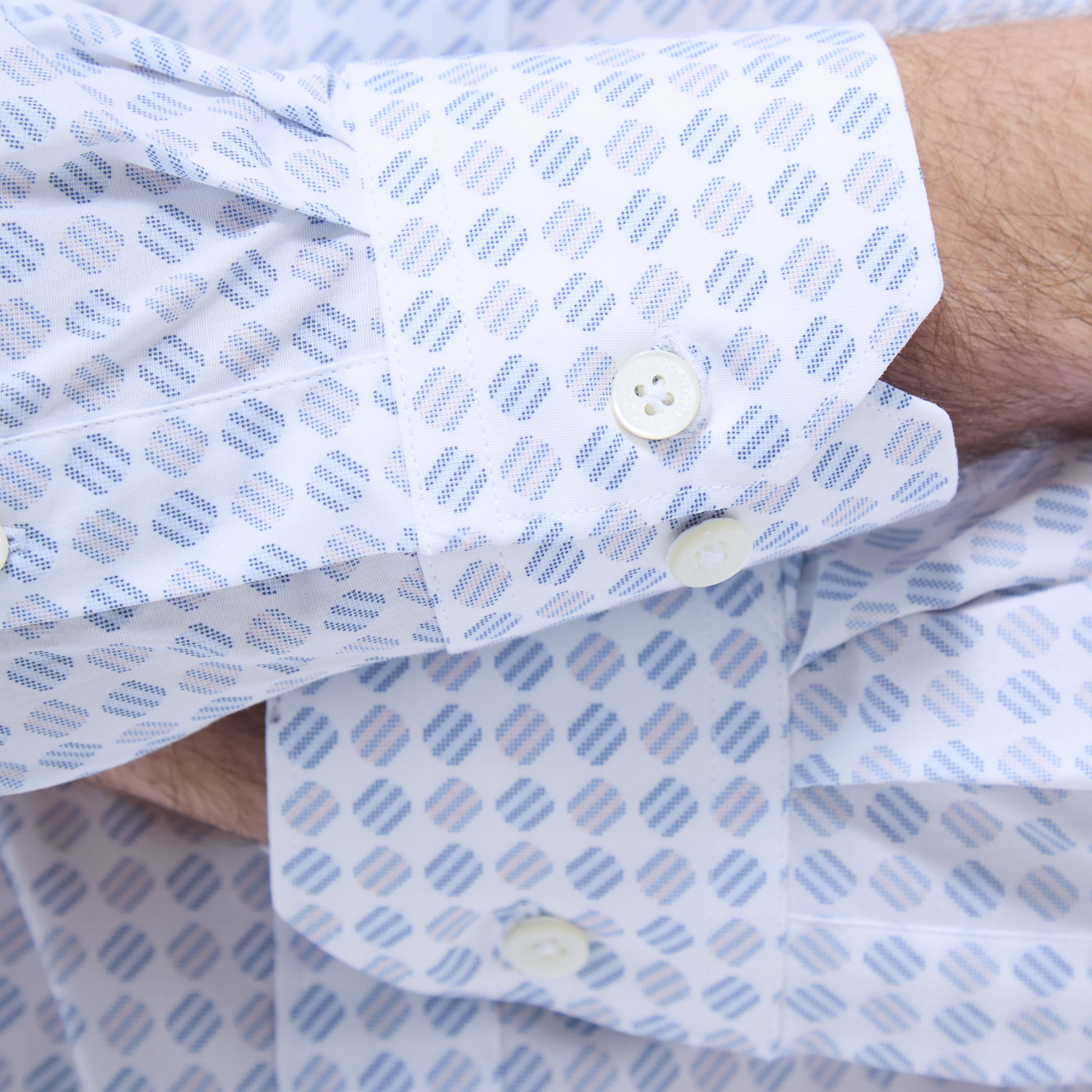 The Axel long-sleeve Comfort Stretch shirt in geometric print is crafted from premium cotton with a hint of stretch. Designed for versatility, it features a spread collar, mother-of-pearl buttons, a curved hem that can be worn tucked or untucked, and notched cuffs adjustable for a custom fit-wear them snug or loose, or convert them for cufflinks. A refined choice for any occasion.