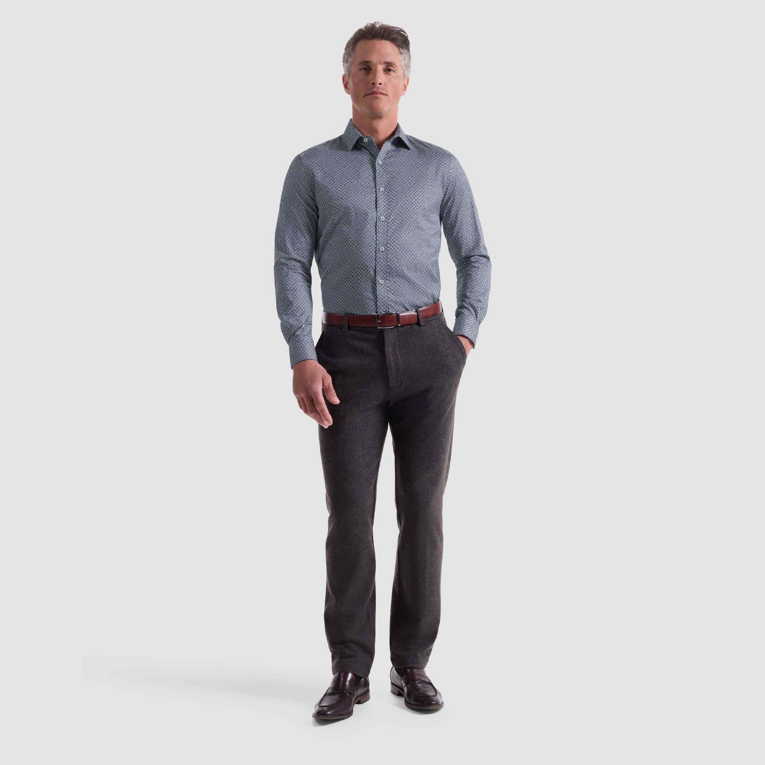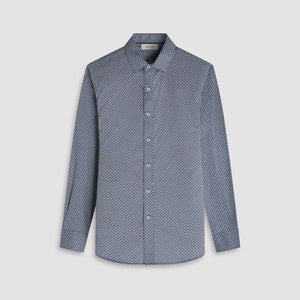 The Axel long-sleeve shirt in geometric print is crafted from premium 100% cotton. It features a spread collar, mother-of-pearl buttons, a curved hem that looks great tucked or untucked, and adjustable notched cuffs that also convert for cufflinks. A refined, all-occasion shirt.