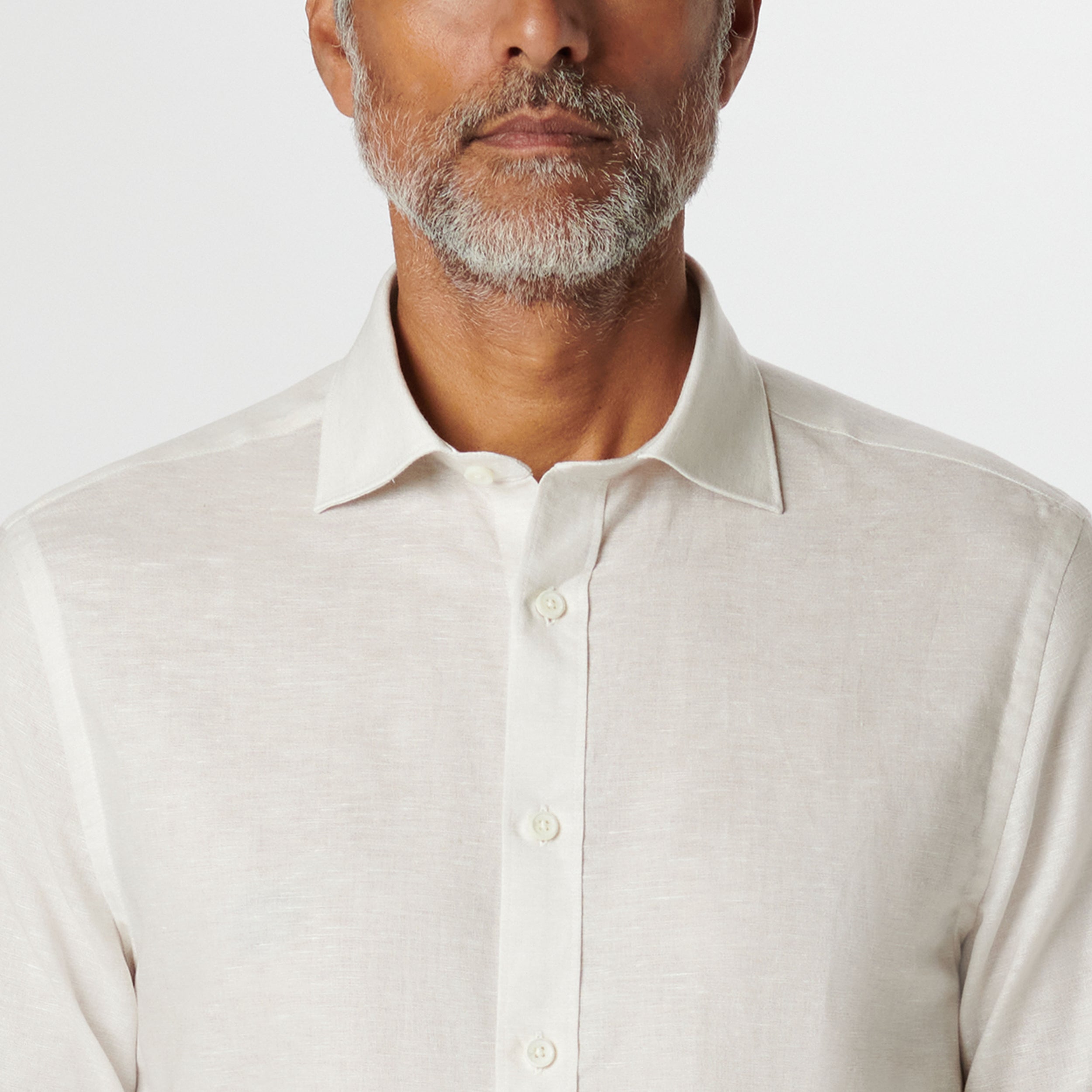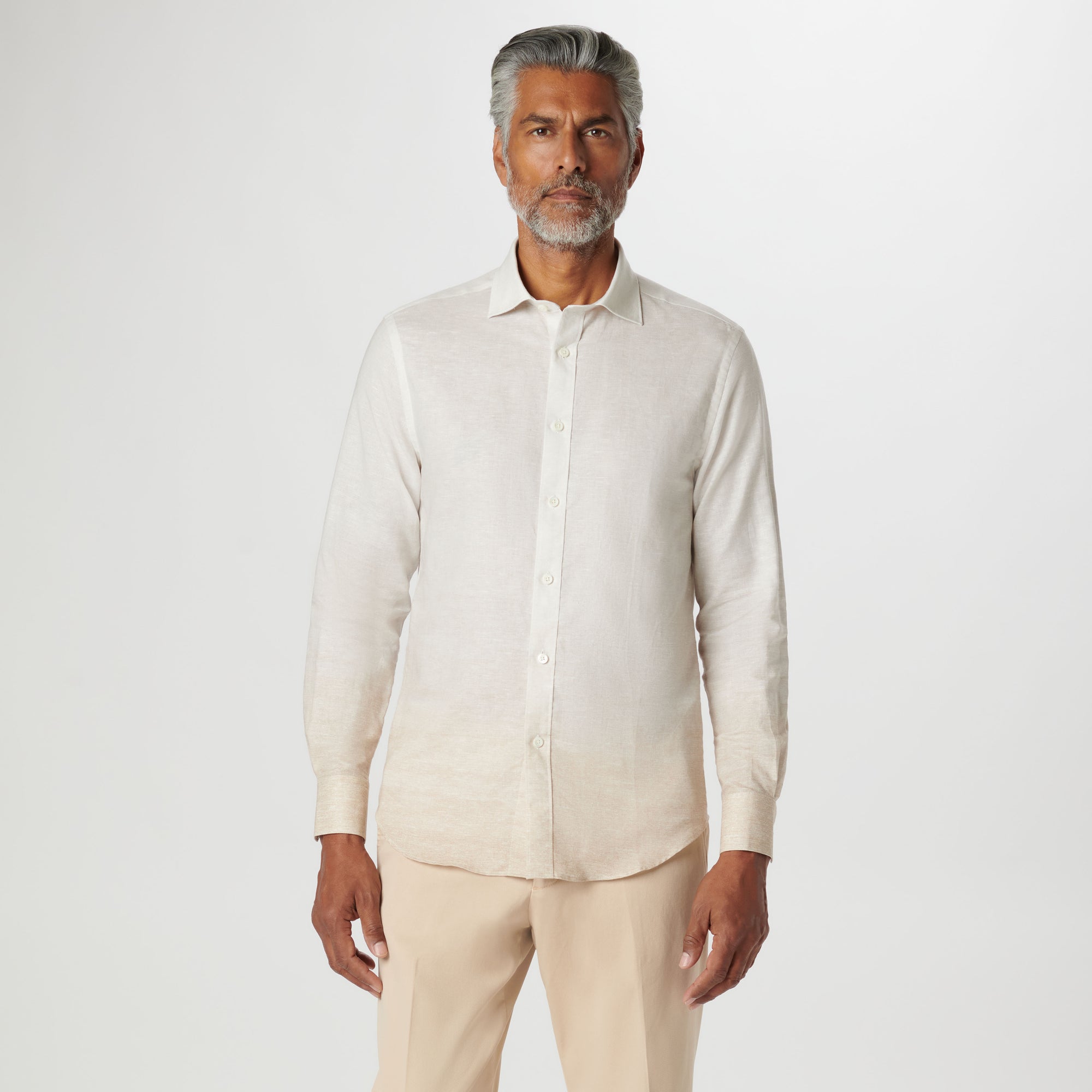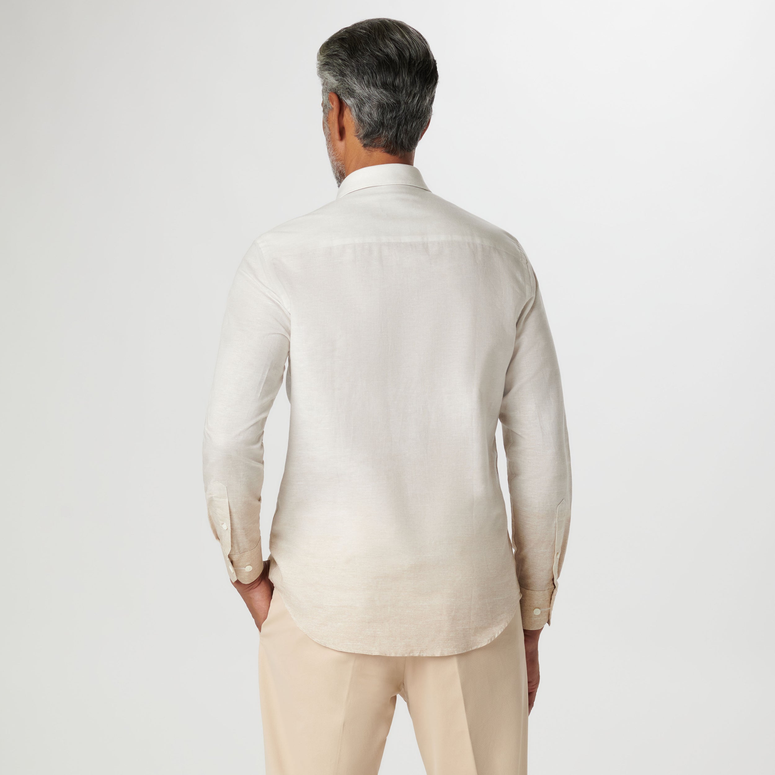 The Axel long-sleeved shirt is crafted from premium linen-cotton blend and features an ombre print, a spread collar, adjustable notched cuffs, and a curved hem.