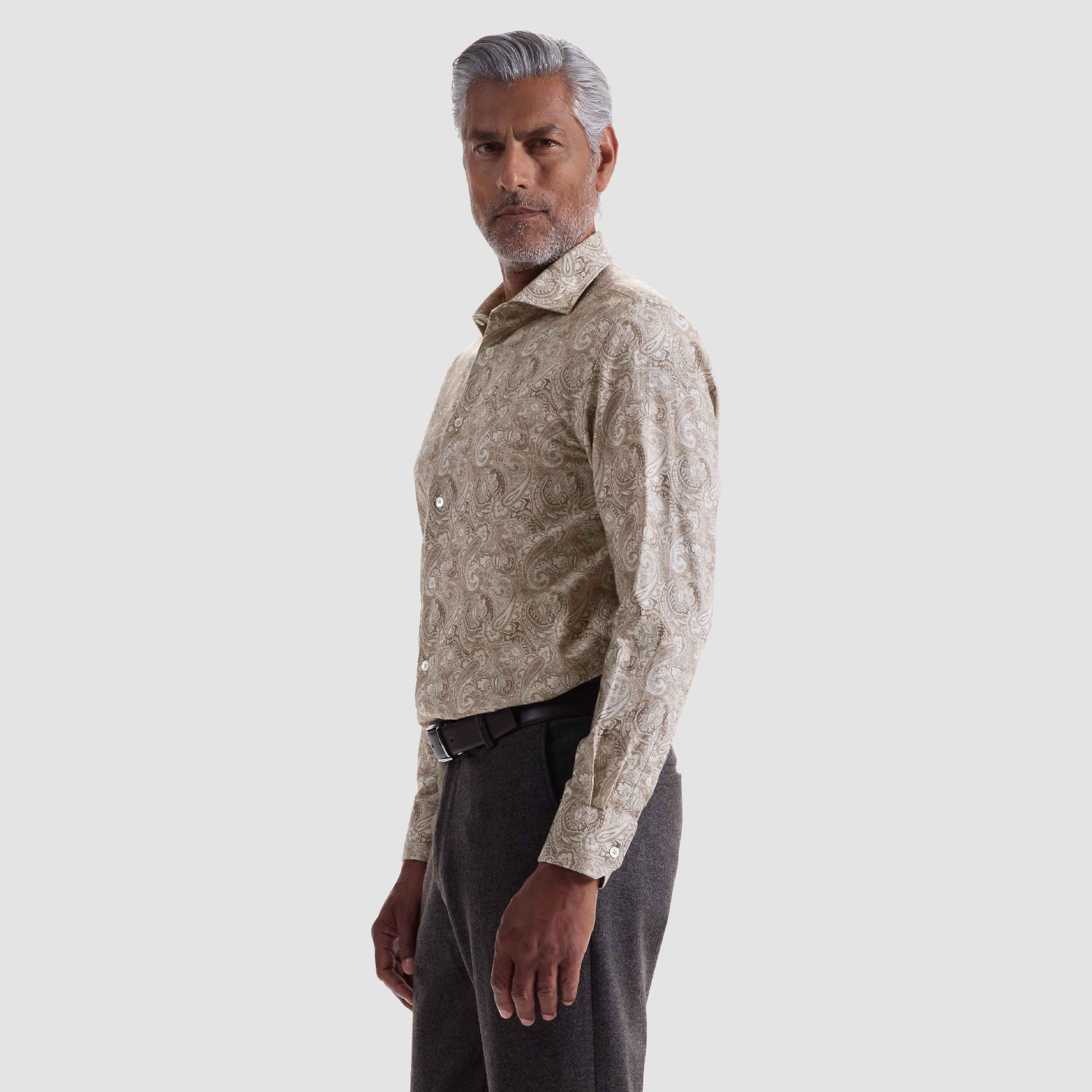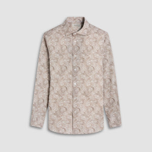 The Axel long-sleeve shirt in paisley print is made in Italy from premium 100% Italian cotton. It features a spread collar, mother-of-pearl buttons, a curved hem that looks great tucked or untucked, and adjustable notched cuffs that also convert for cufflinks. A refined, all-occasion shirt.