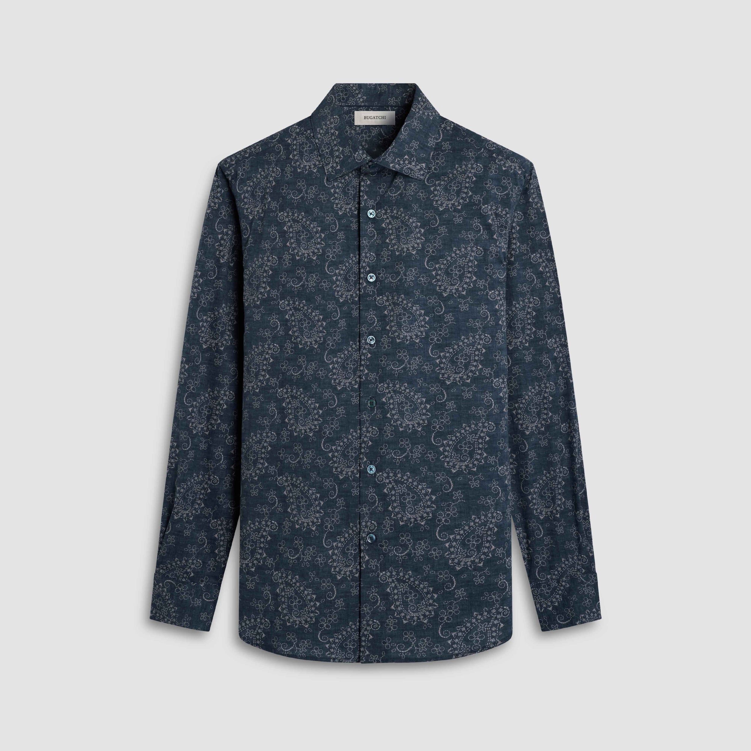 The Axel long-sleeve Comfort Stretch shirt in paisley print is crafted from premium Italian cotton with a hint of stretch for all-day comfort. It features a spread collar, mother-of-pearl buttons, a curved hem that looks great tucked or untucked, and adjustable notched cuffs that also convert for cufflinks. A refined, all-occasion shirt.