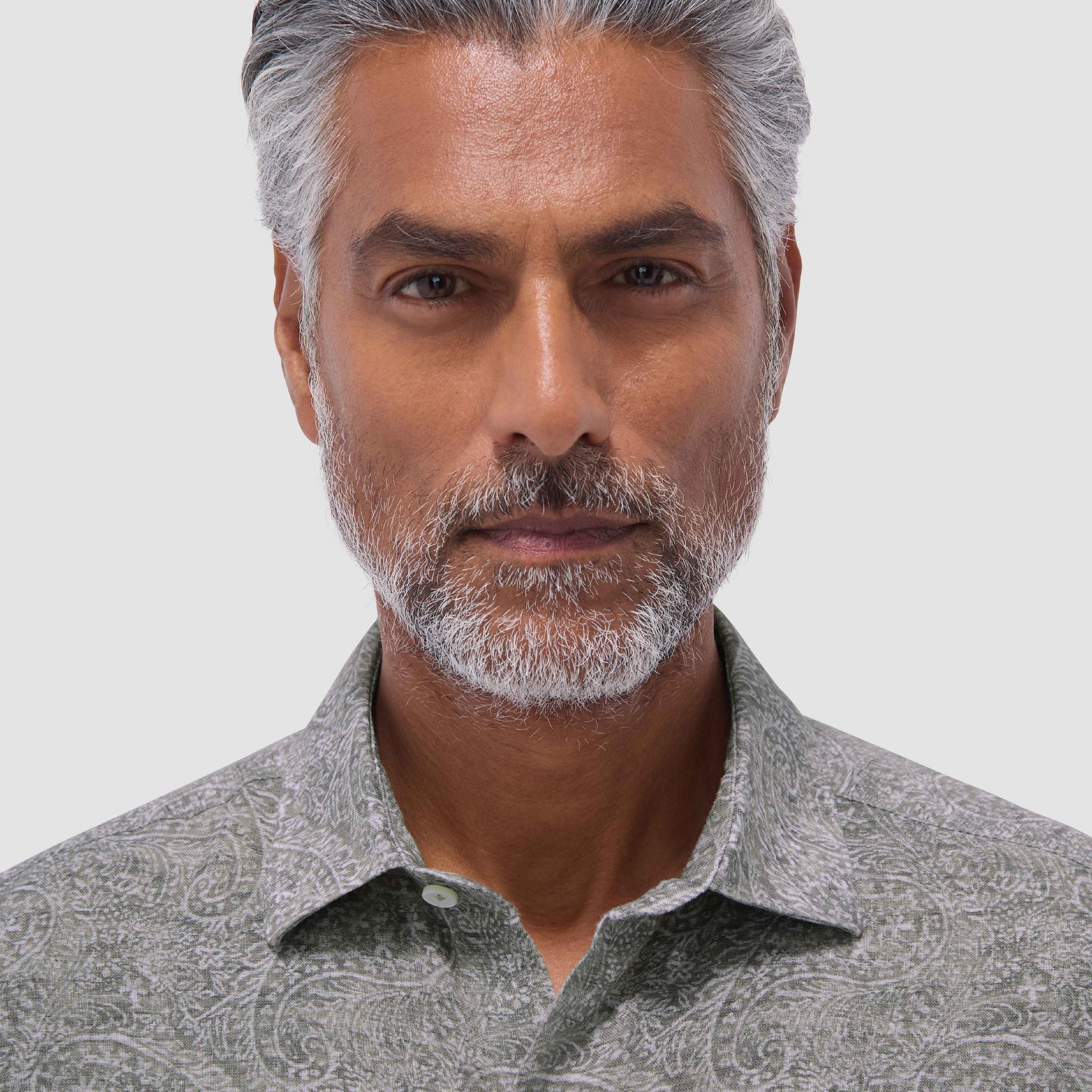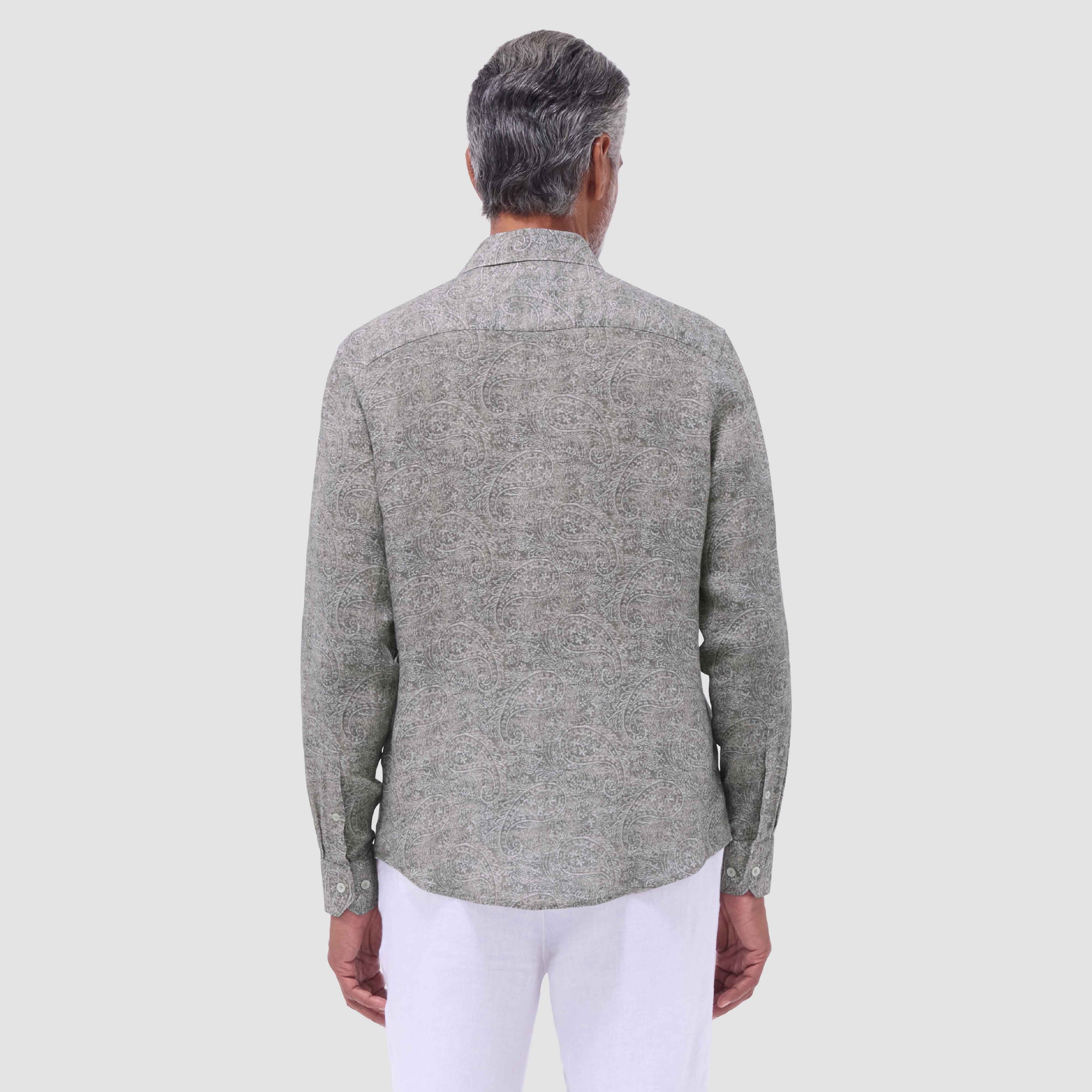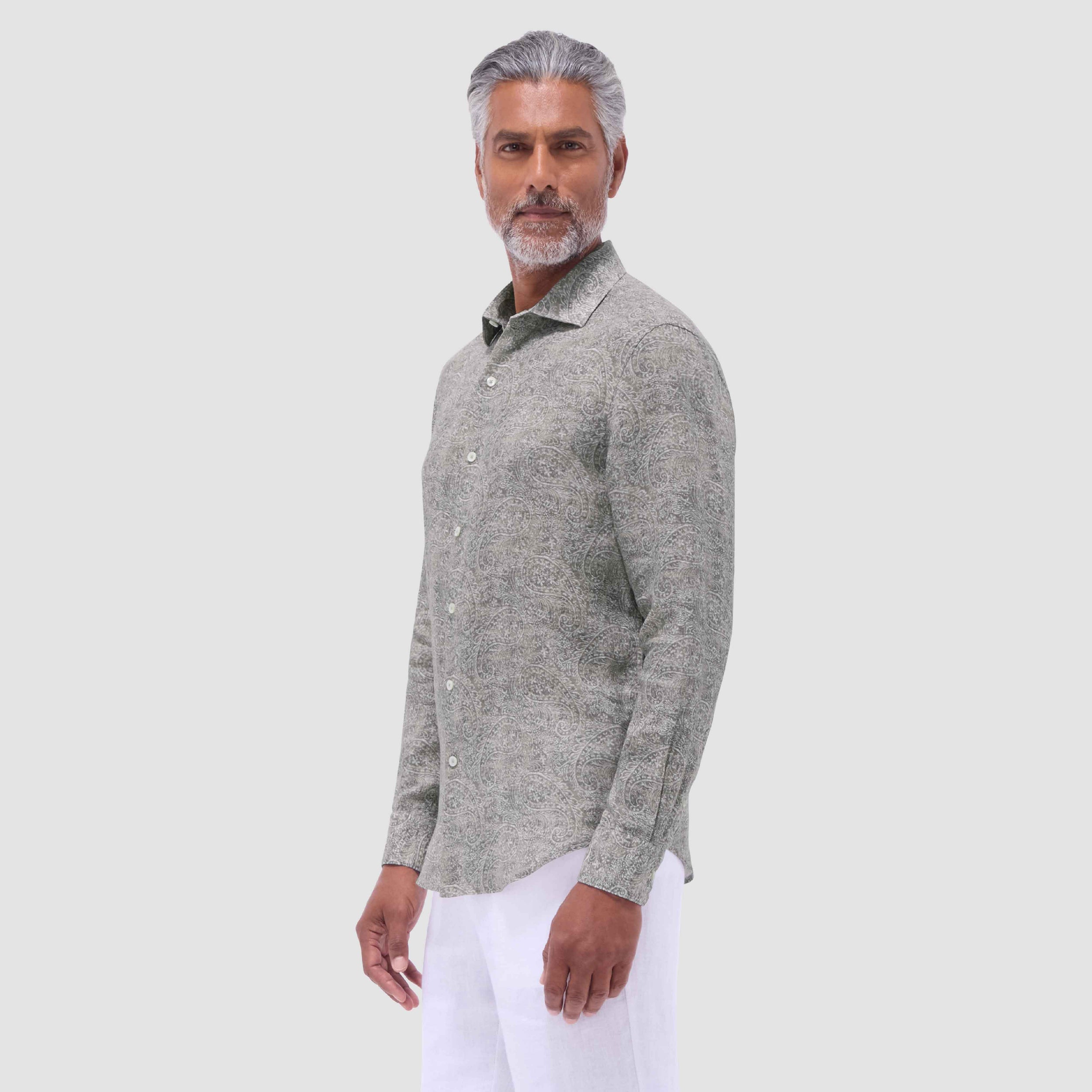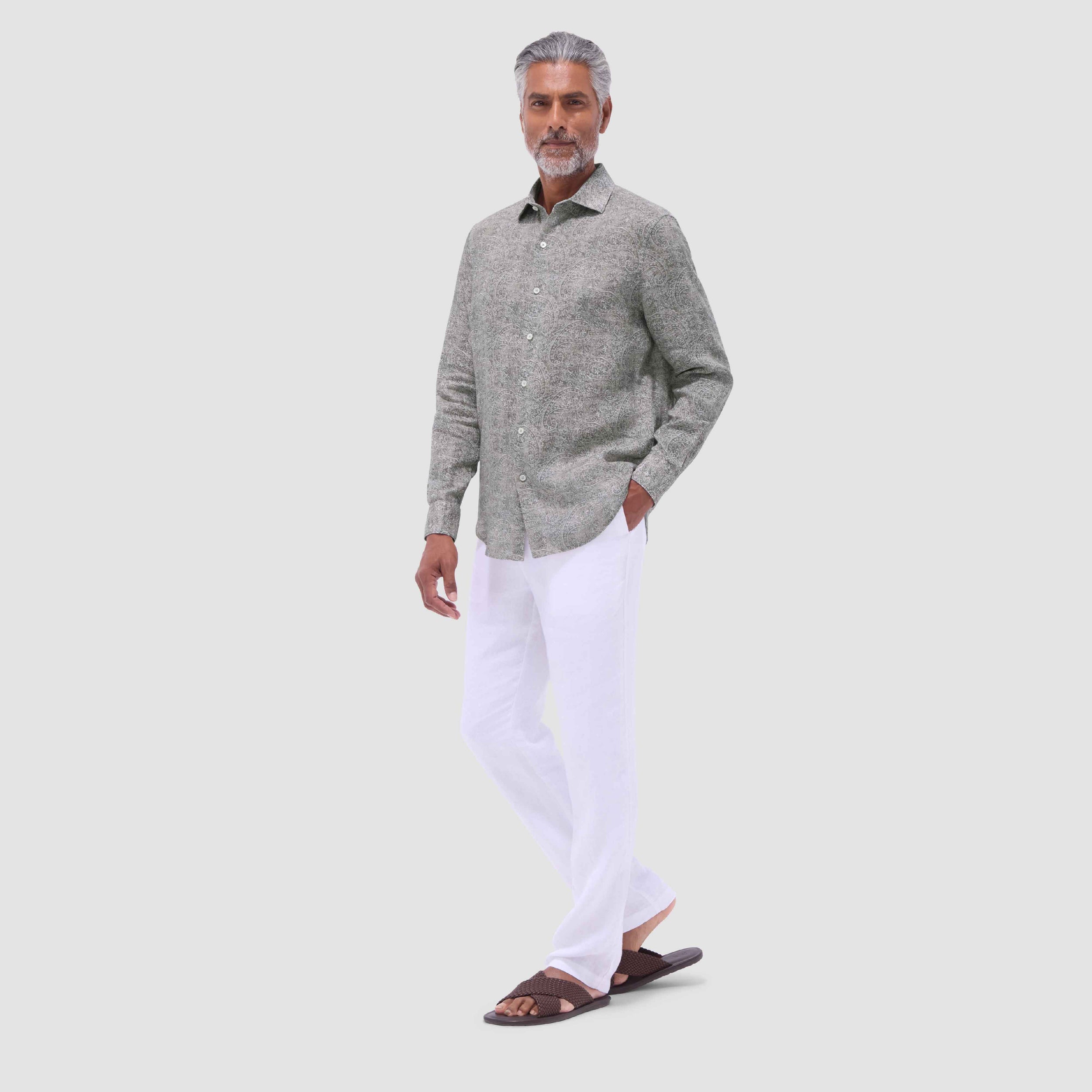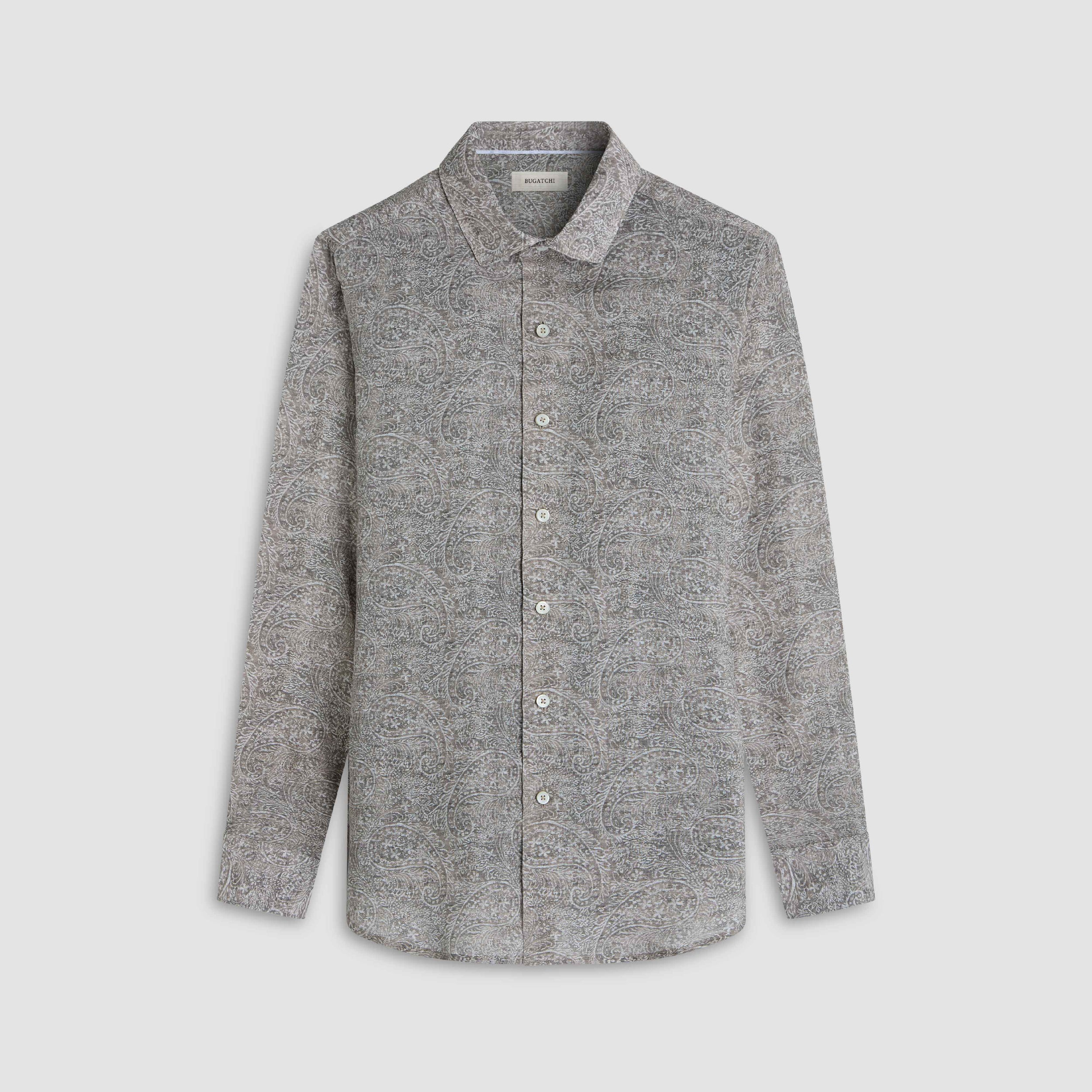 The Axel long-sleeve shirt in paisley print is crafted from 100% Italian linen fabric and features a spread collar, mother-of-pearl buttons, a curved hem that can be worn tucked or untucked, and notched cuffs adjustable for a custom fit-wear them snug or loose. The natural texture of linen adds a laid-back, effortless charm to any outfit.