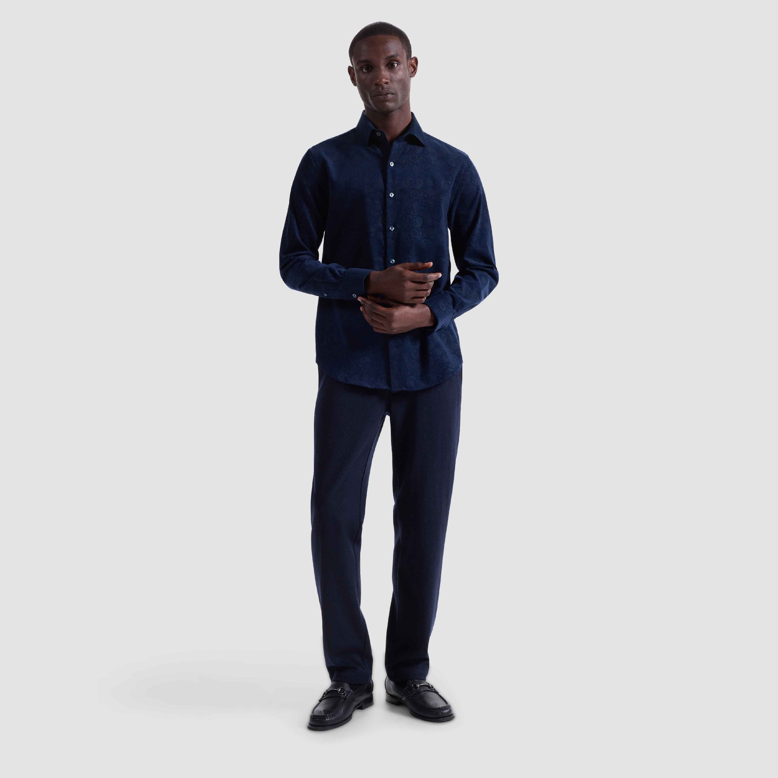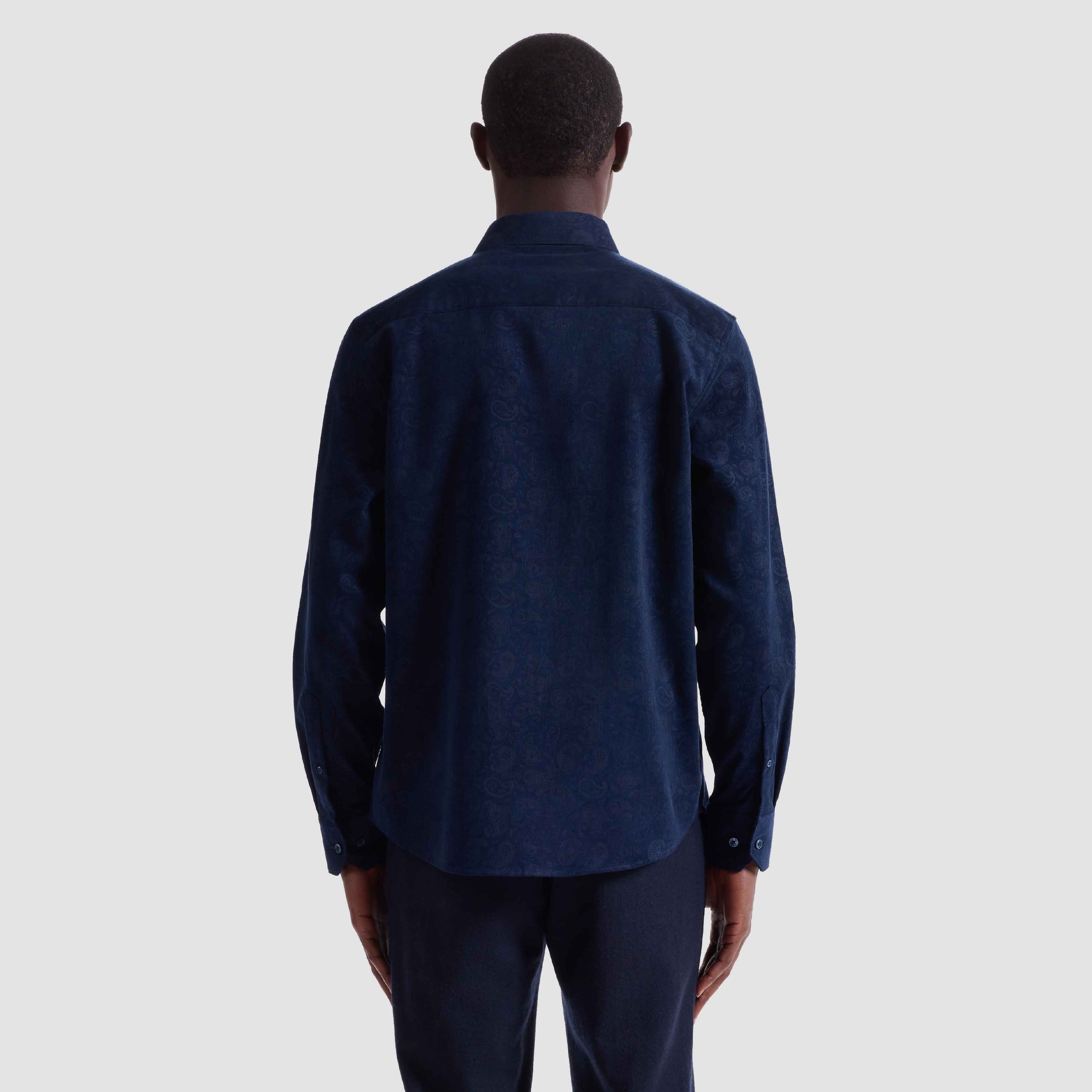 The Axel long-sleeve shirt in paisley print is crafted from premium 100% Italian cotton pinwale corduroy. It features a spread collar, mother-of-pearl buttons, a curved hem that looks great tucked or untucked, and adjustable notched cuffs that also convert for cufflinks. A refined, all-occasion shirt.