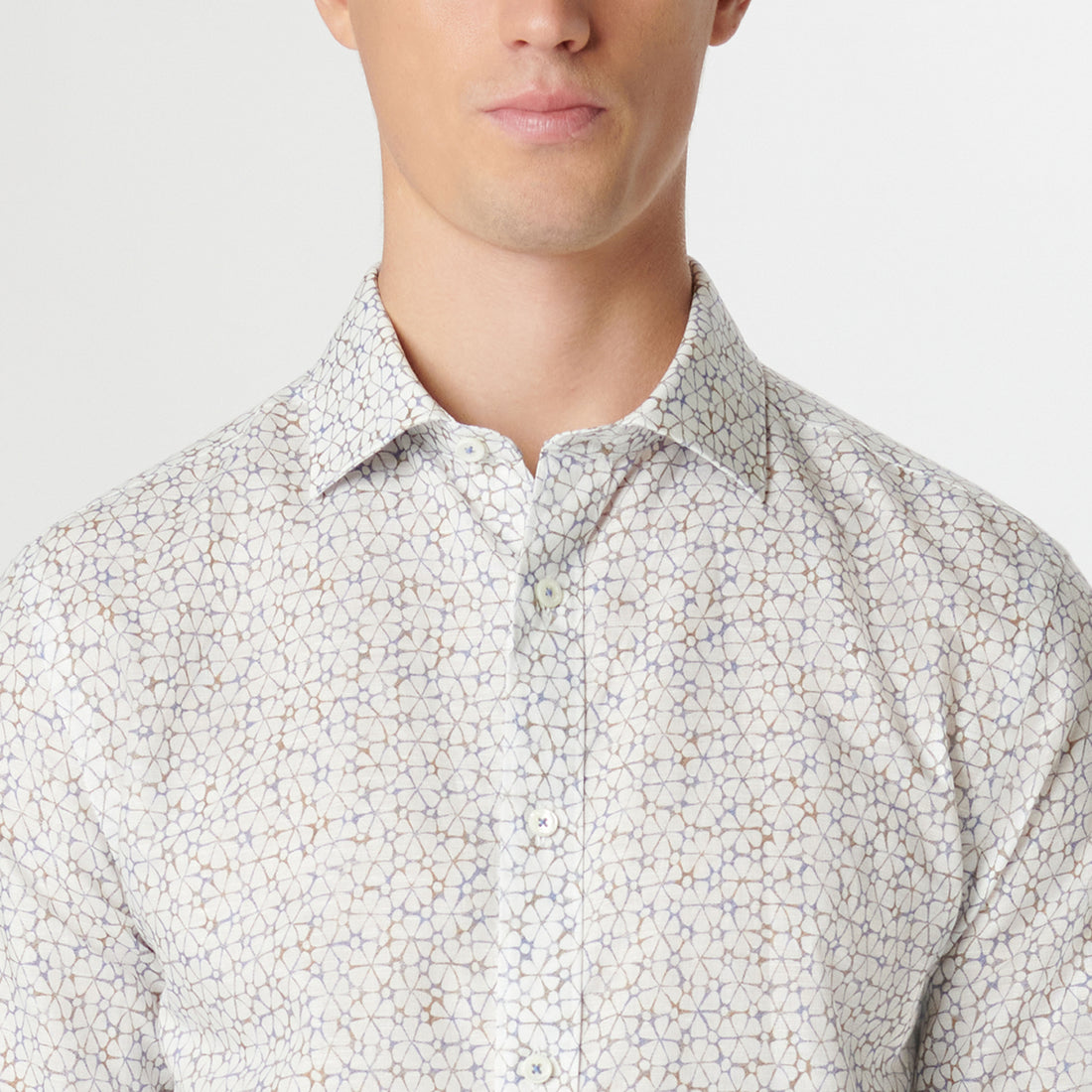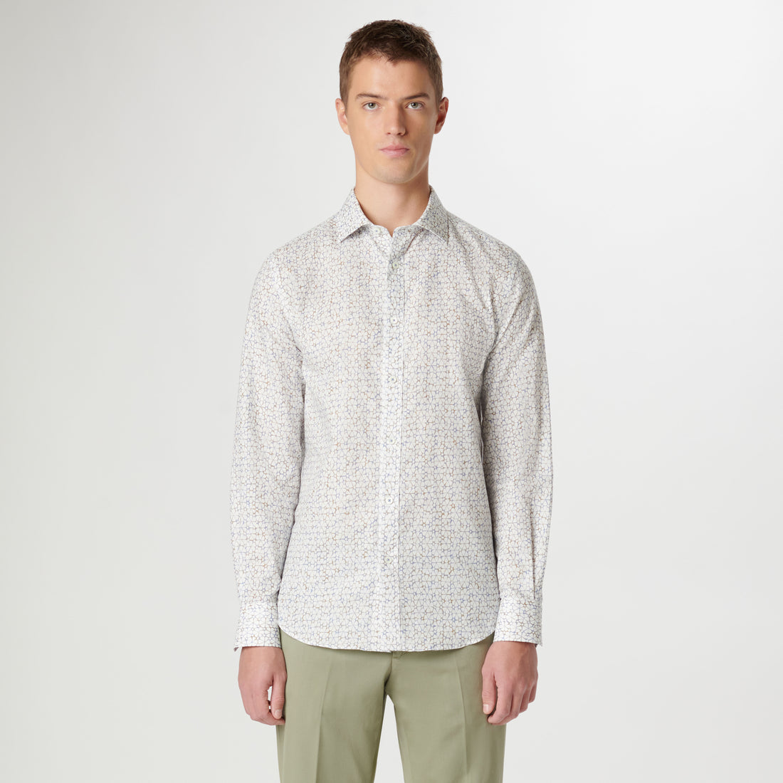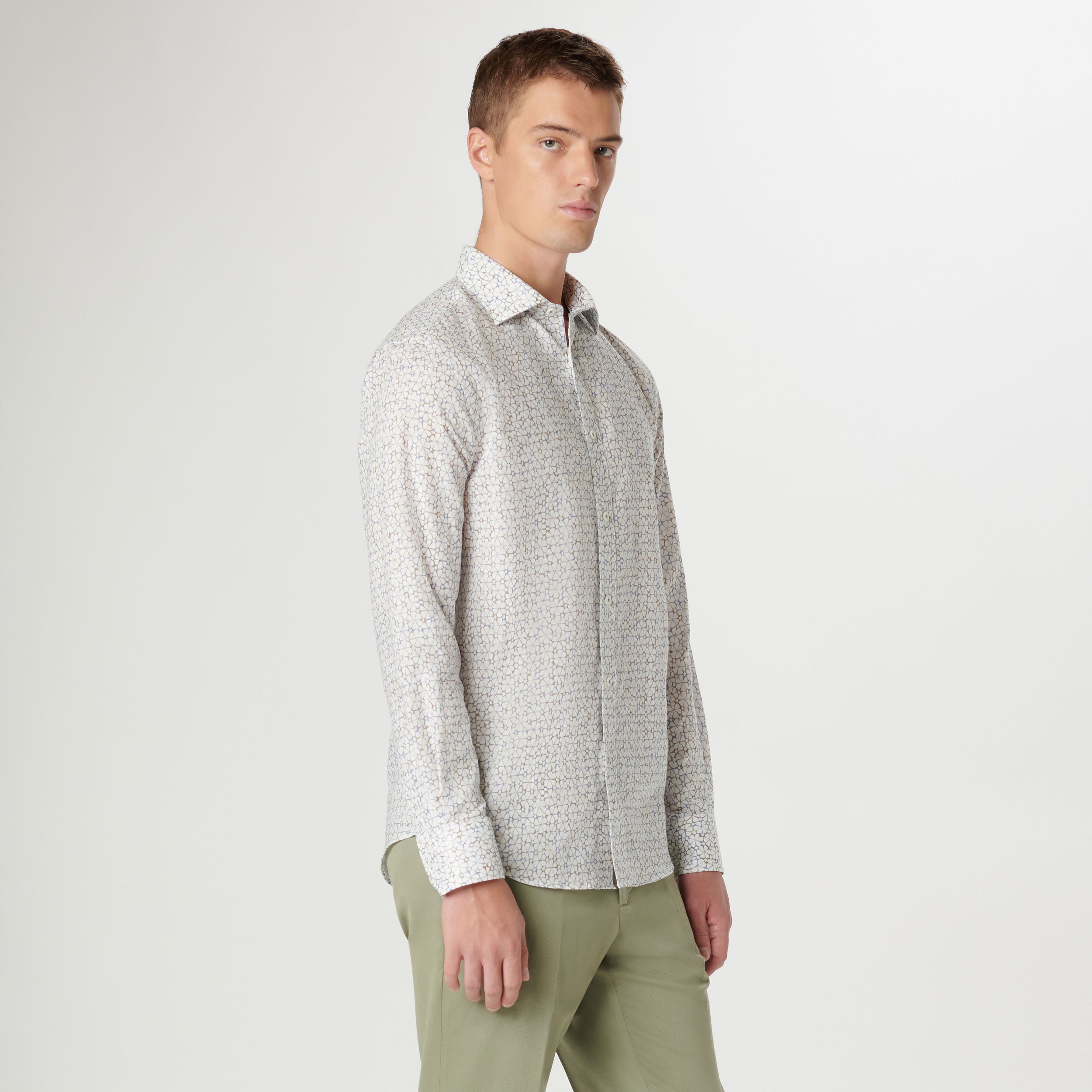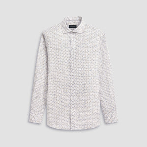 The Axel long-sleeved shirt is crafted from premium linen-cotton blend and features retro floral print, a spread collar, adjustable notched cuffs, and a curved hem.