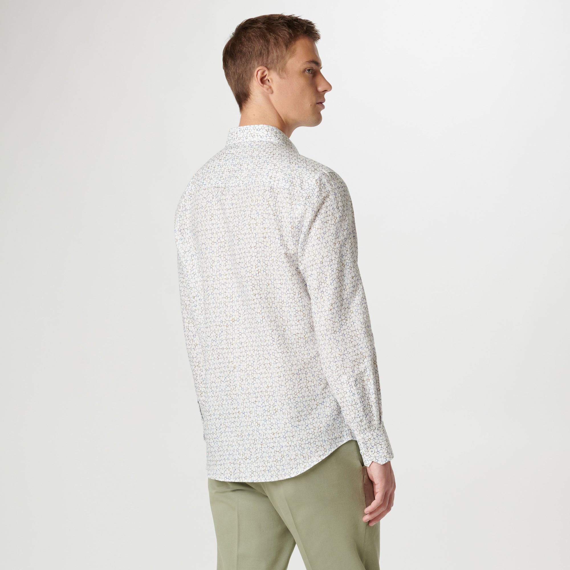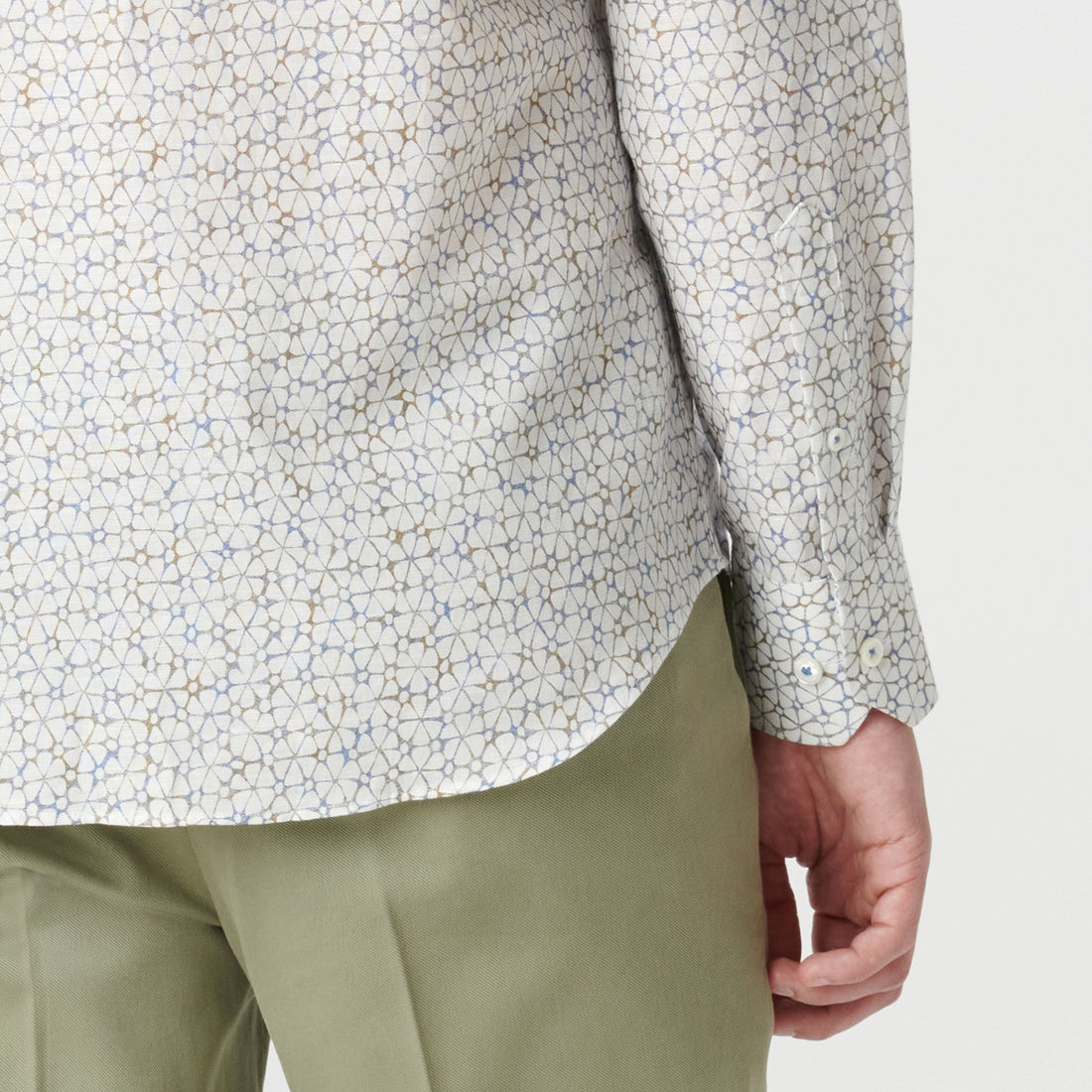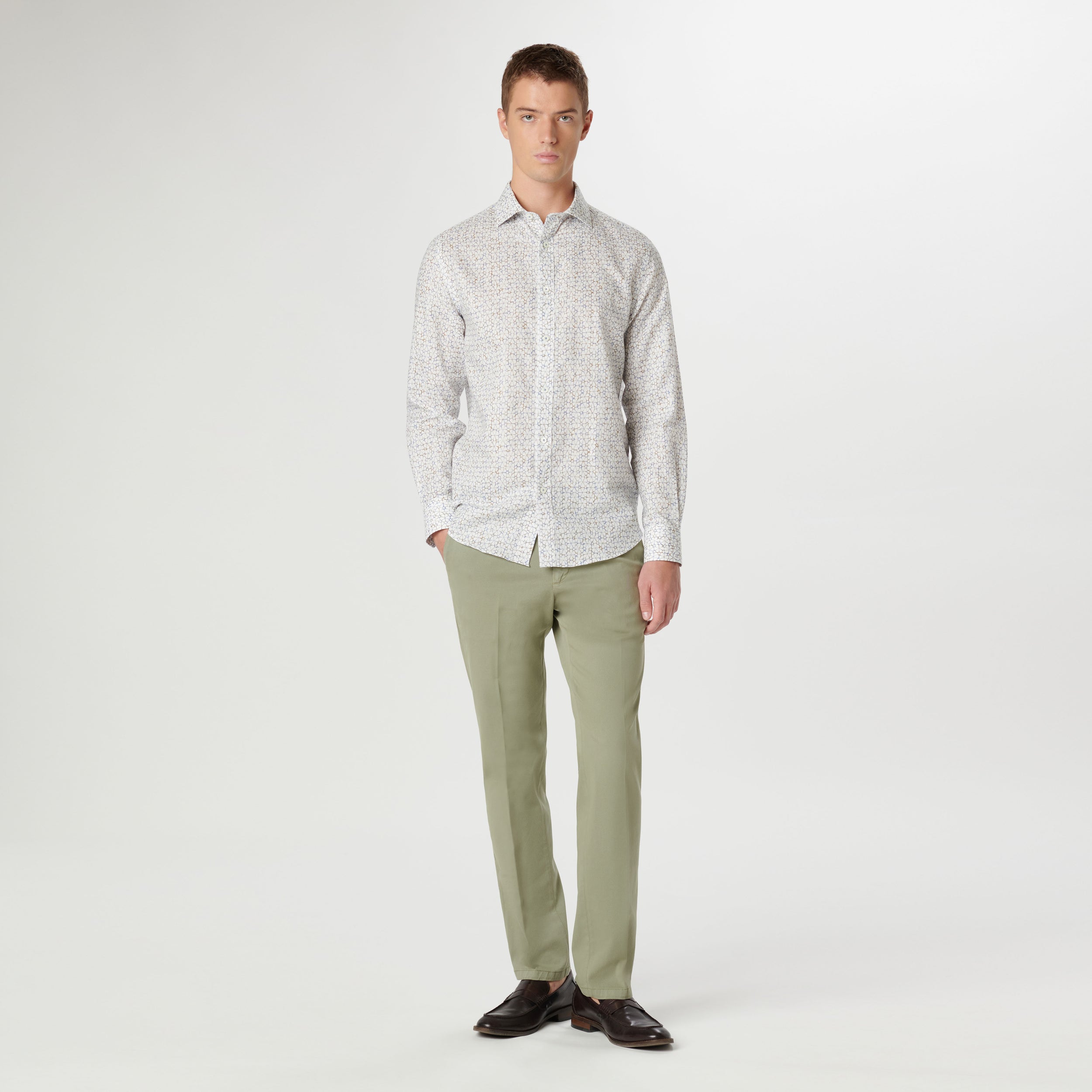 The Axel long-sleeved shirt is crafted from premium linen-cotton blend and features retro floral print, a spread collar, adjustable notched cuffs, and a curved hem.