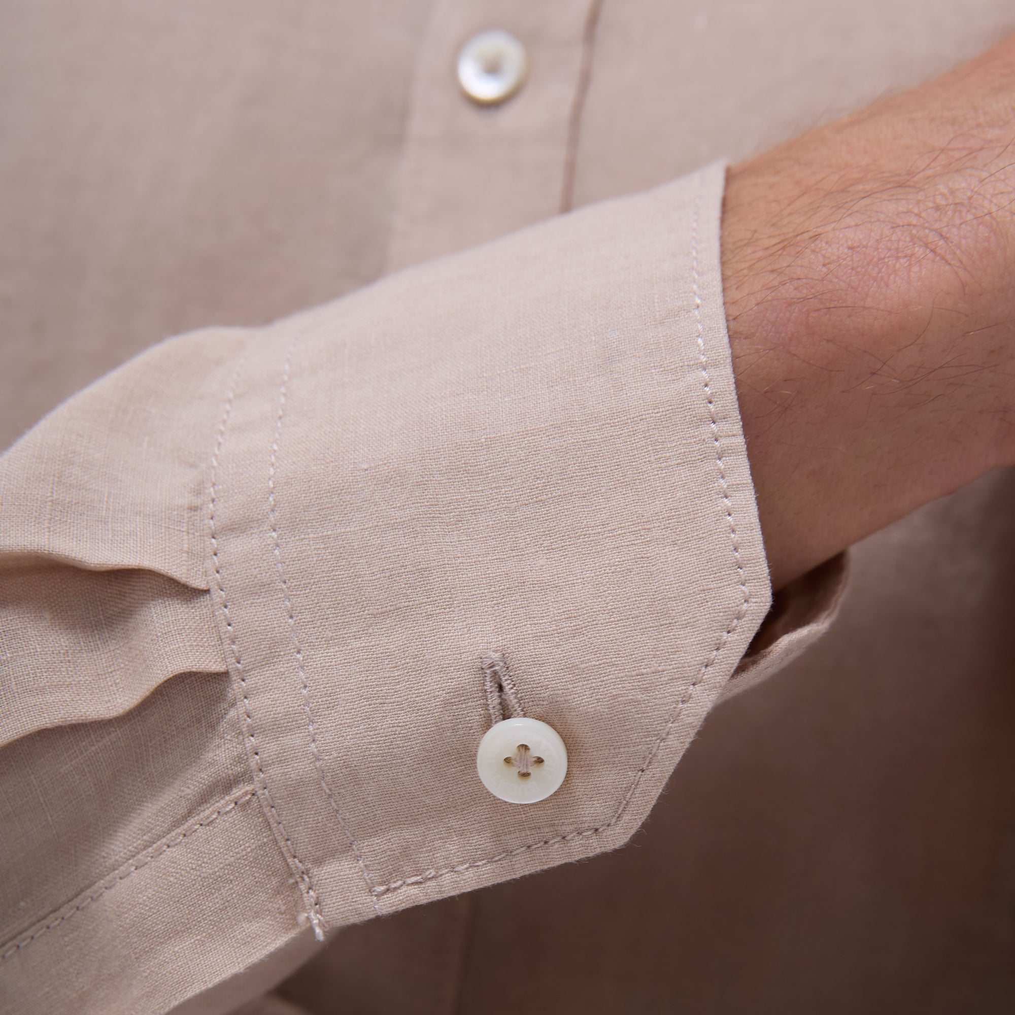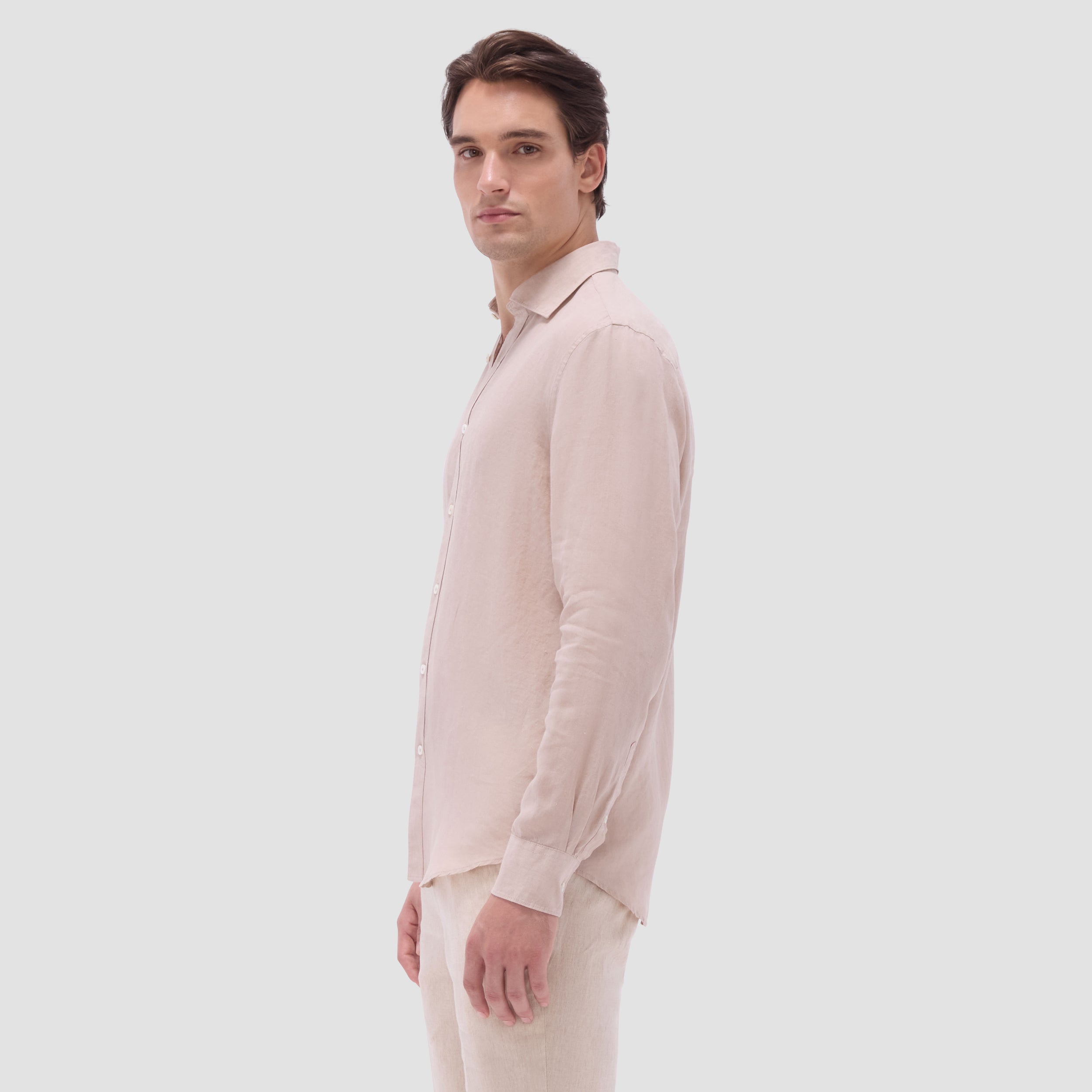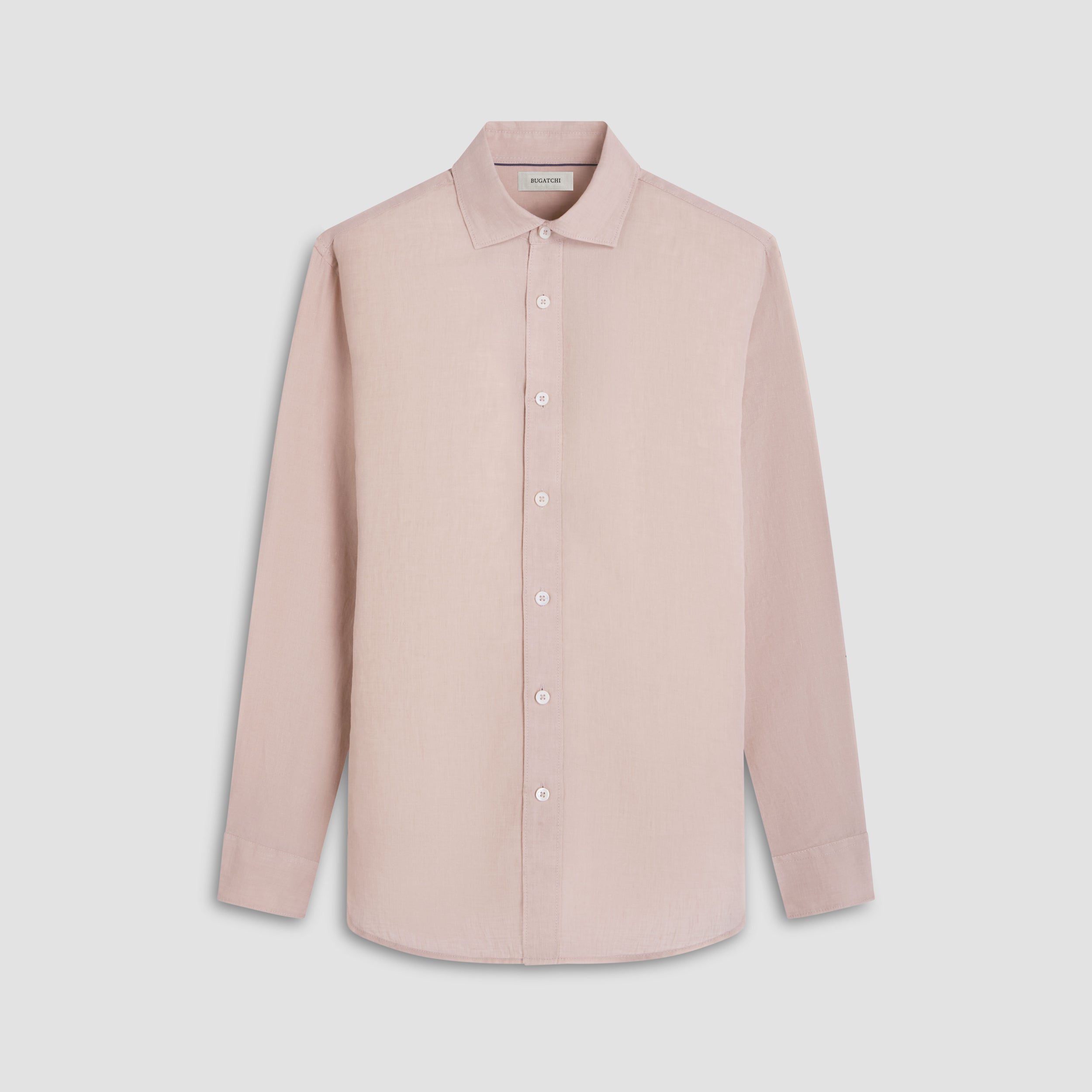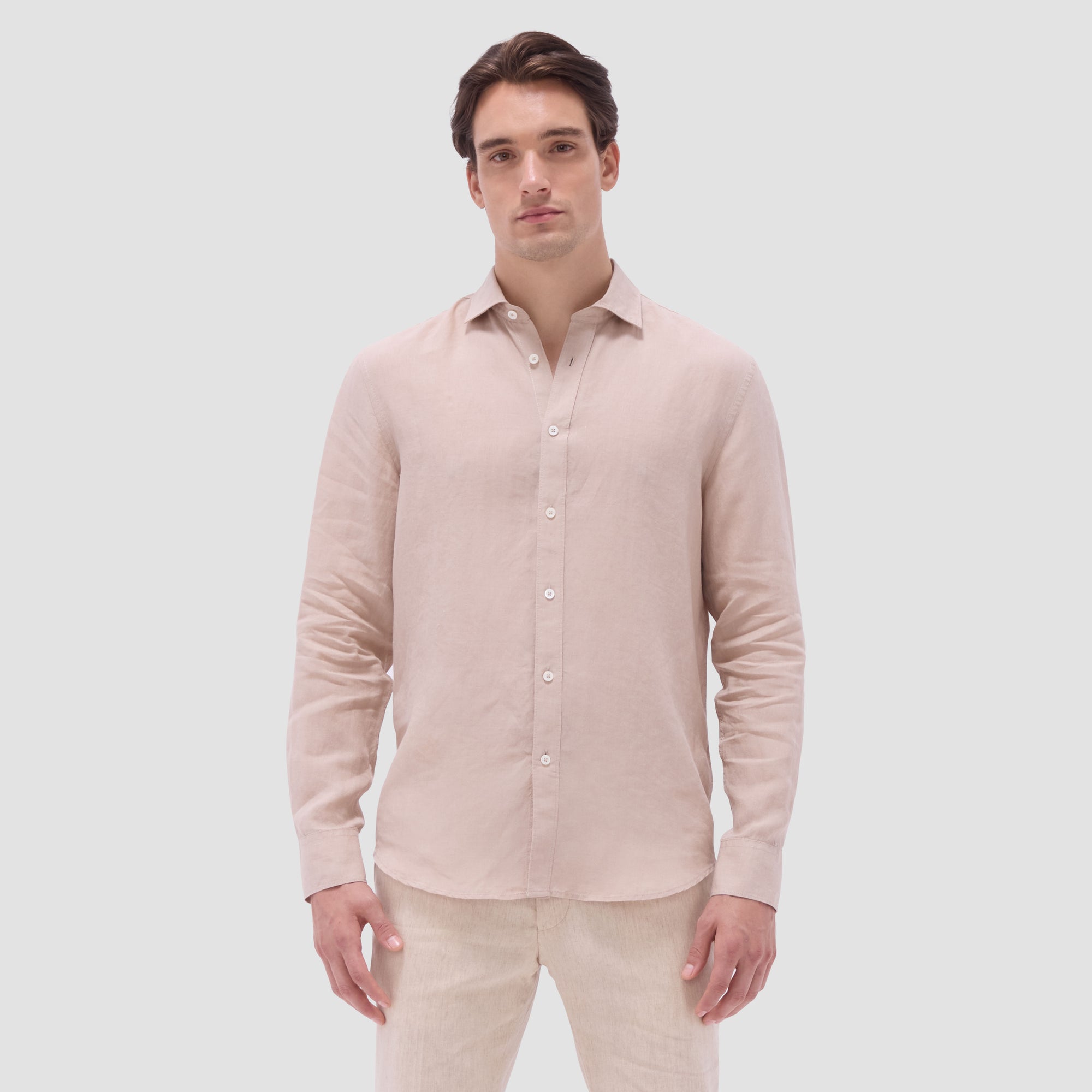 The Axel long-sleeve shirt in solid color is crafted from 100% linen and features a spread collar, mother-of-pearl buttons, a curved hem that can be worn tucked or untucked, and notched cuffs adjustable for a custom fit-wear them snug or loose. The natural texture of linen adds a laid-back, effortless charm to any outfit.