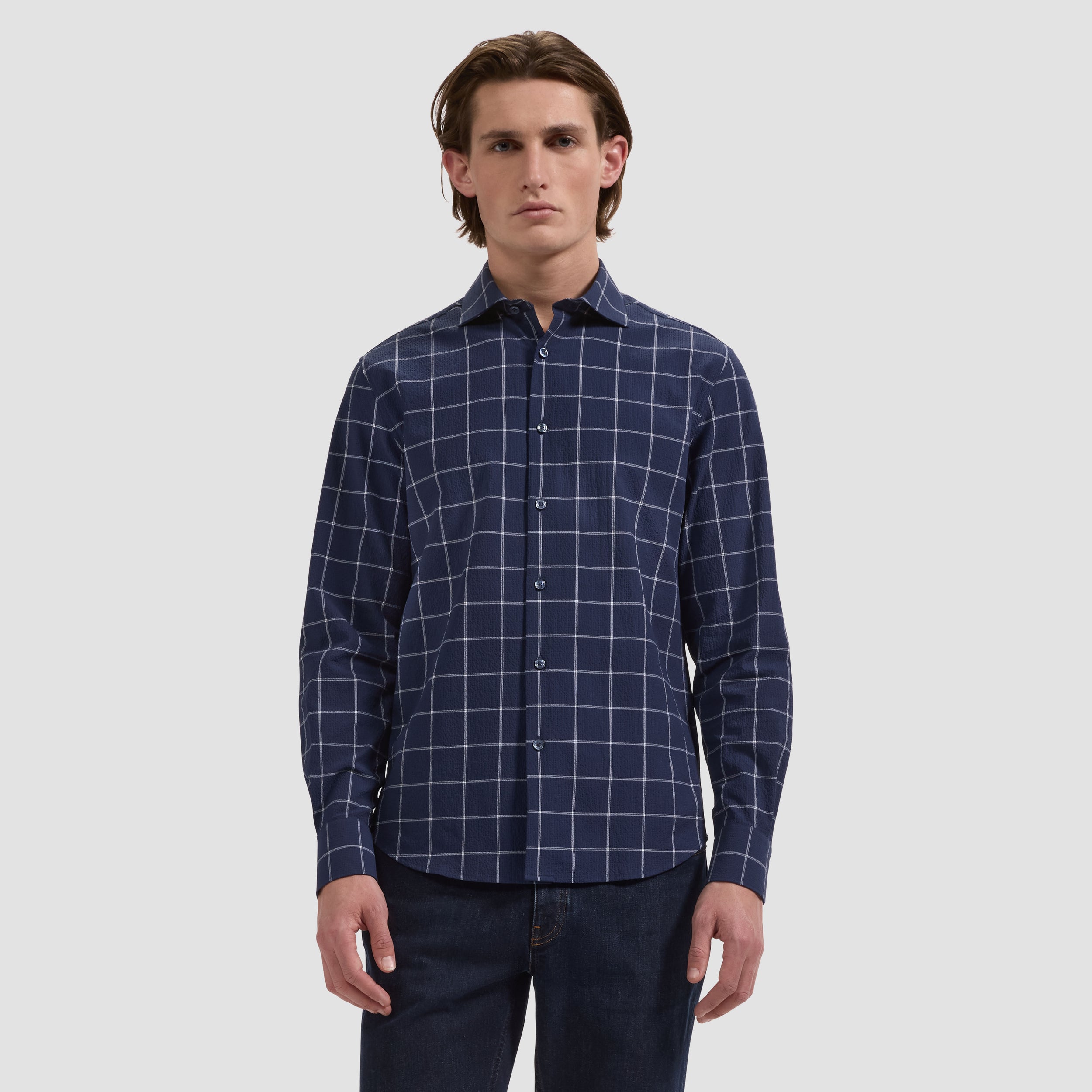 The Axel long-sleeve Comfort Stretch shirt is crafted from premium cotton fabric with added stretch for all-day ease, in a windowpane check pattern. Designed with a spread collar, genuine mother-of-pearl buttons, and adjustable notched cuffs that also convert for cufflinks. A versatile shirt that looks polished whether tucked or untucked.