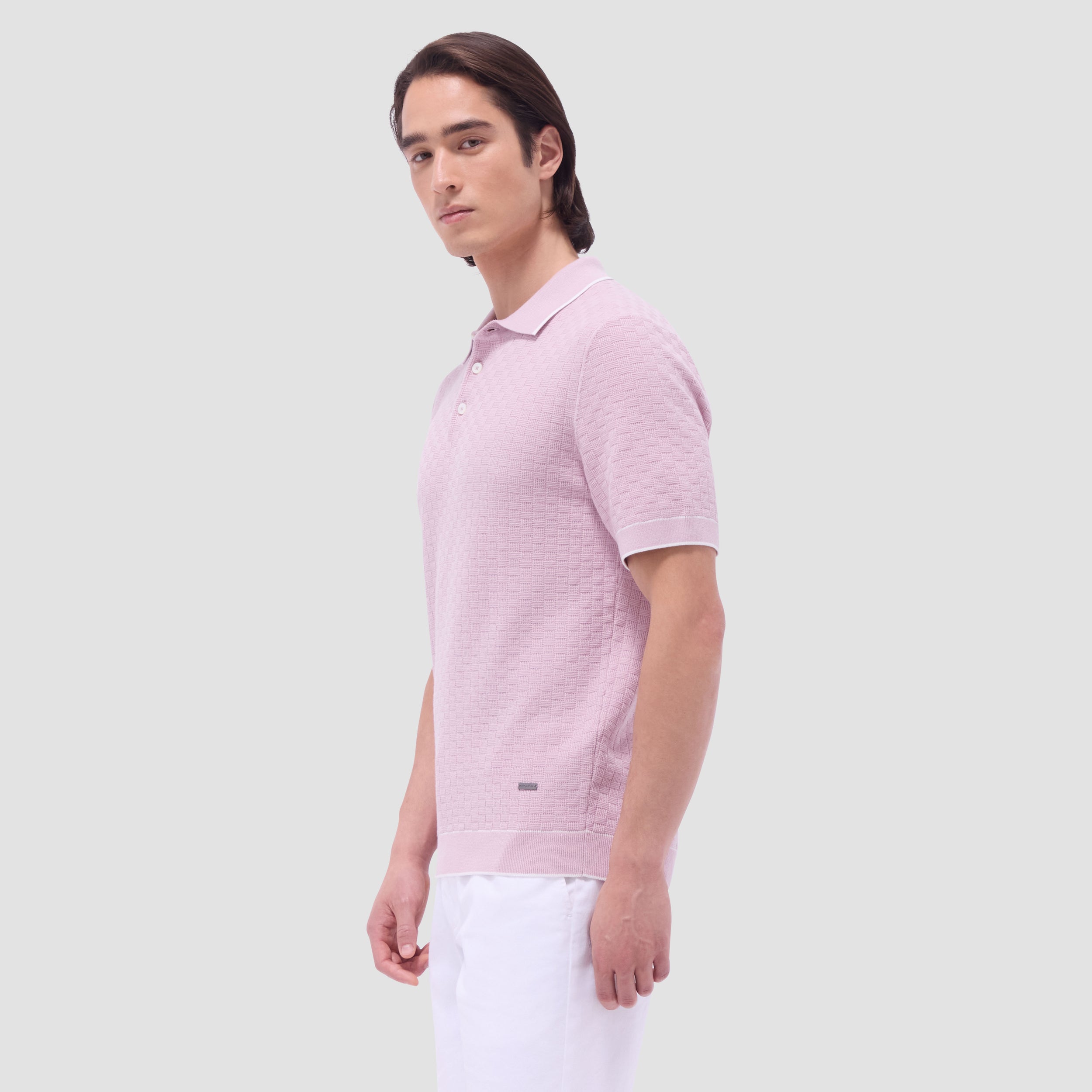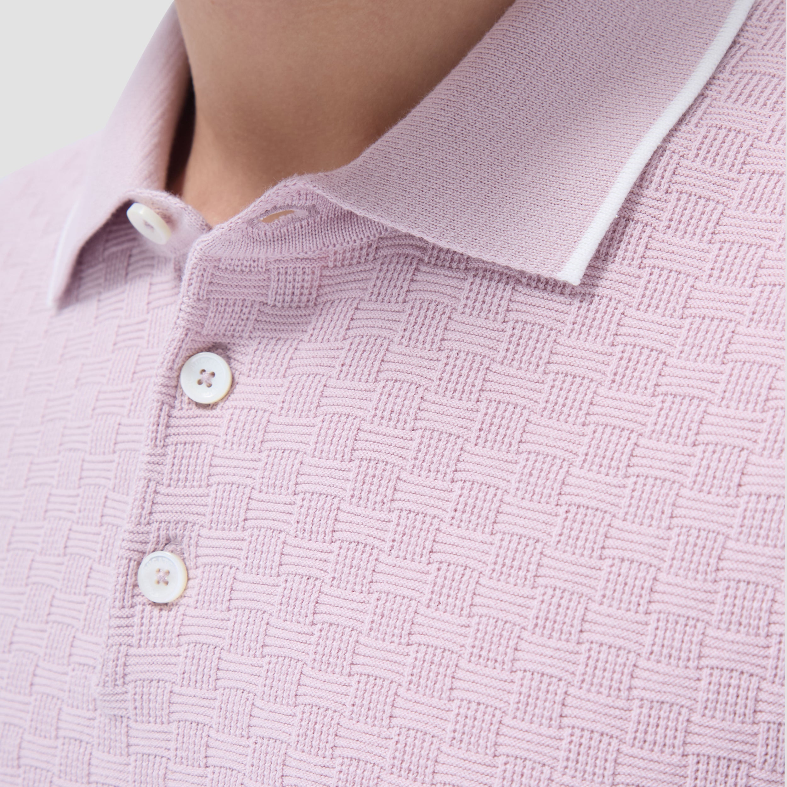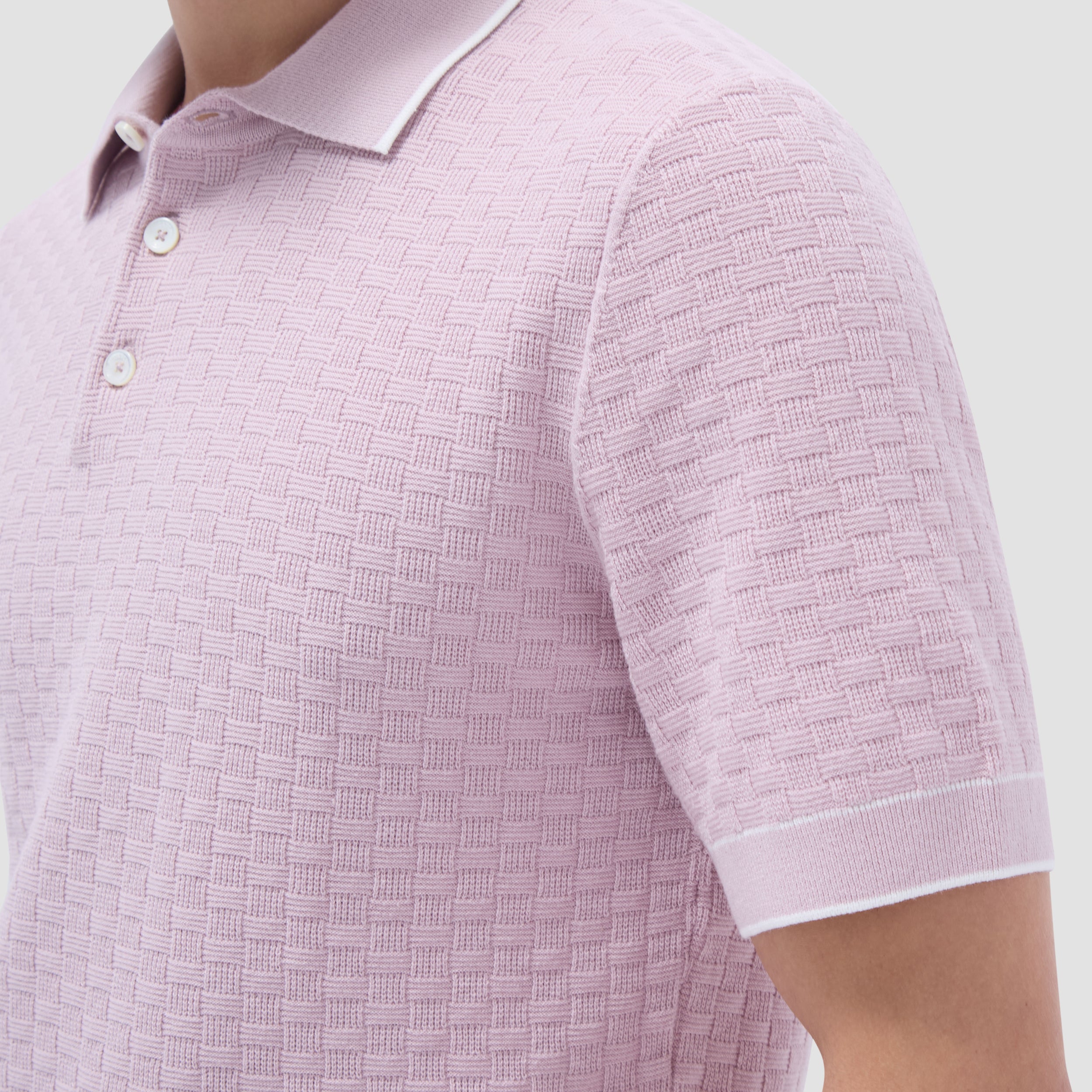 This stylish basket stitch three-button polo sweater features short sleeves and is crafted from a comfortable cotton blend, elevated by a solid ribbed collar, cuffs, and waist with contrasting tipping detail. The textured basket stitch pattern adds depth and visual interest, making it a classic versatile piece perfect for layering or wearing on its own.