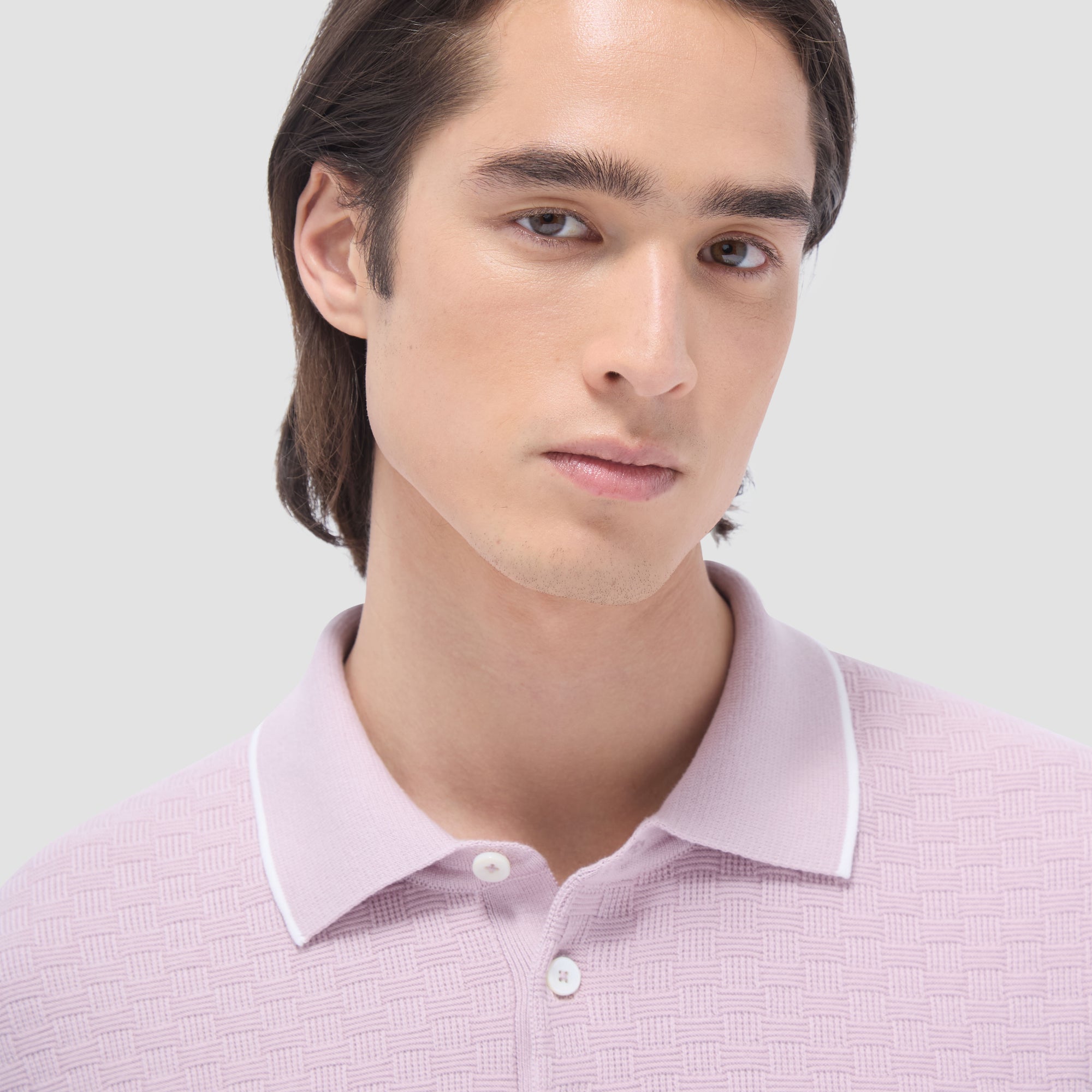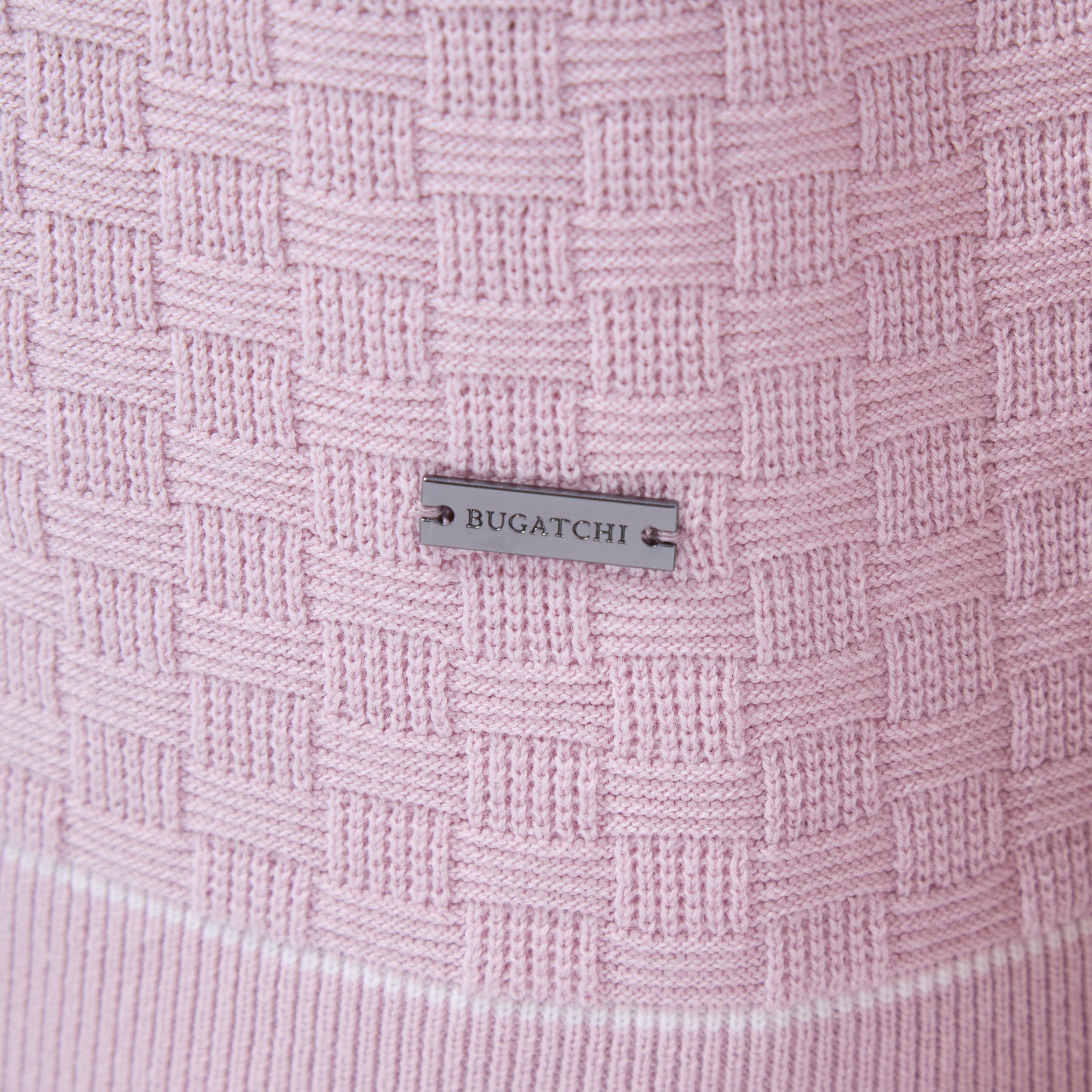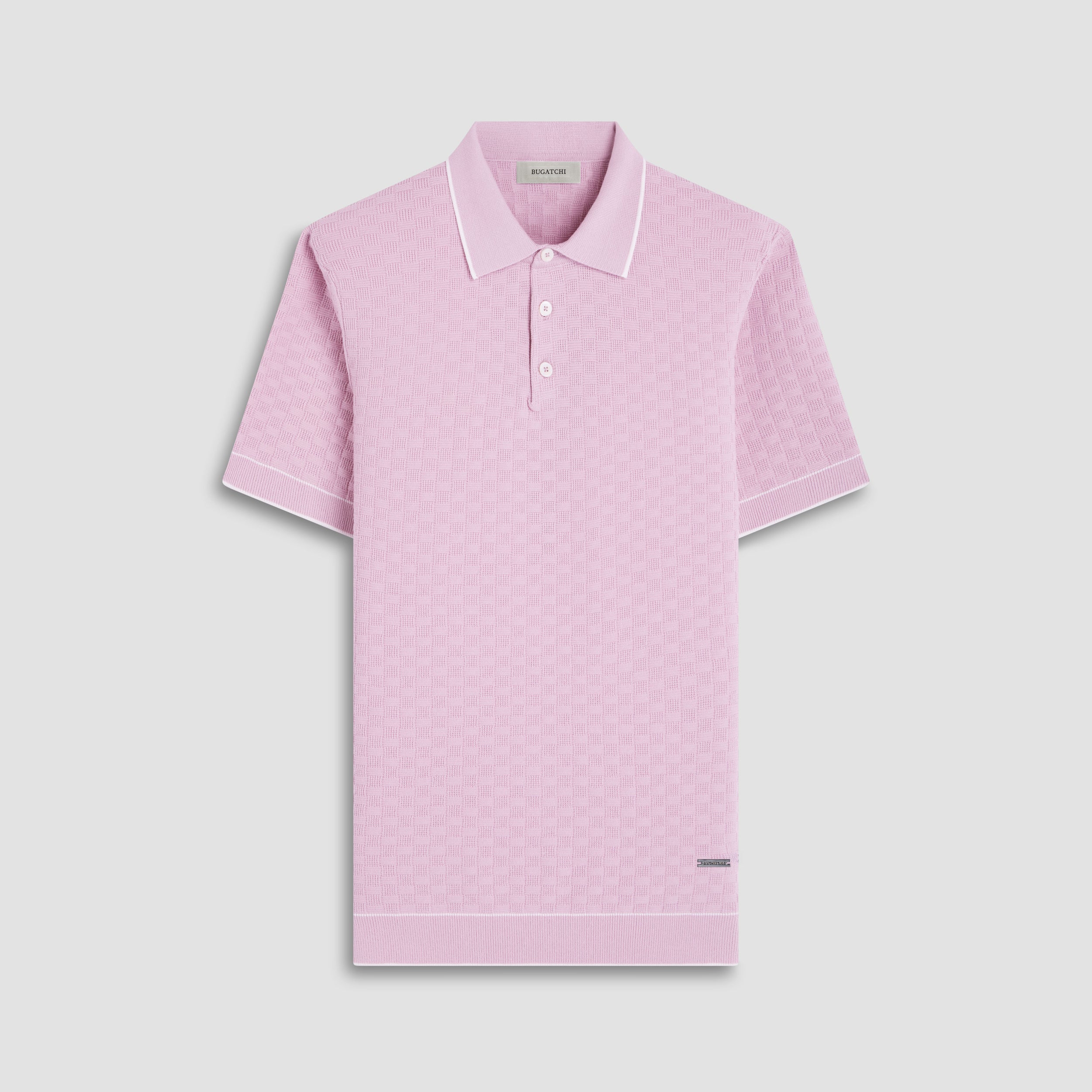 This stylish basket stitch three-button polo sweater features short sleeves and is crafted from a comfortable cotton blend, elevated by a solid ribbed collar, cuffs, and waist with contrasting tipping detail. The textured basket stitch pattern adds depth and visual interest, making it a classic versatile piece perfect for layering or wearing on its own.