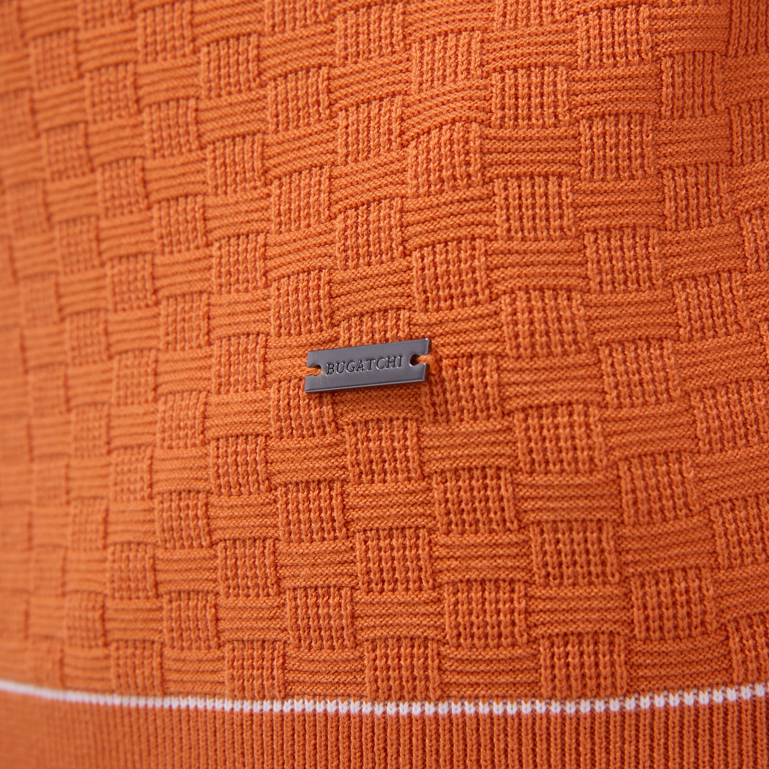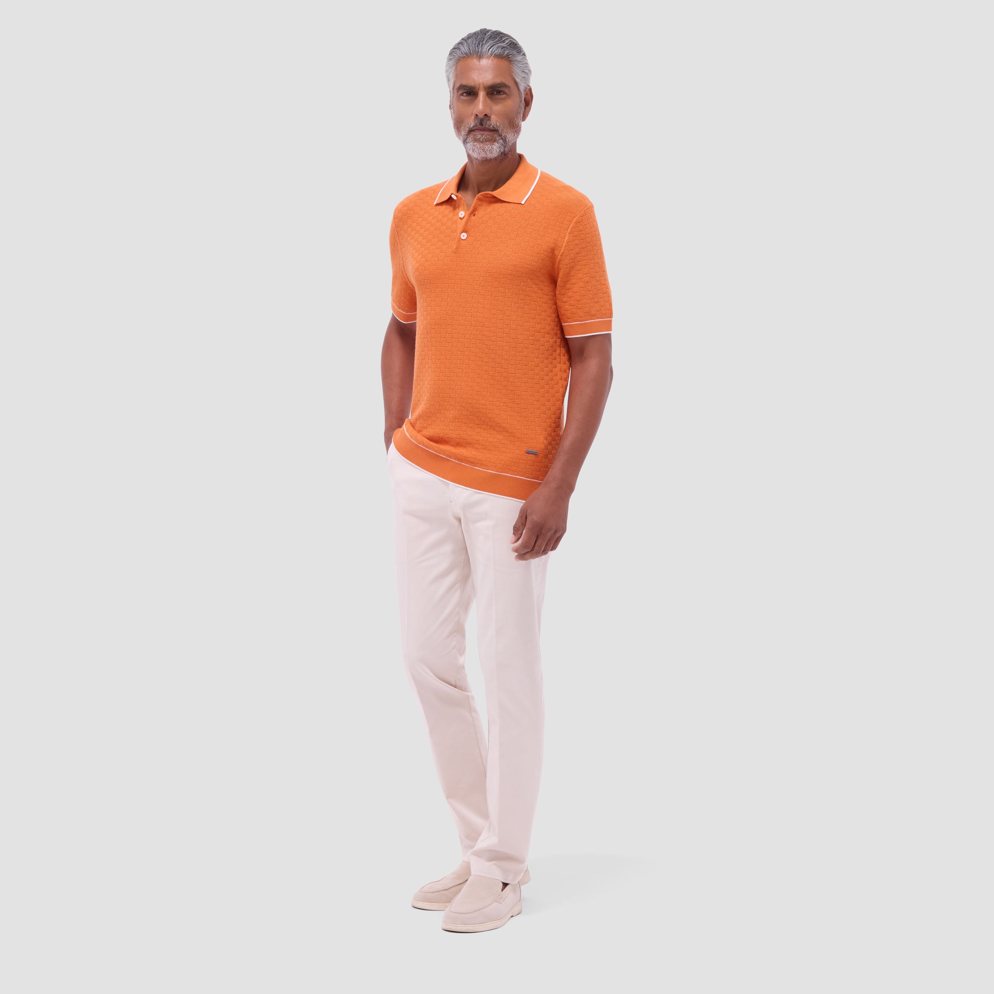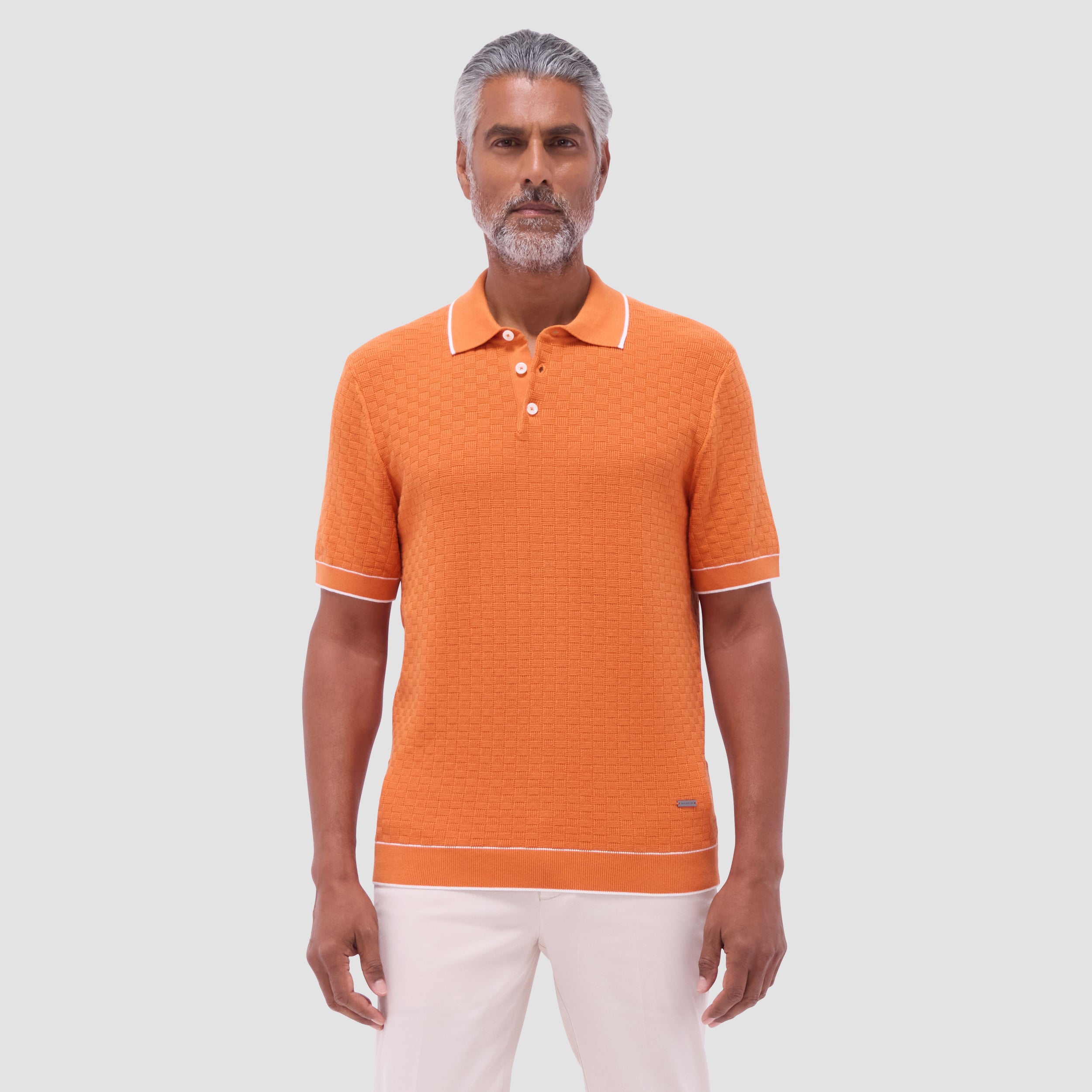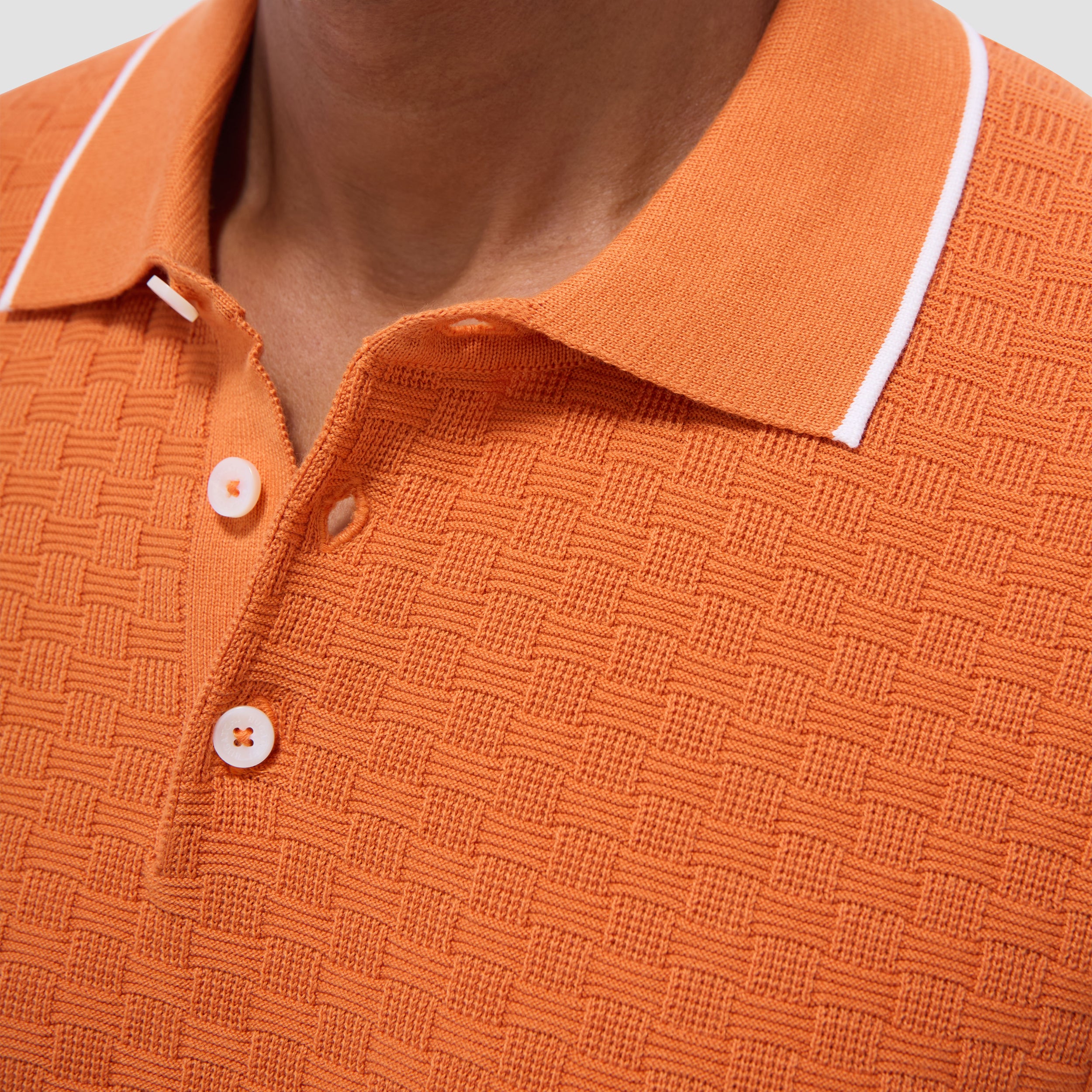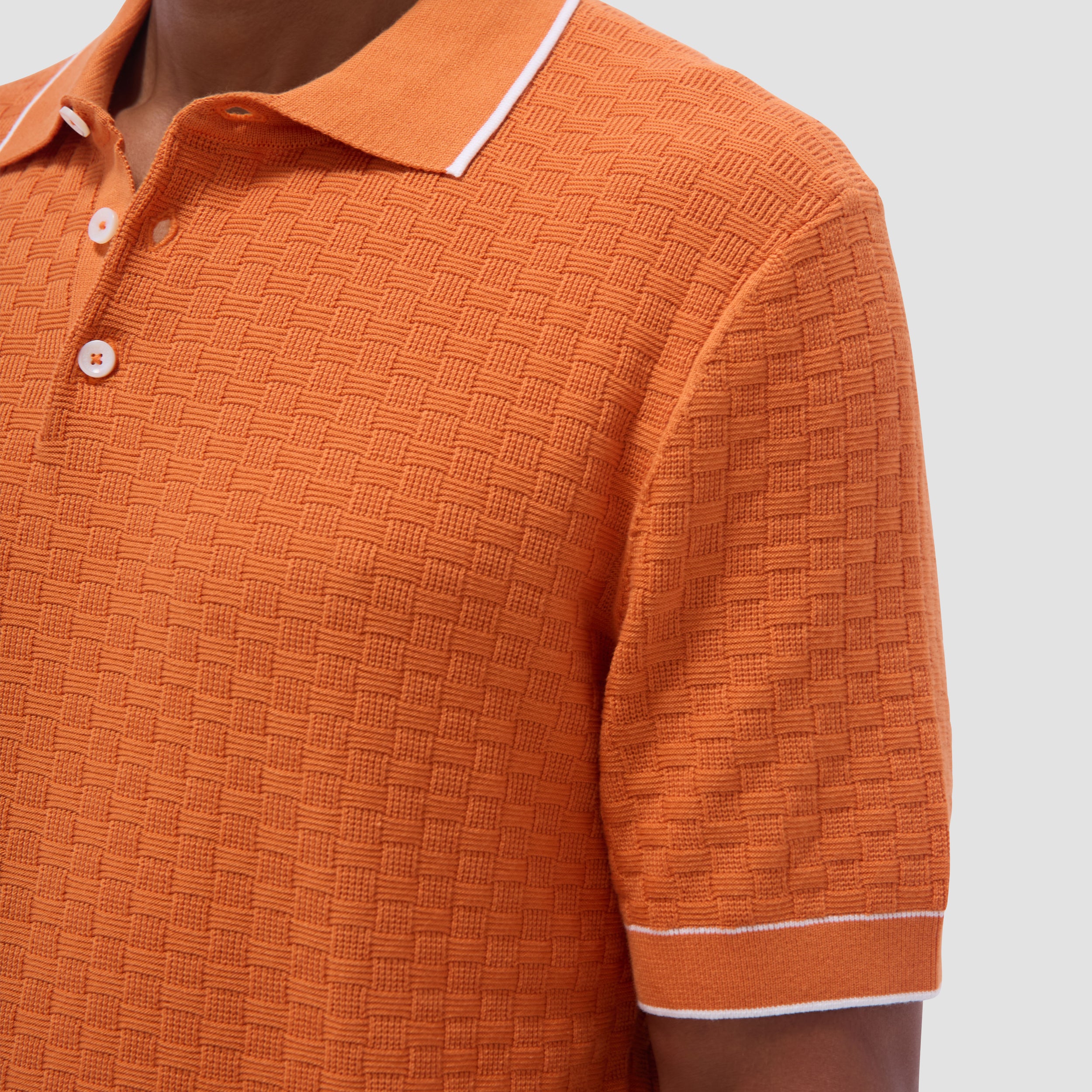 This stylish basket stitch three-button polo sweater features short sleeves and is crafted from a comfortable cotton blend, elevated by a solid ribbed collar, cuffs, and waist with contrasting tipping detail. The textured basket stitch pattern adds depth and visual interest, making it a classic versatile piece perfect for layering or wearing on its own.