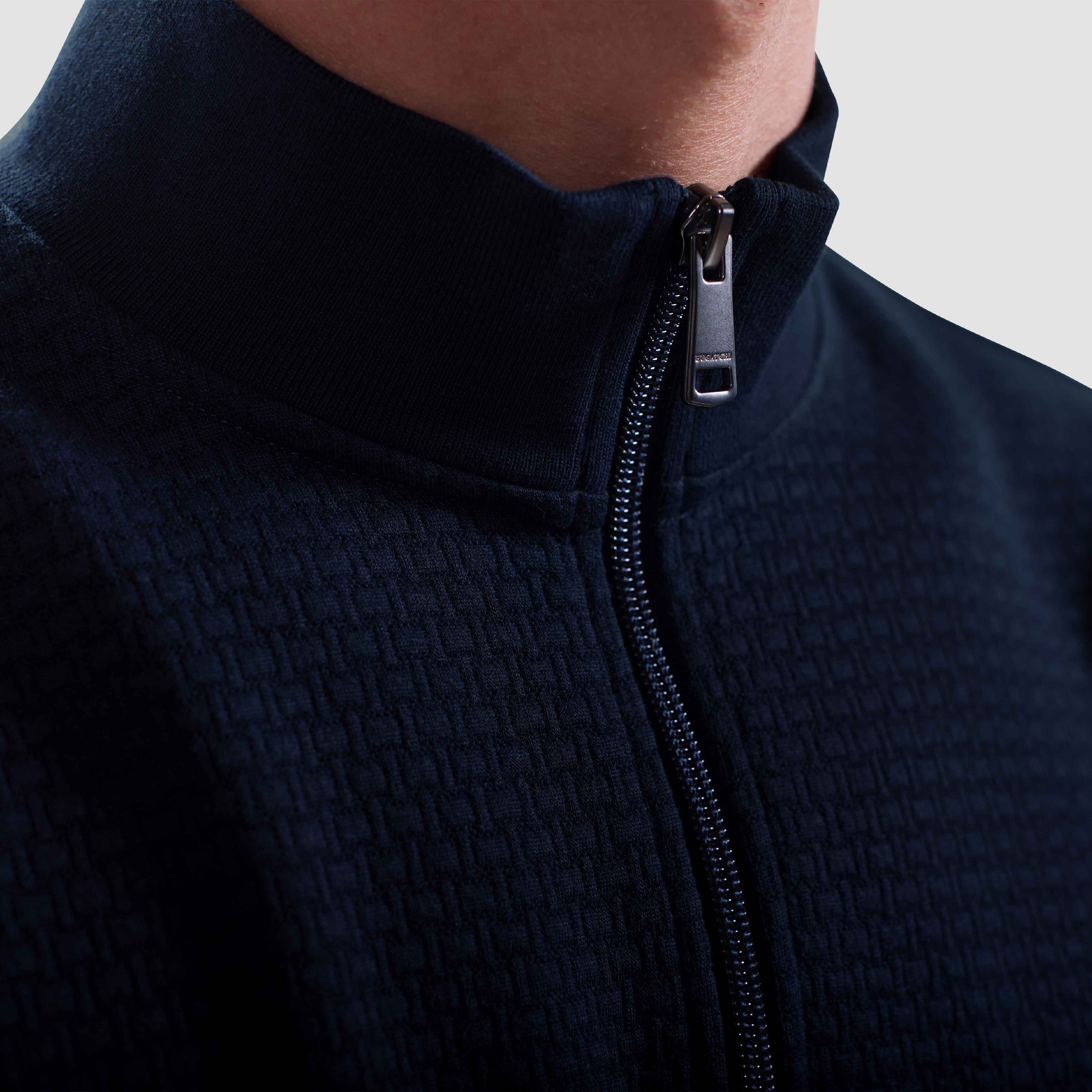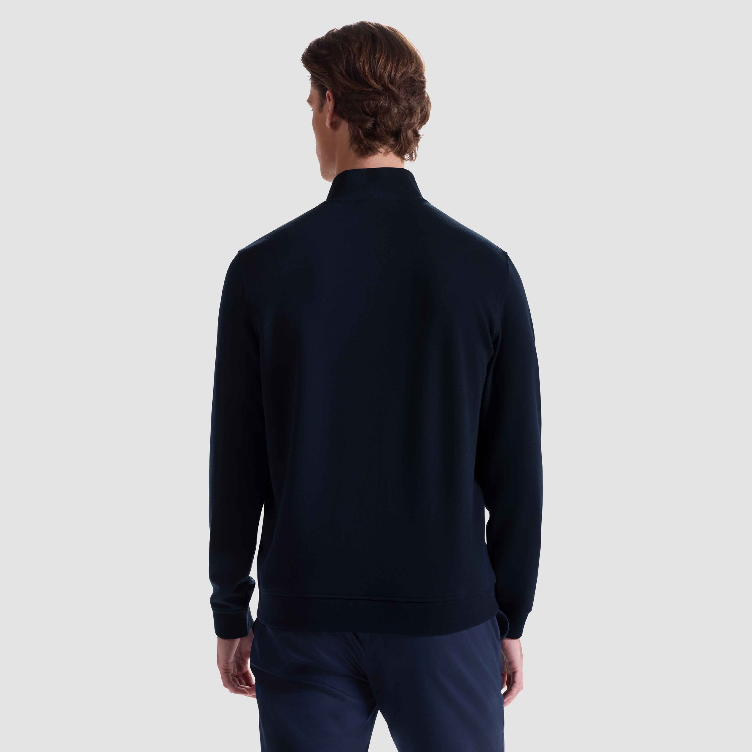 Crafted from premium performance fabric, this long sleeve quarter zip pullover features a jacquard basketweave front for added dimension, contrasted by smooth jersey-knit sleeves and back. The solid ribbed mock neck, cuffs, and hem provide a structured finish, balancing texture and simplicity. A refined piece that merges style and comfort seamlessly.