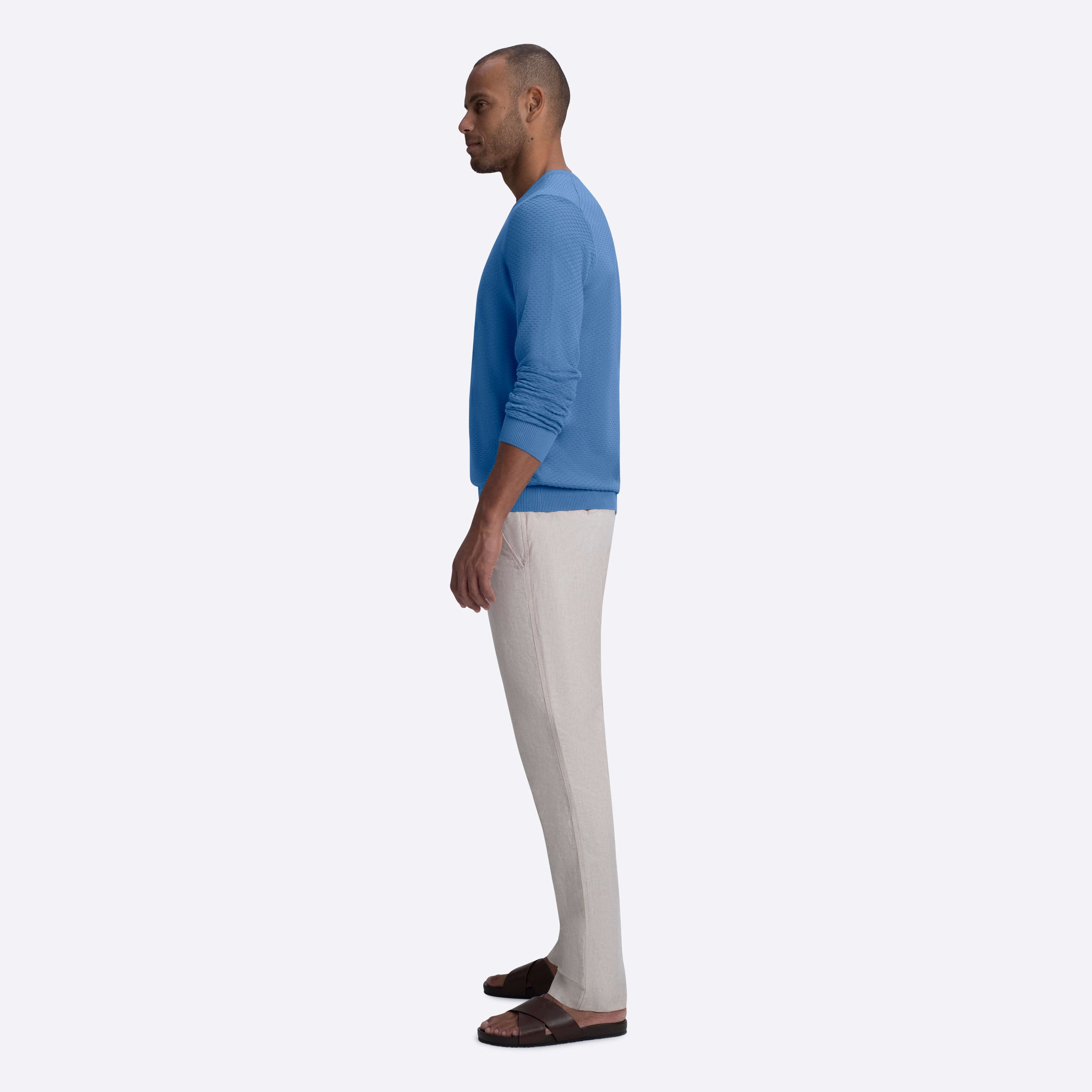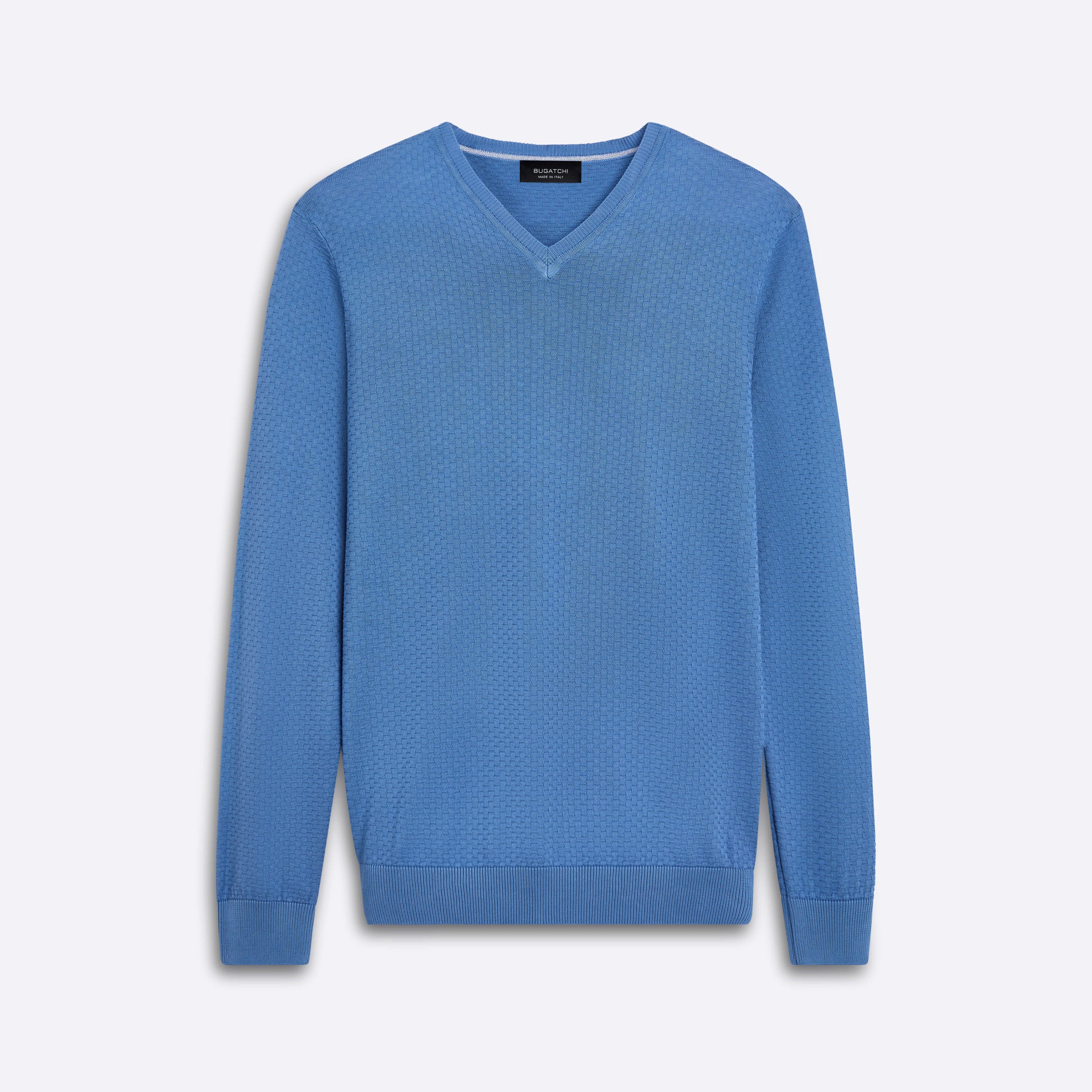 Basketweave knit long sleeve V-neck sweater in 100% cotton with rib knit collar, cuffs and waistband. Made in Italy.