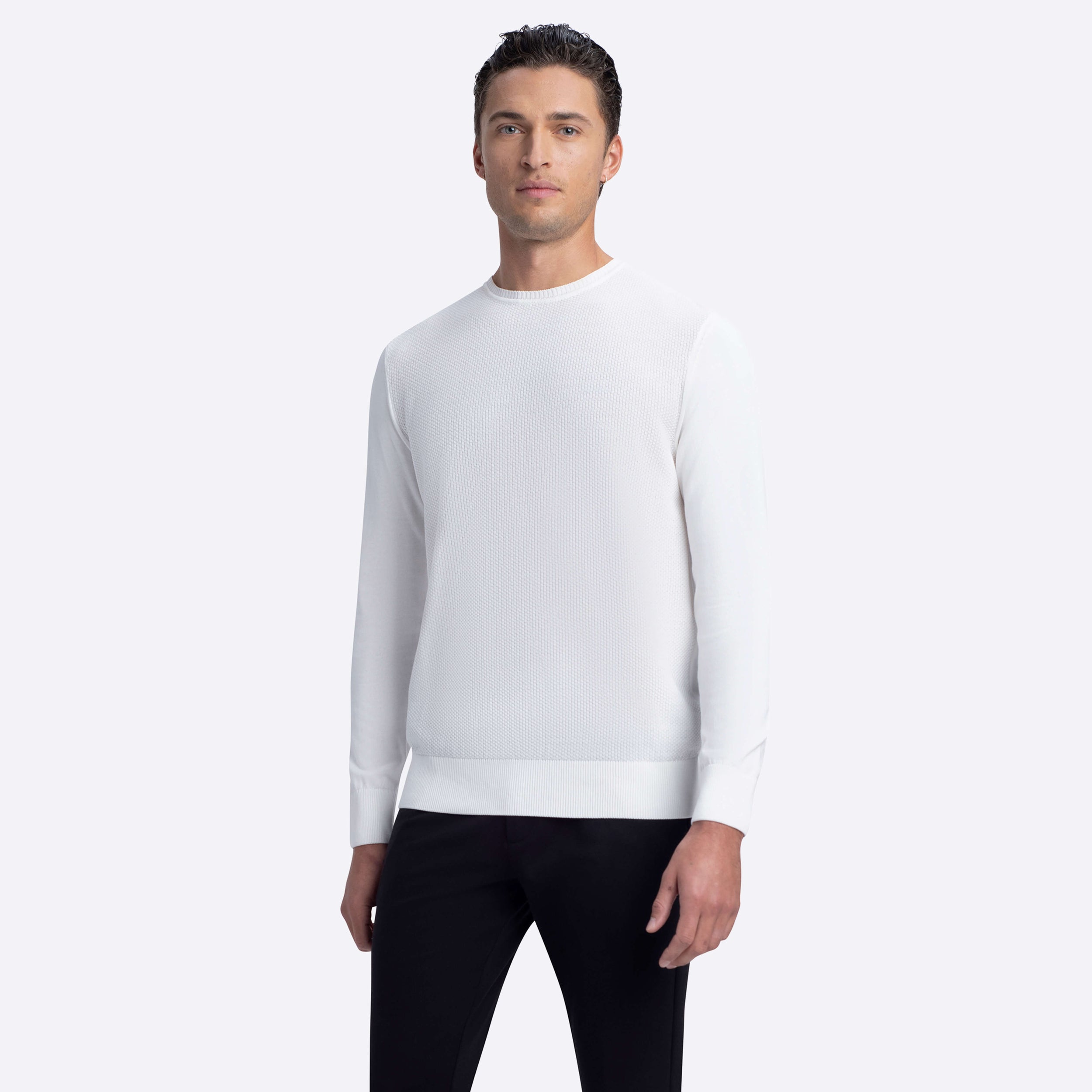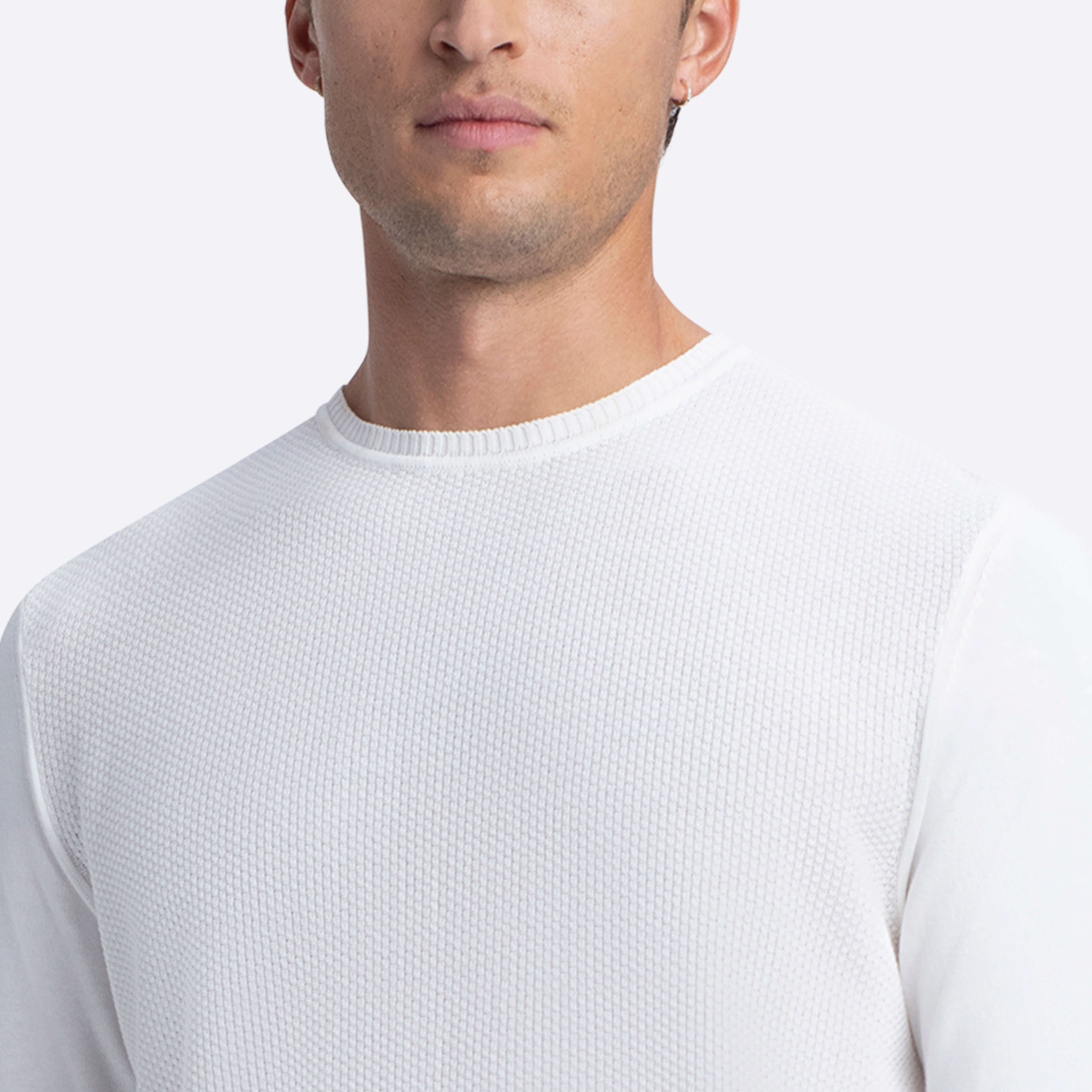 Bird's Eye knit long sleeve crew neck sweater in 100% cotton with solid rib knit cuffs and waistband. Made in Italy.