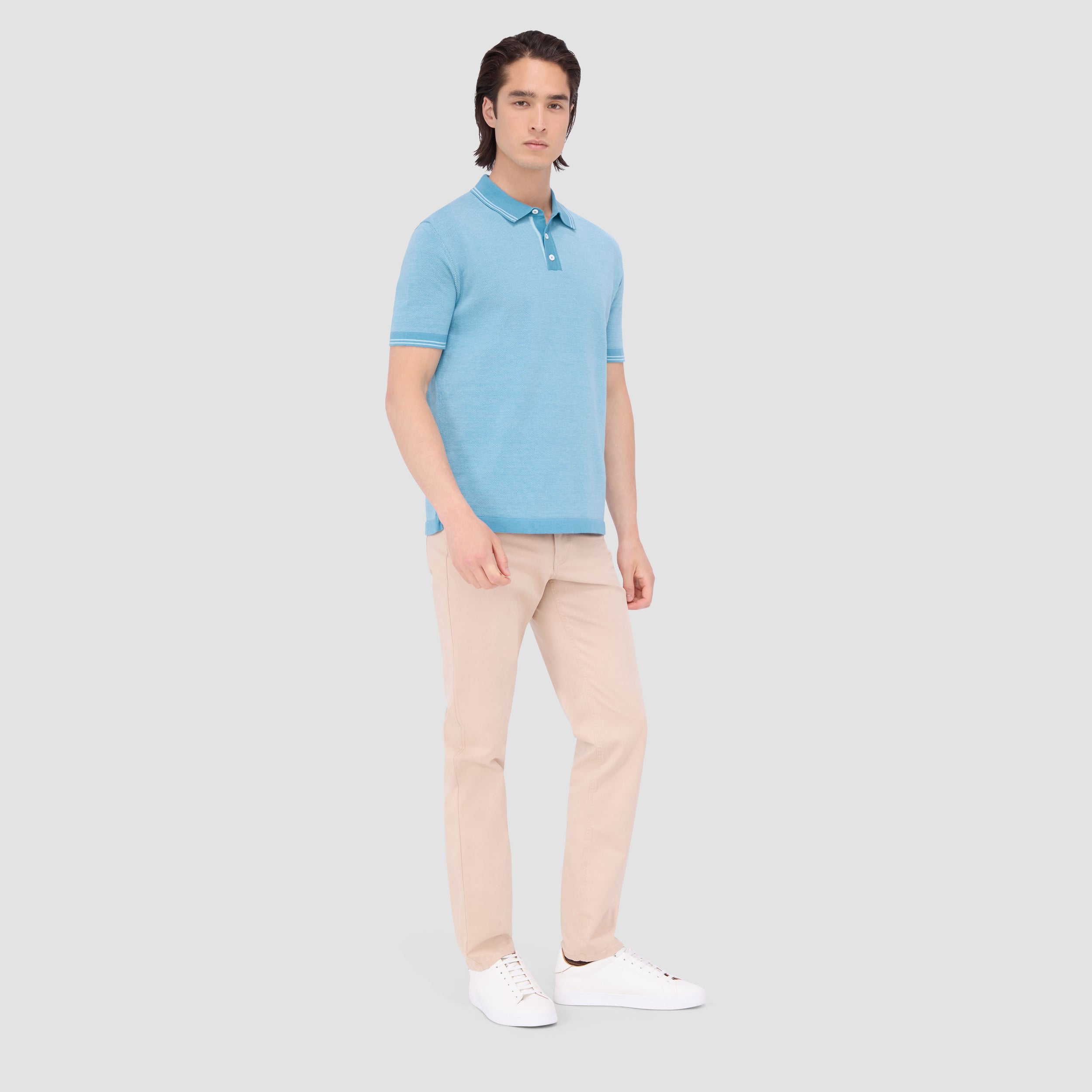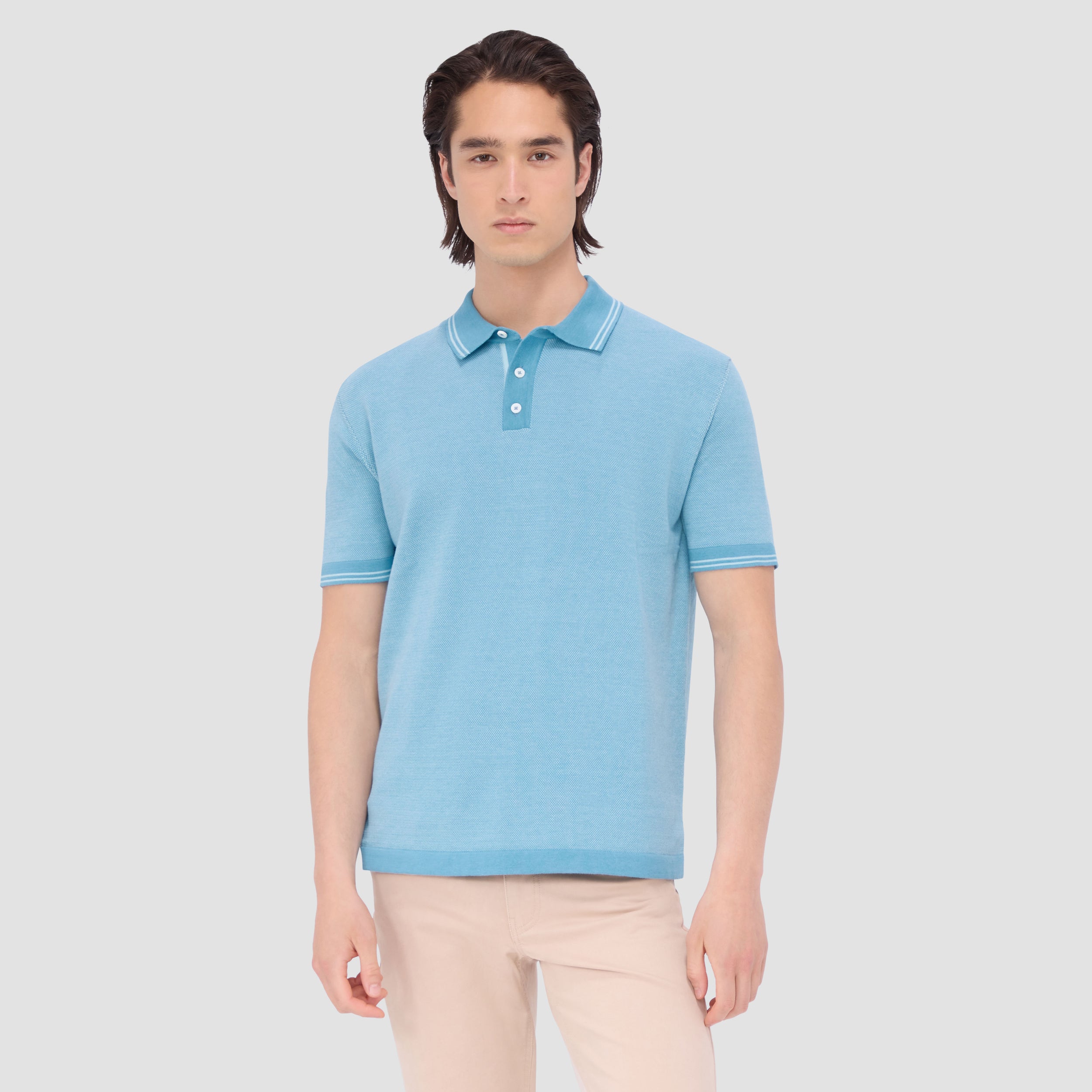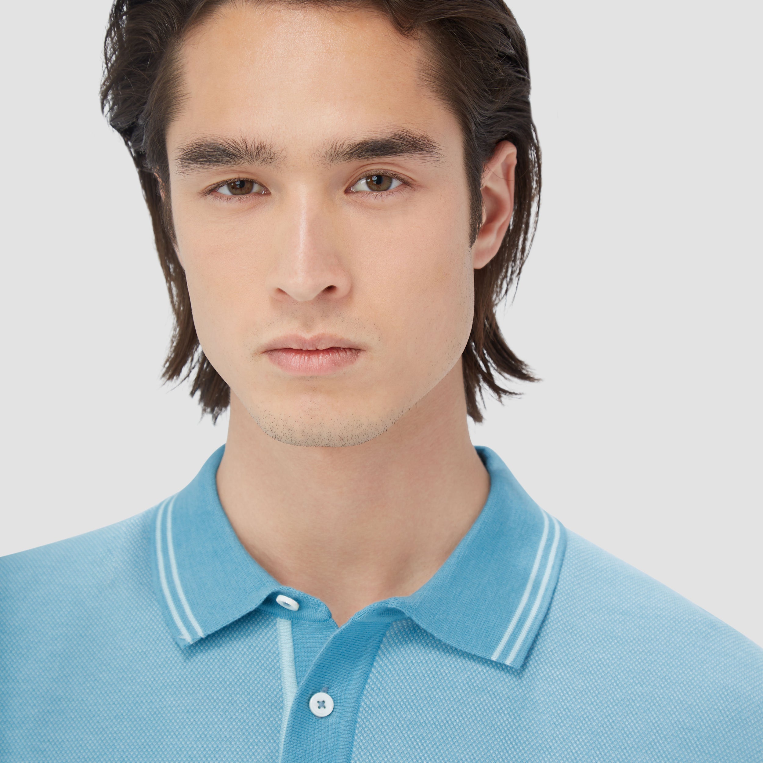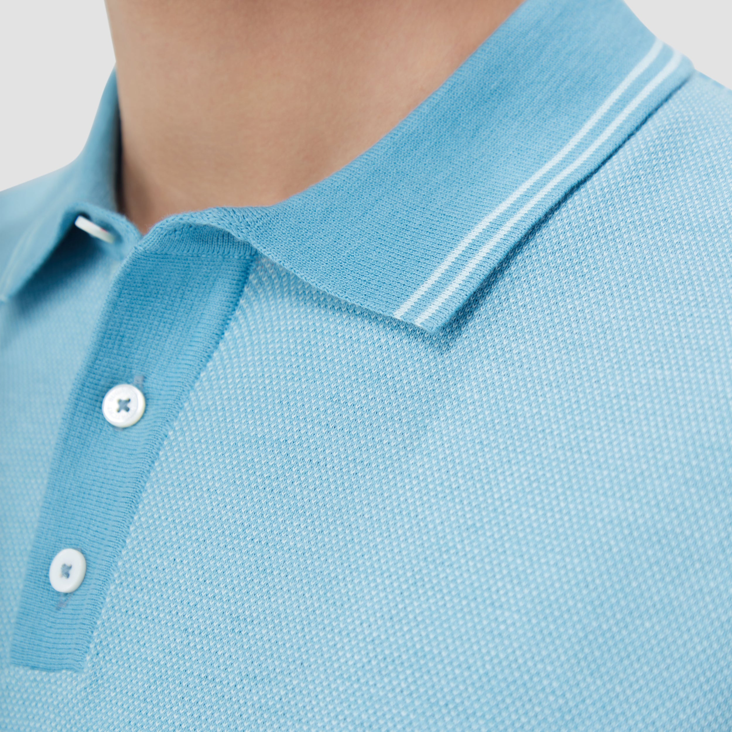 This short-sleeved polo sweater crafted from a blend of cotton and silk in a bird's eye stitch jacquard offers softness, breathability, unmatched comfort, and elegance It features a three-button placket, contrast double-tipped collar and armbands, and an open thin rib hem with side vents for ease of movement and ventilation.