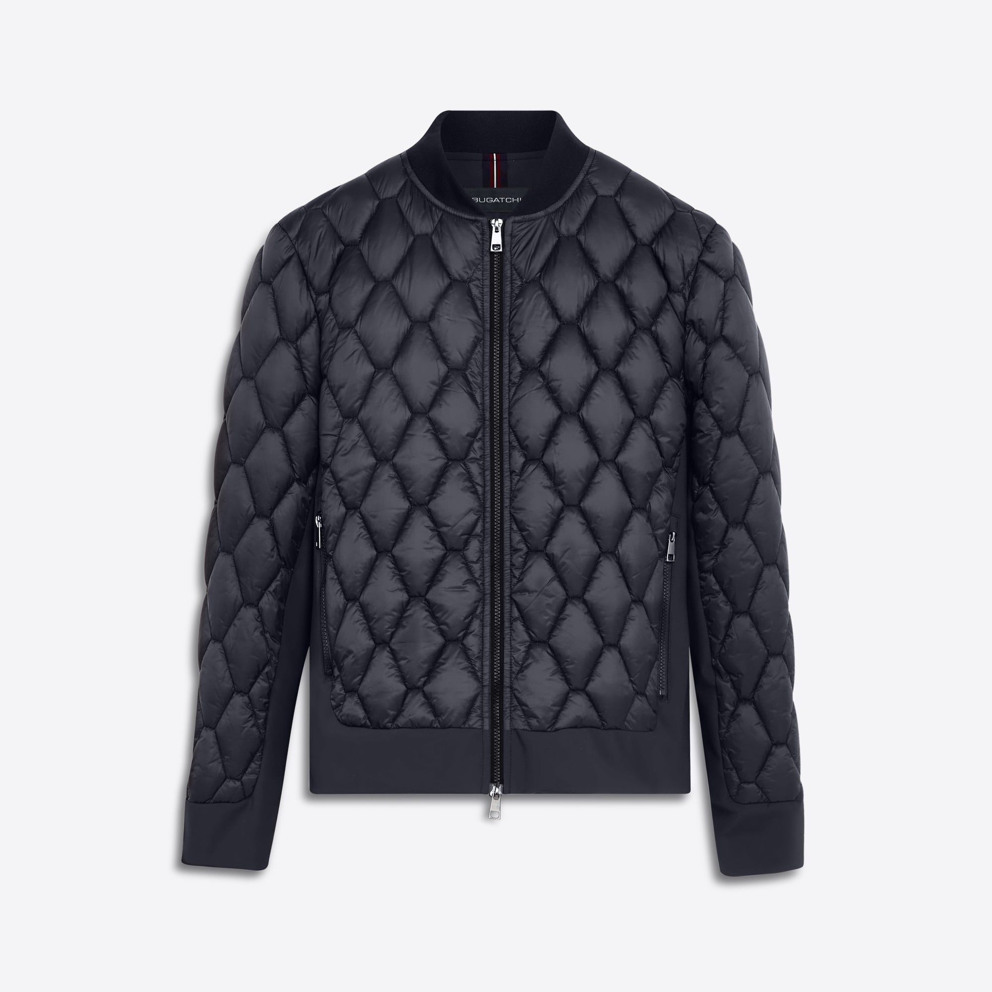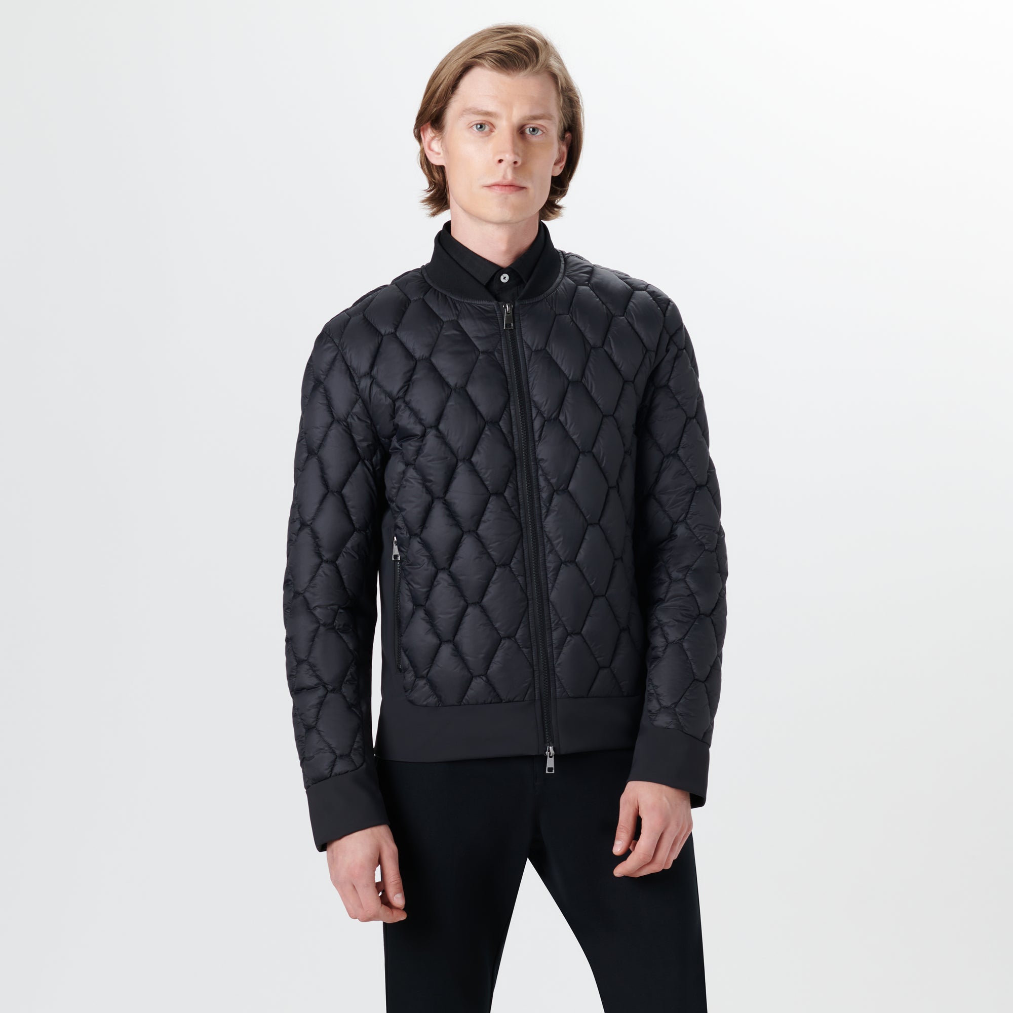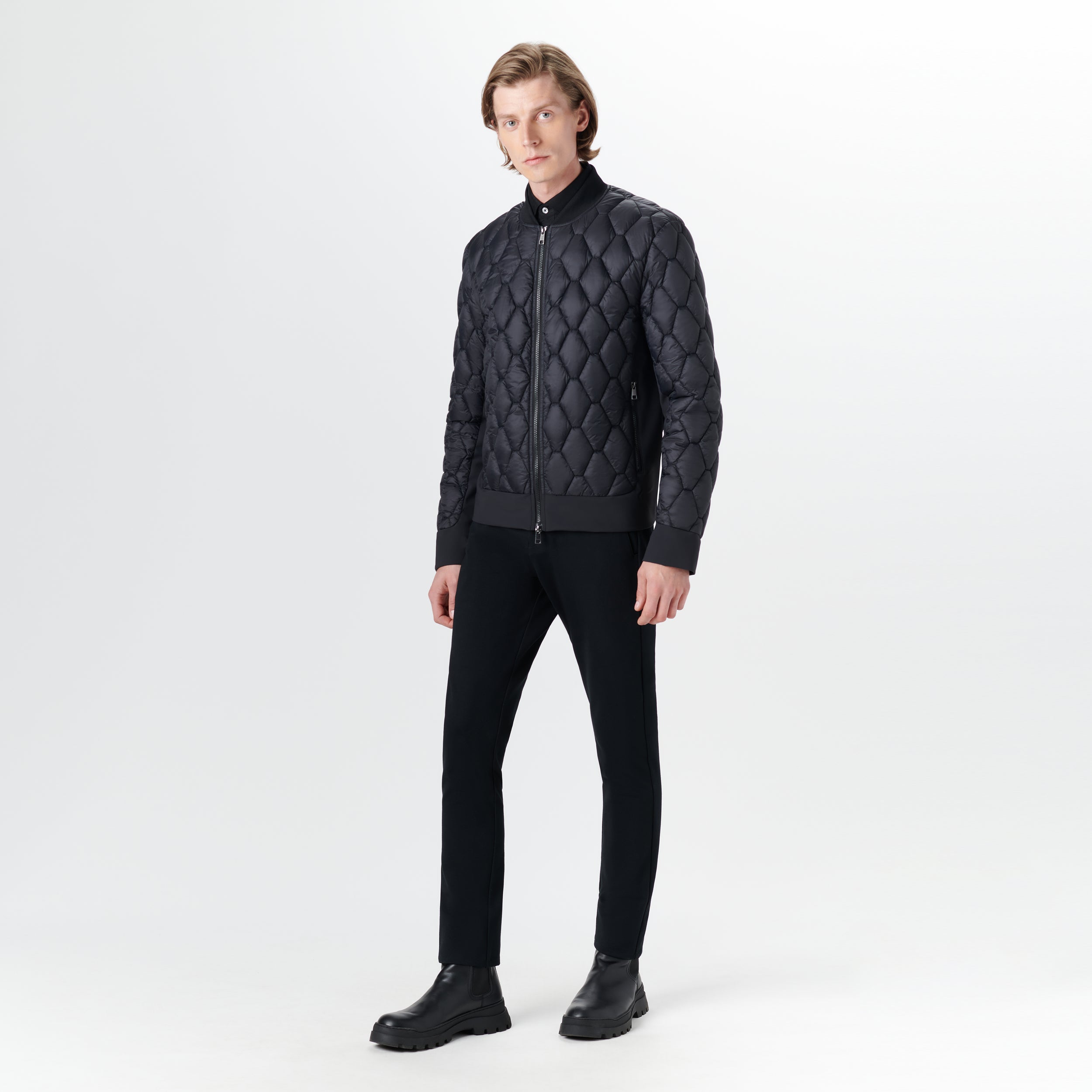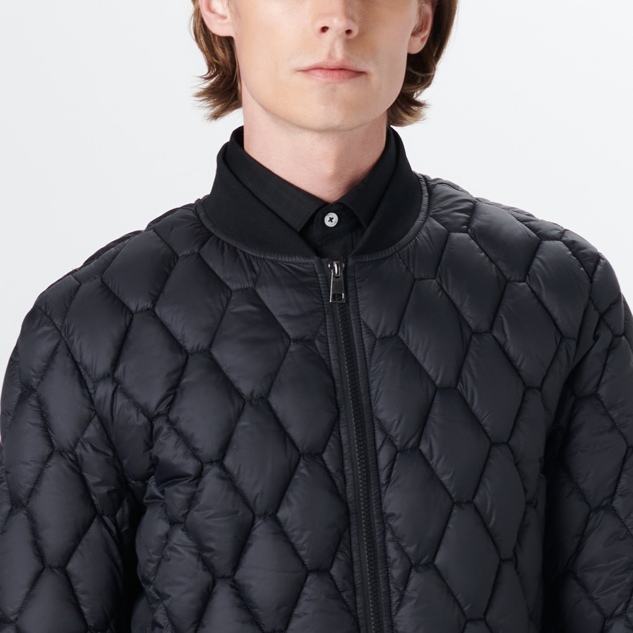Water repellent, honeycomb quilted bomber jacket with certified Sorona Aura filling, baseball collar, two-way zipper closure and side zip pockets. Sorona Aura is a lightweight and breathable insulation with long-lasting shape retention and warmth. Outerwear made from this innovative and partially plant-based insulation benefit from exceptional breathability and comfort, at a lower environmental footprint.