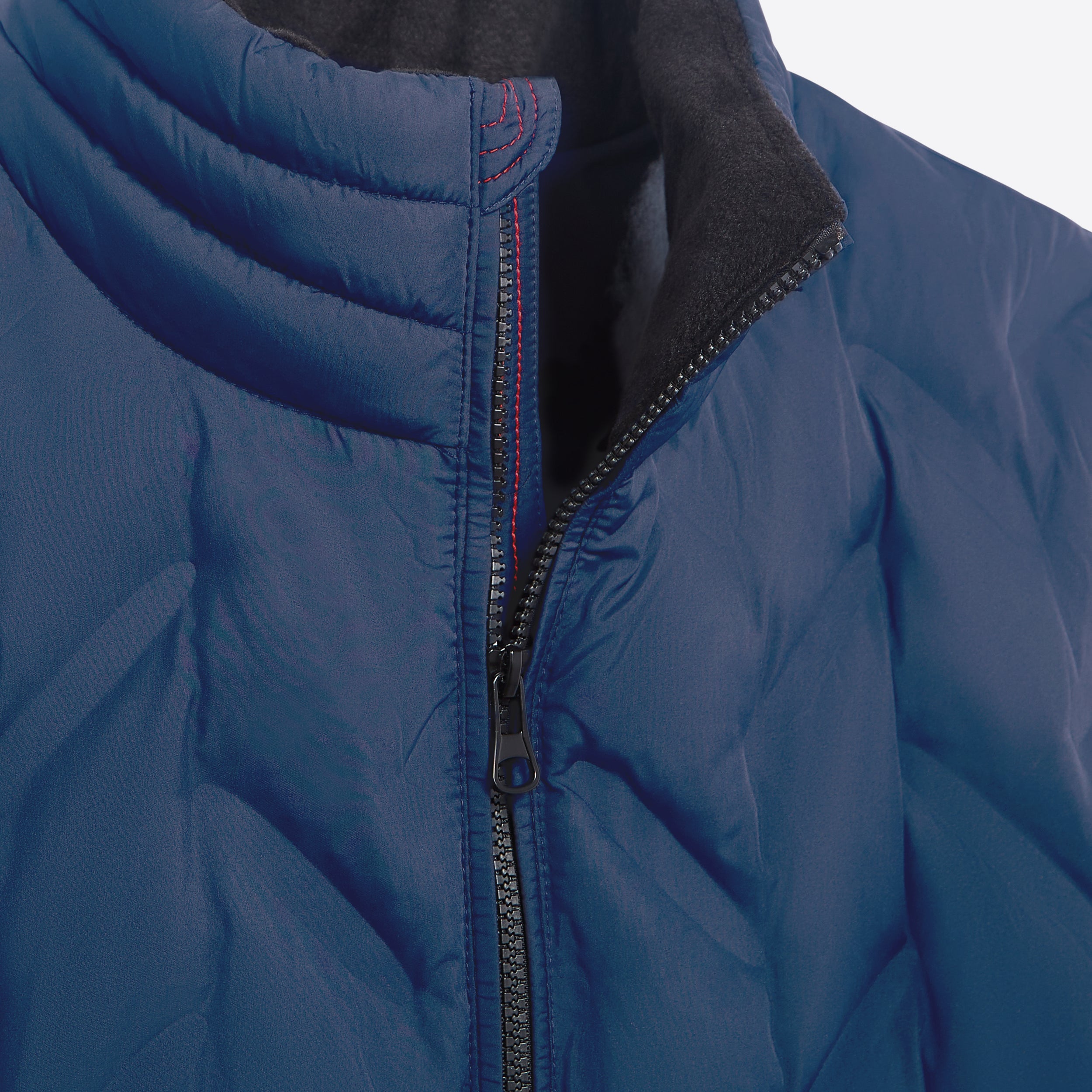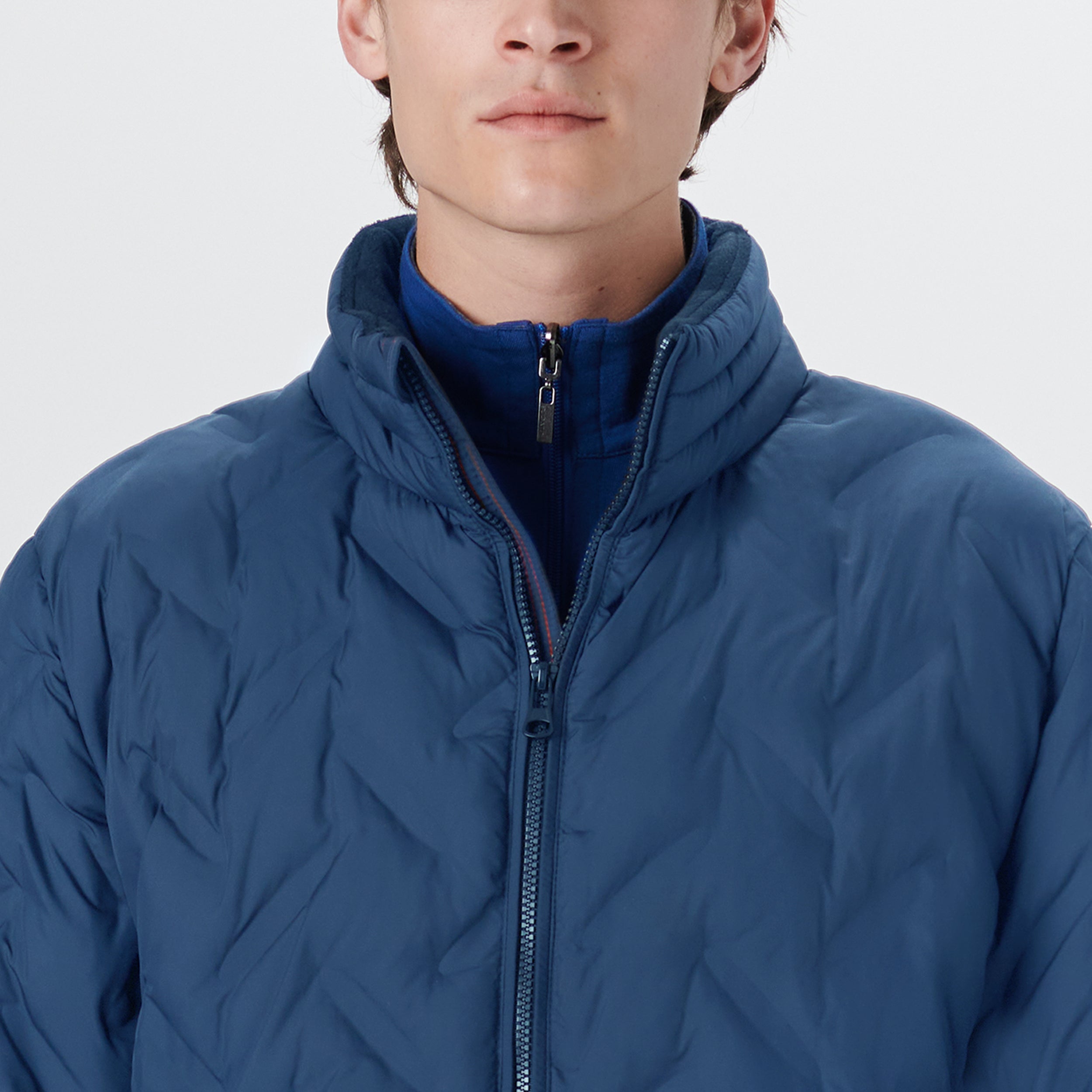 Water repellent, welded nylon and certified Sorona Aura filled quilted blouson jacket with high standing padded collar, vertical zip pockets and elasticized cuffs and waistband. Sorona Aura is a lightweight and breathable insulation with long-lasting shape retention and warmth. Outerwear made from this innovative and partially plant-based insulation benefit from exceptional breathability and comfort, at a lower environmental footprint.