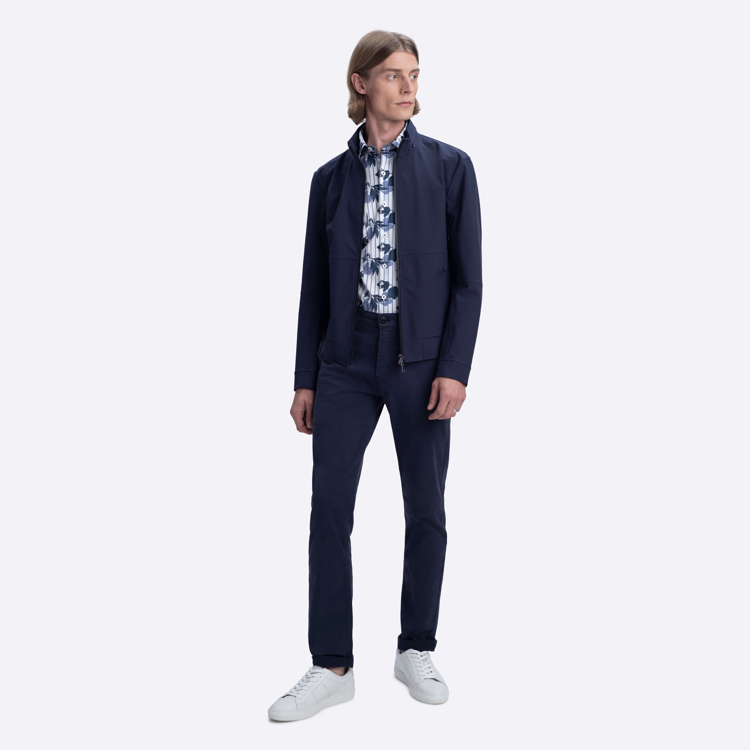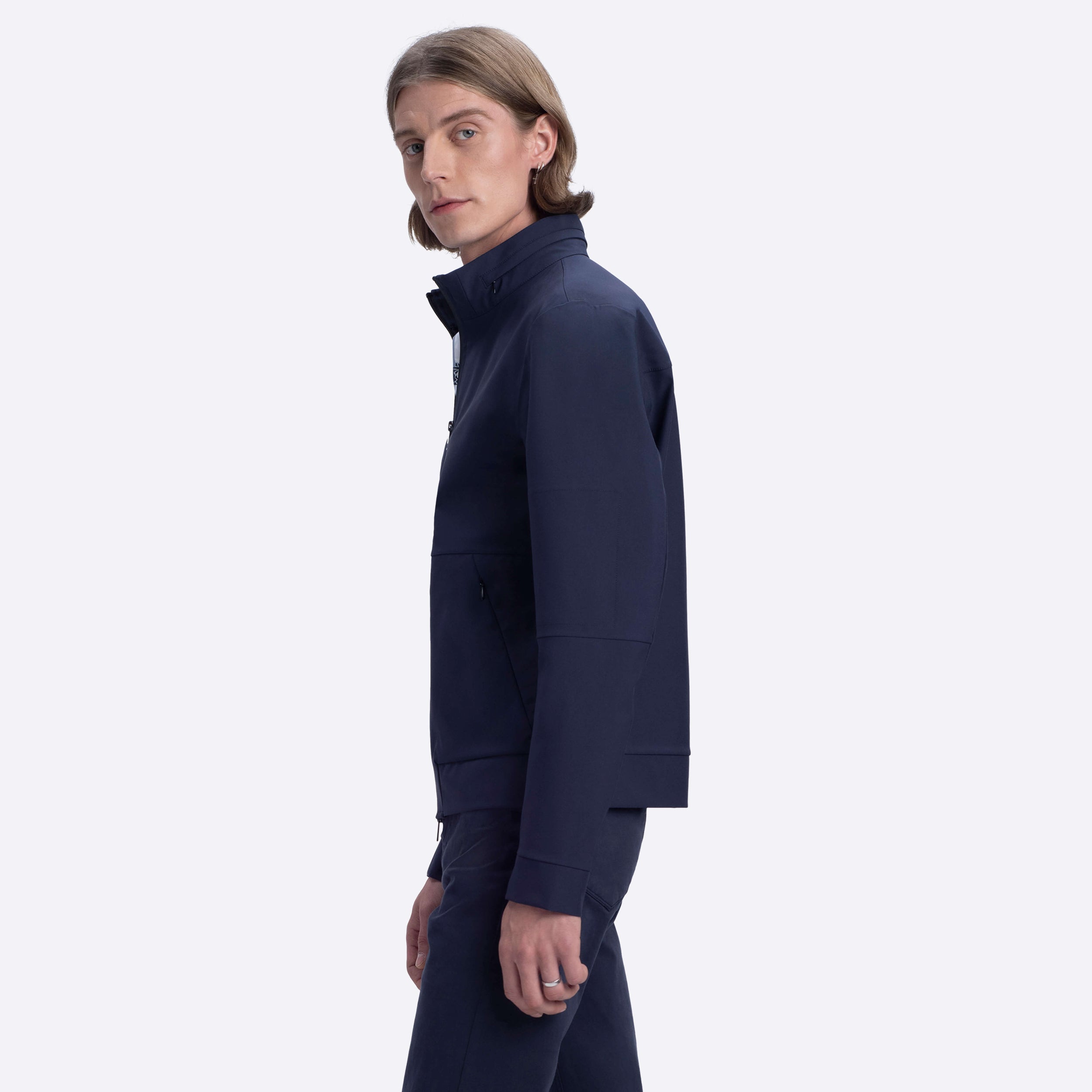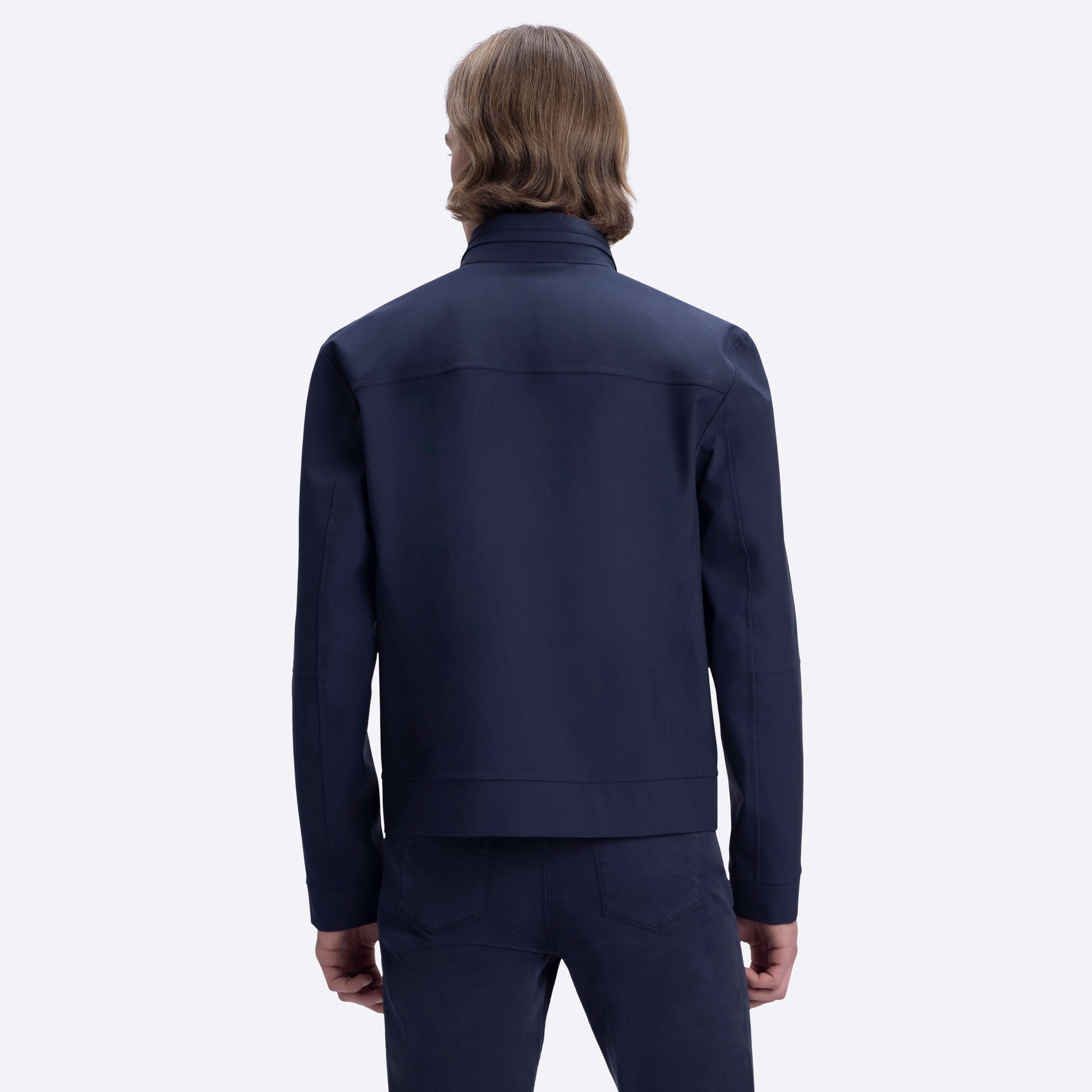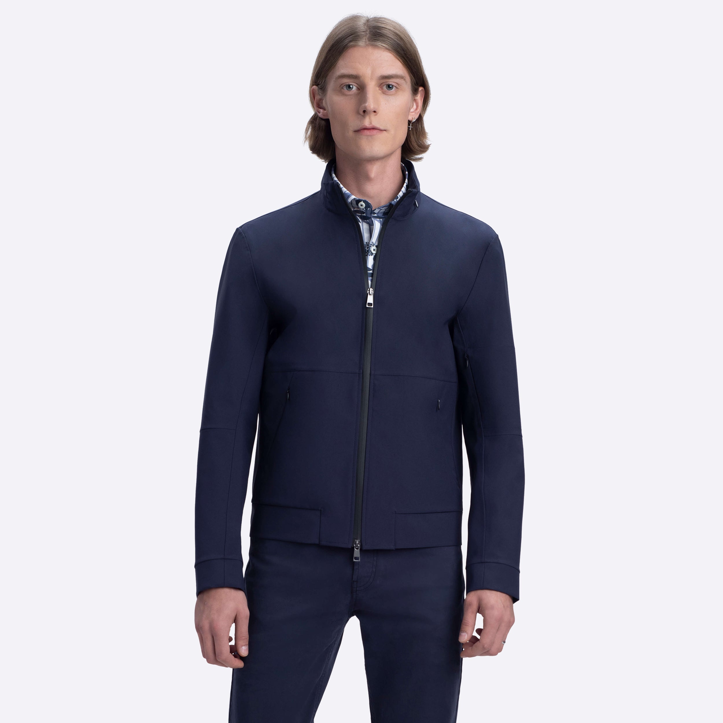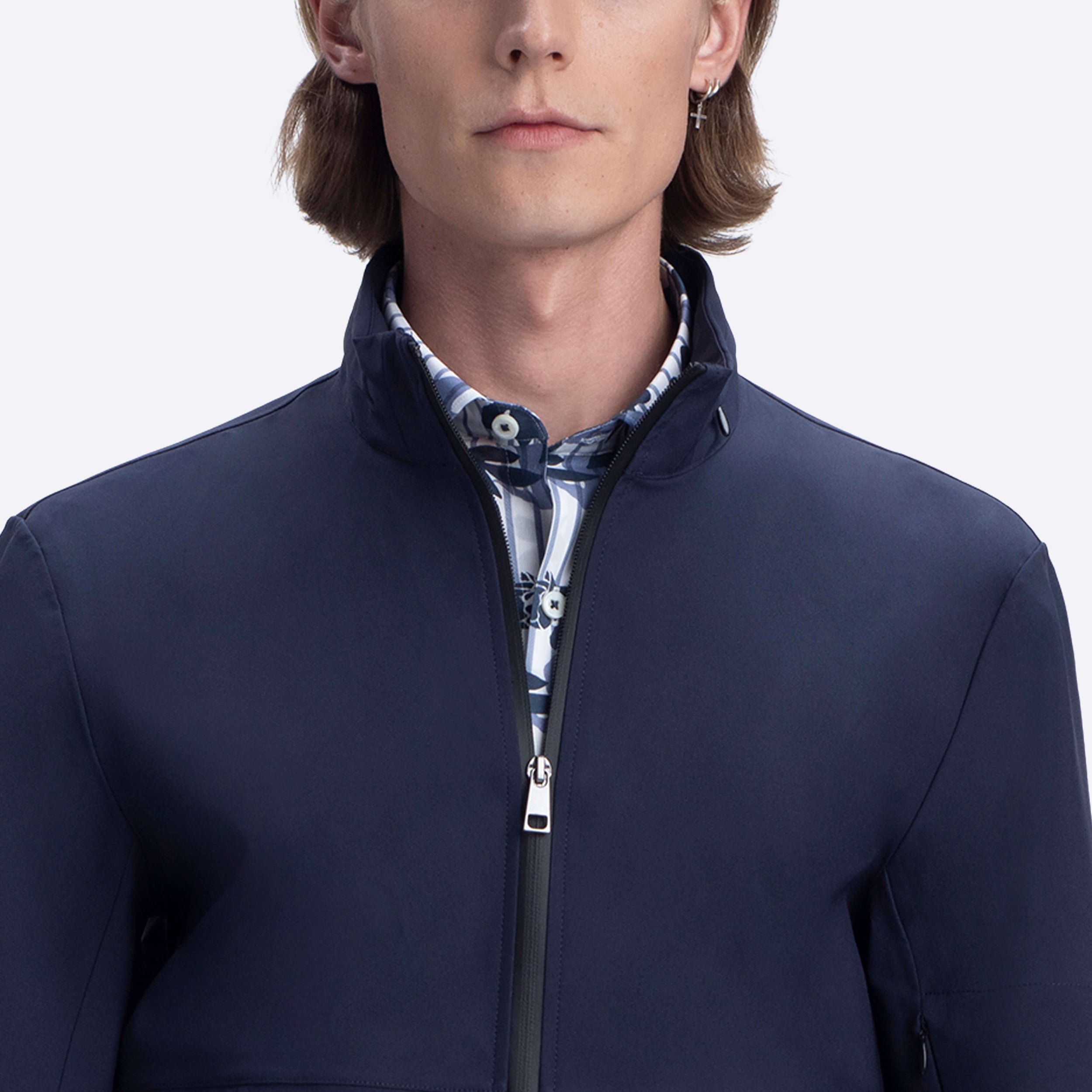 Bomber jacket in water resistant fabric with inside contrast color, two-way zipper closure, two side pockets with covered zippers and a stow-away hood inside collar band.