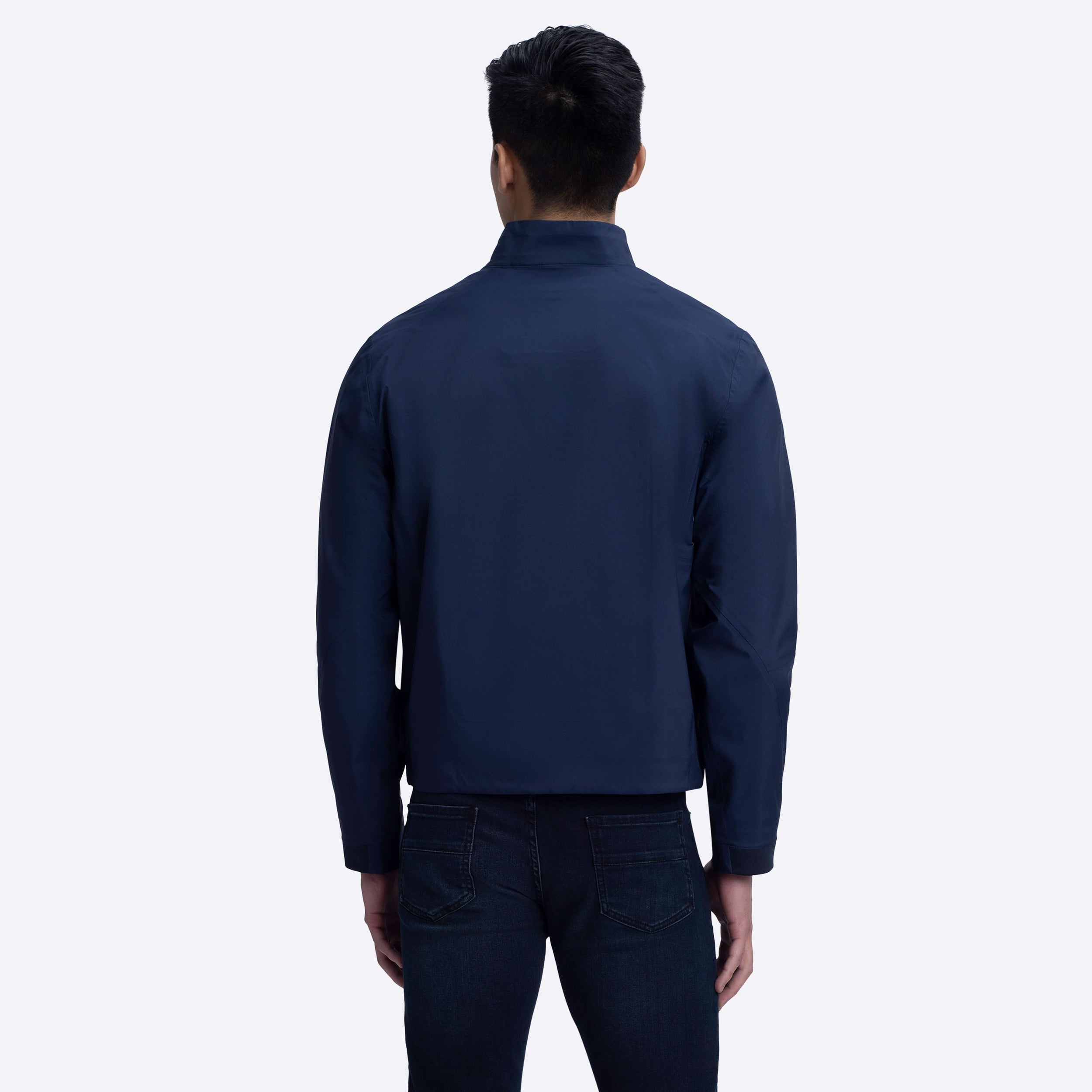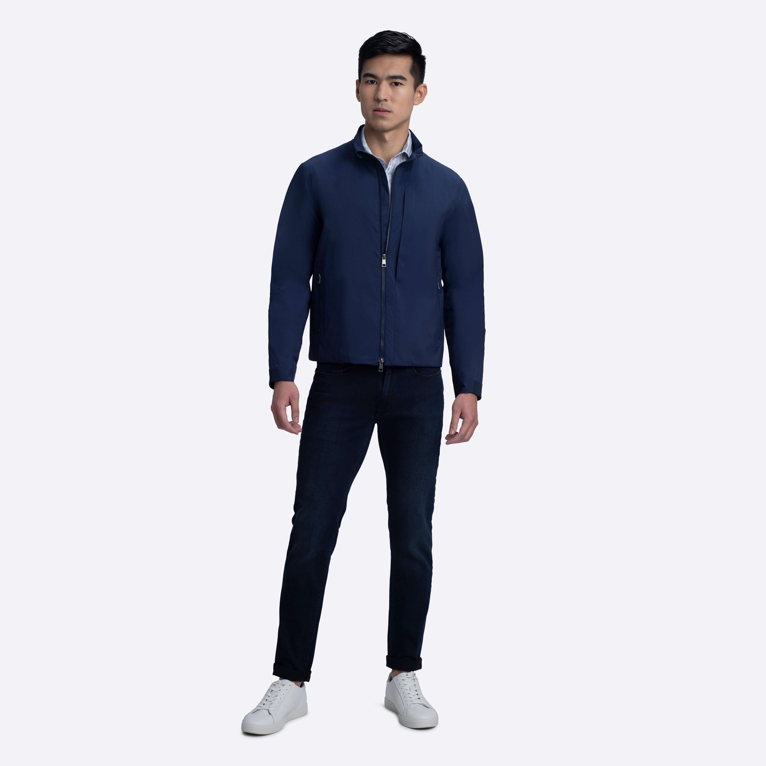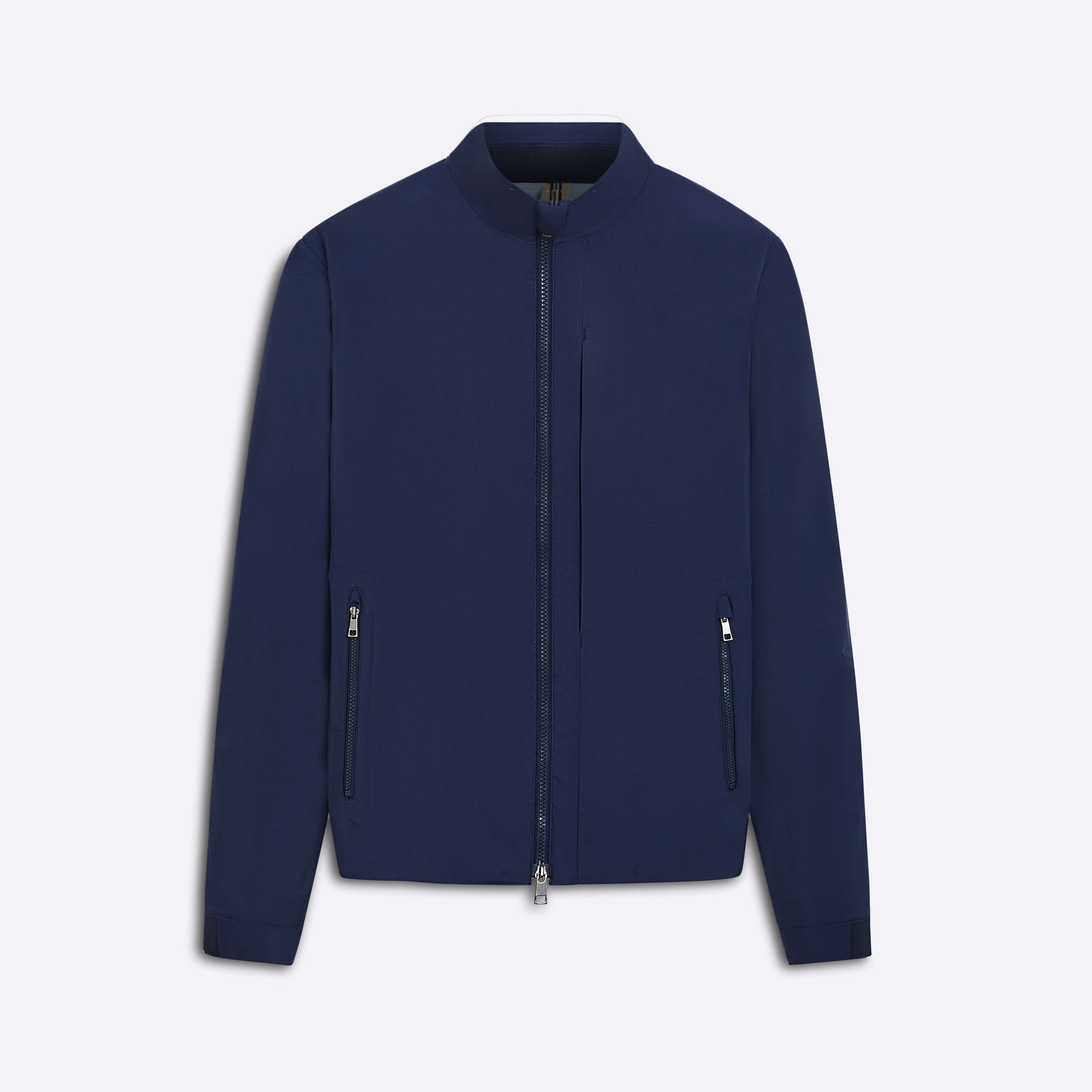 Bomber jacket in water resistant nylon with inside contrast color and knit padding, full zip closure, high standing collar, half ribbed open sleeve cuffs, and slit pockets with zippers.