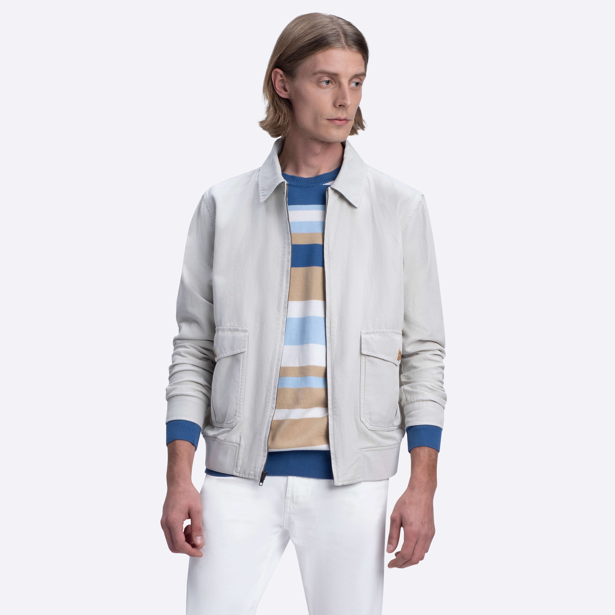 Bomber jacket in cotton linen blend with full zip closure, rib waistband and patch pockets with flap and button closure.