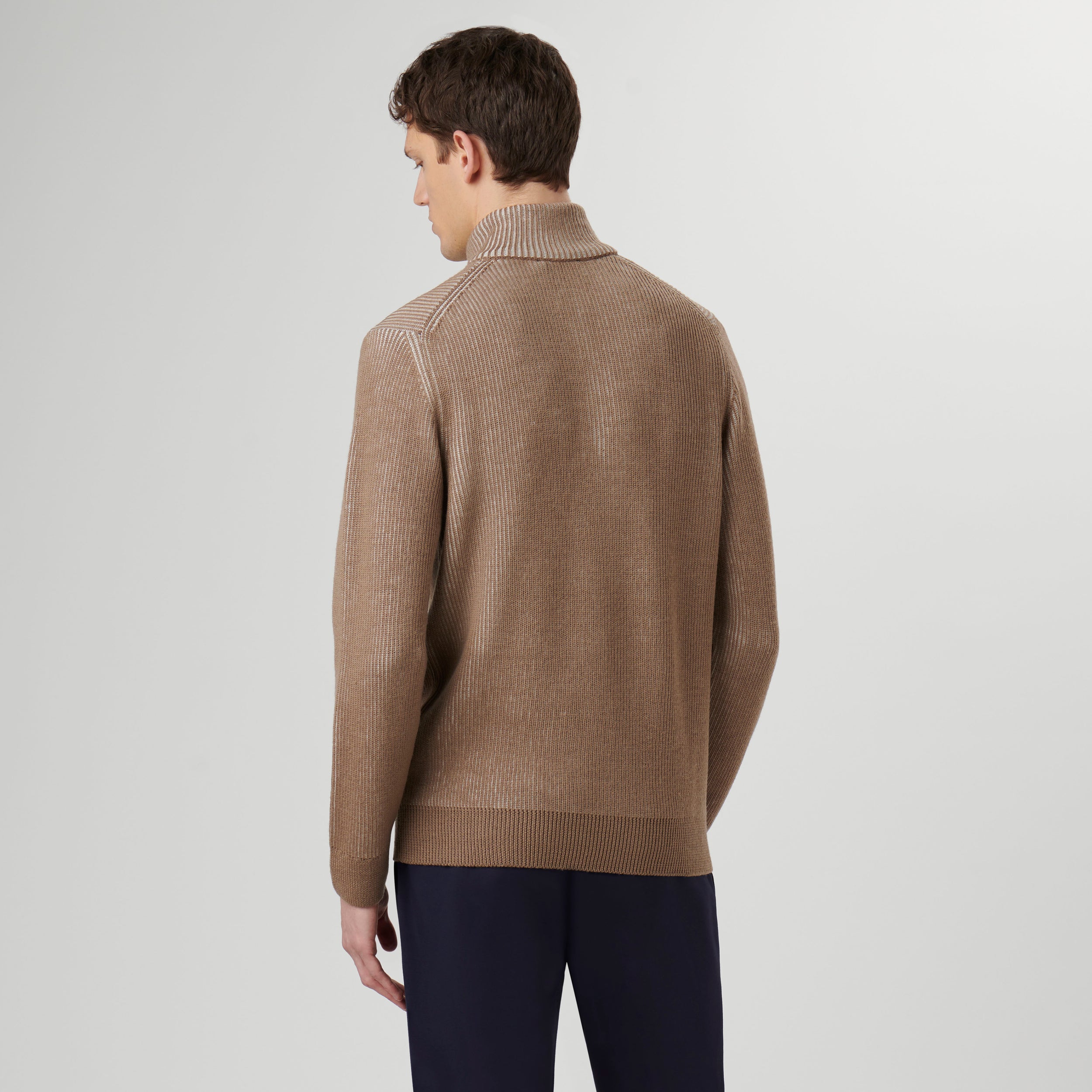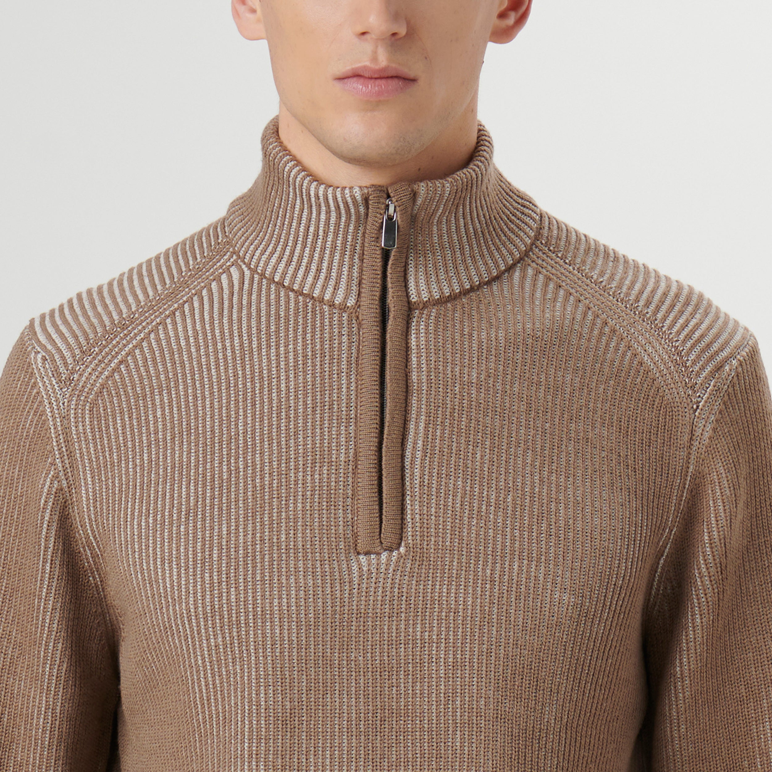 Two-tone cable knit sweater 100% merino wool with quarter zipper closure and mock neck.
