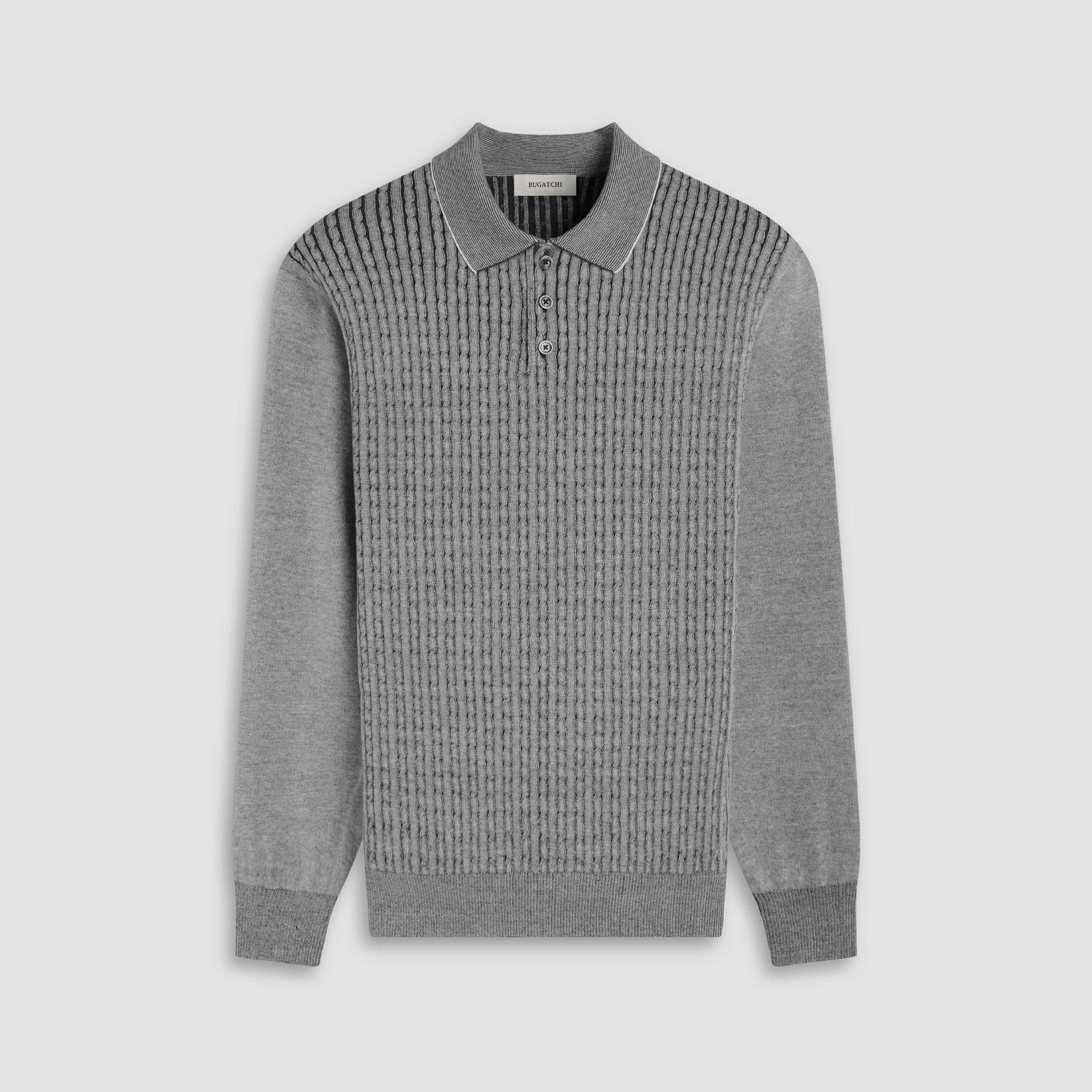 Crafted from a refined cotton-blend, this long sleeve polo sweater features a cable stitch design across the front and back. The sleeves are crafted in a plain garter stitch for a refined contrast, and the bird's eye rib collar is accented with subtle contrast tipping. The cuffs and hem are finished in a melange rib, providing a soft and comfortable fit. Ideal for transitional weather and casual occasions.