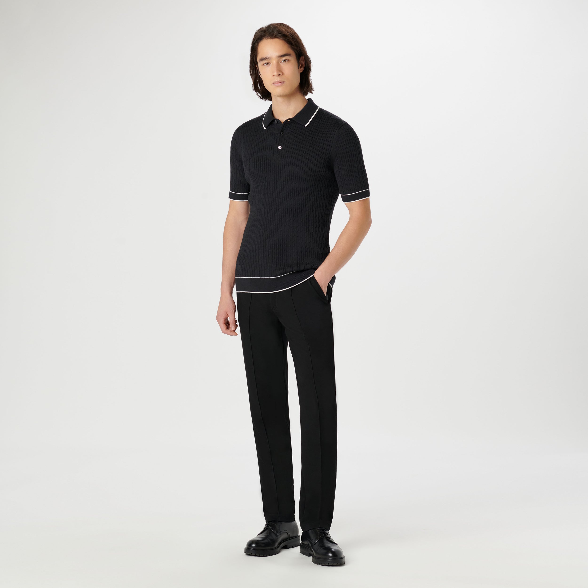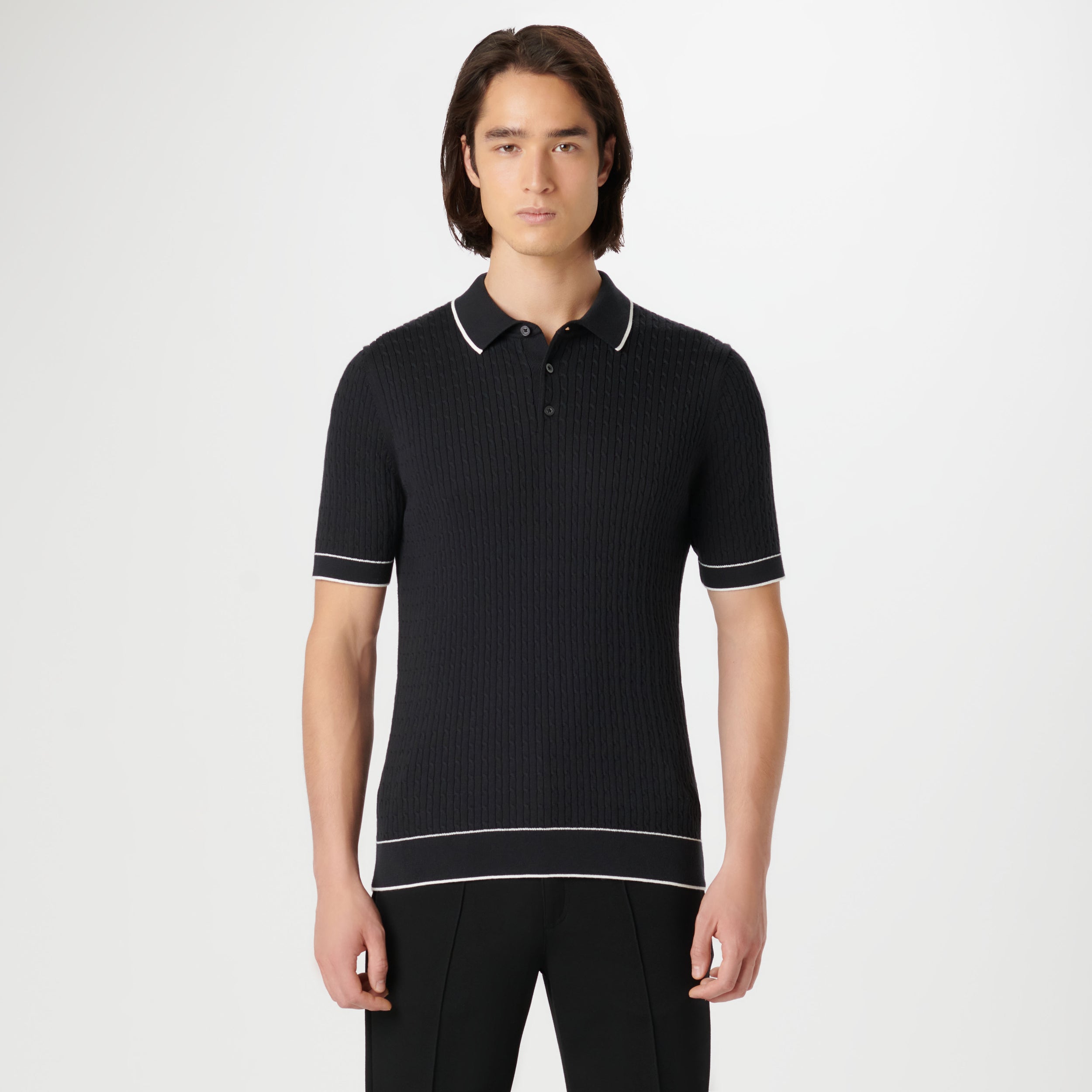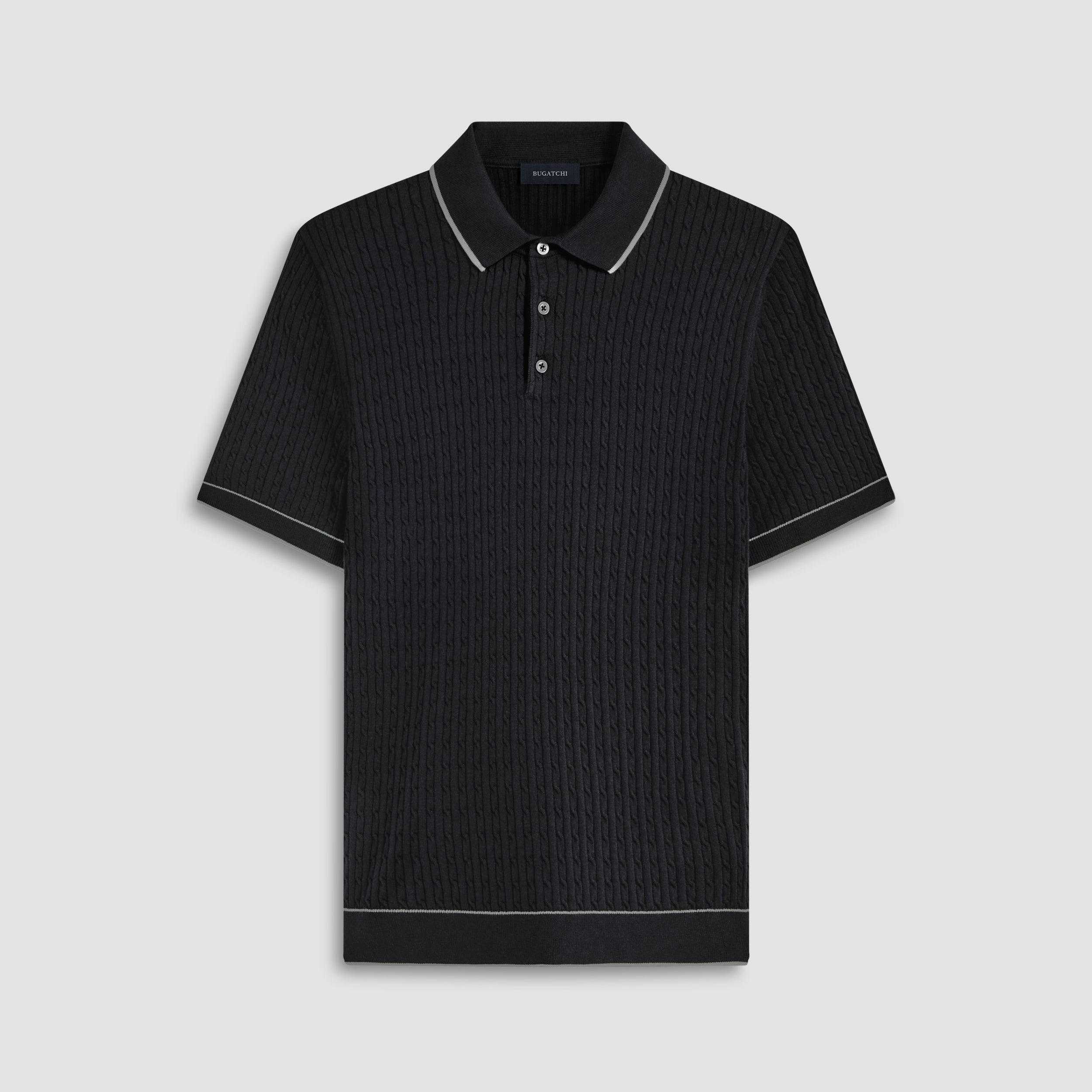 Crafted in a durable blend of cotton and polyester, this cable stitch short-sleeved polo sweater boasts a three-button placket and solid flat knit collar, armbands, and waist. Soft against the skin with comfort stretch and added strength for lasting wear, it strikes a perfect balance between comfort and durability.
