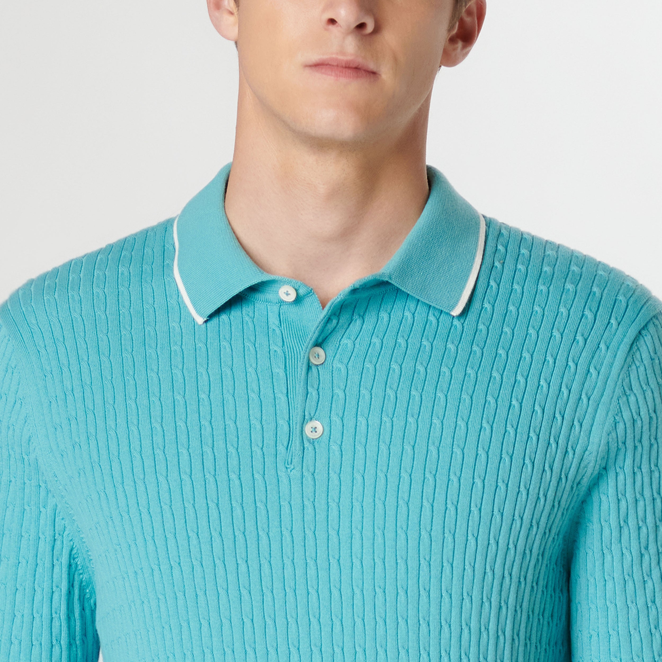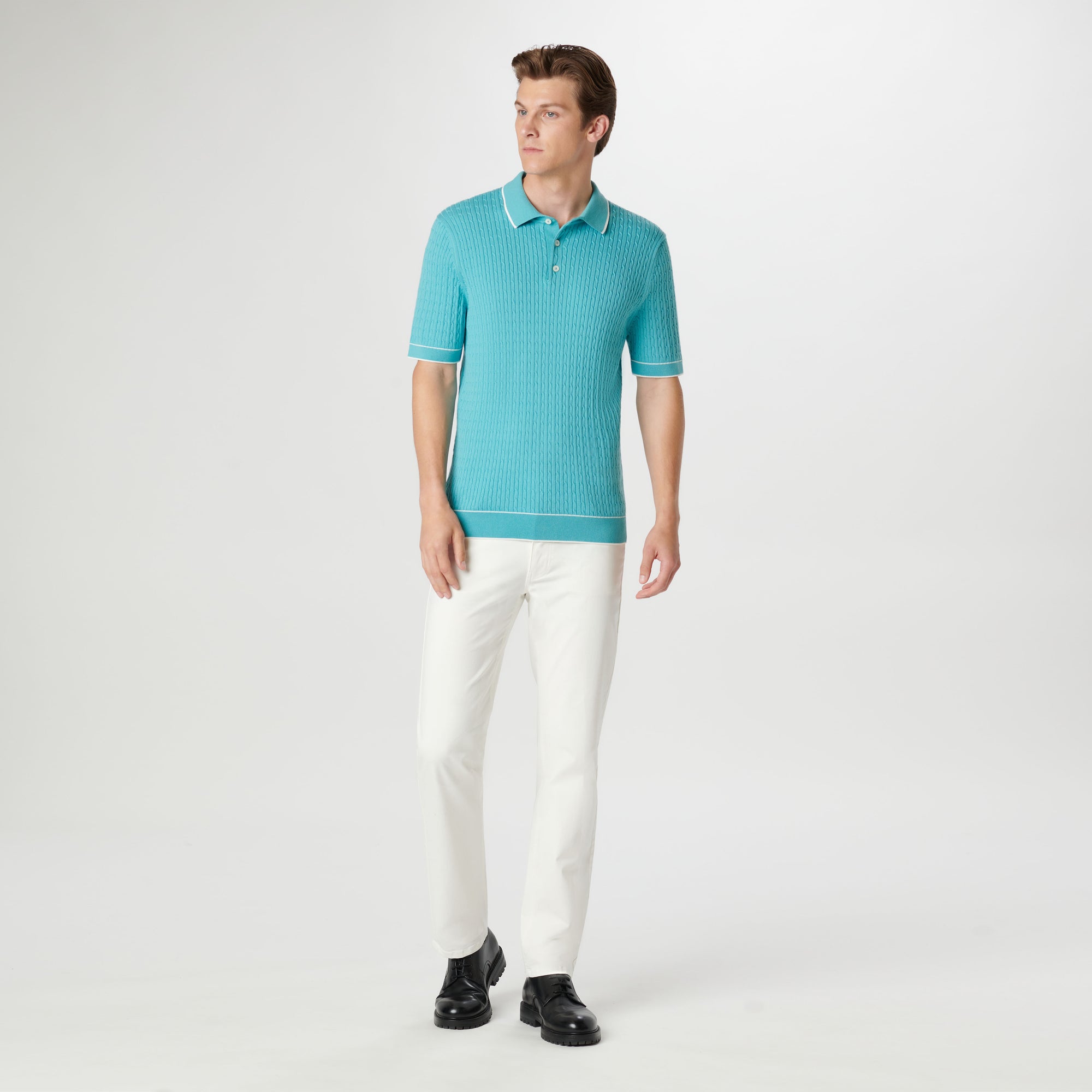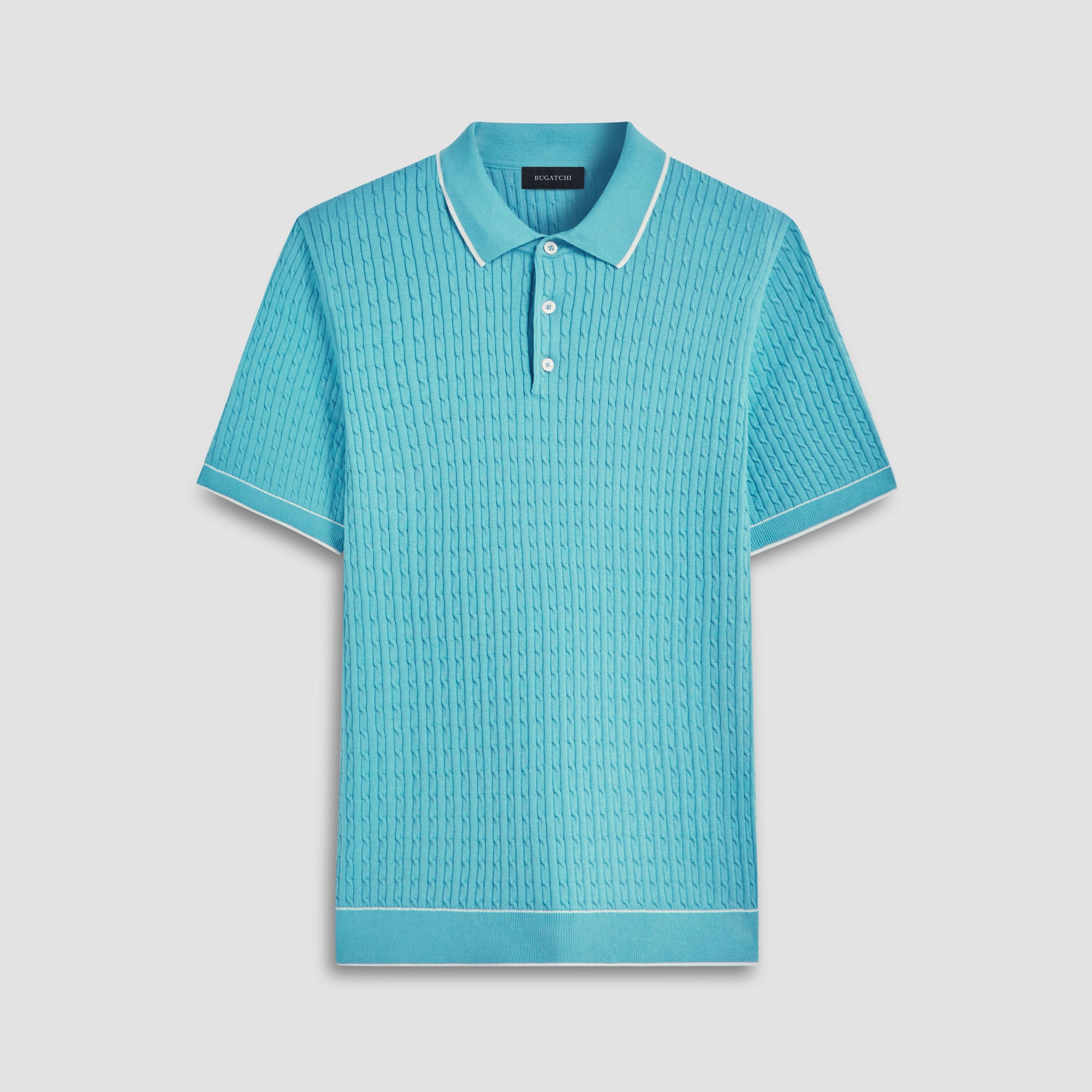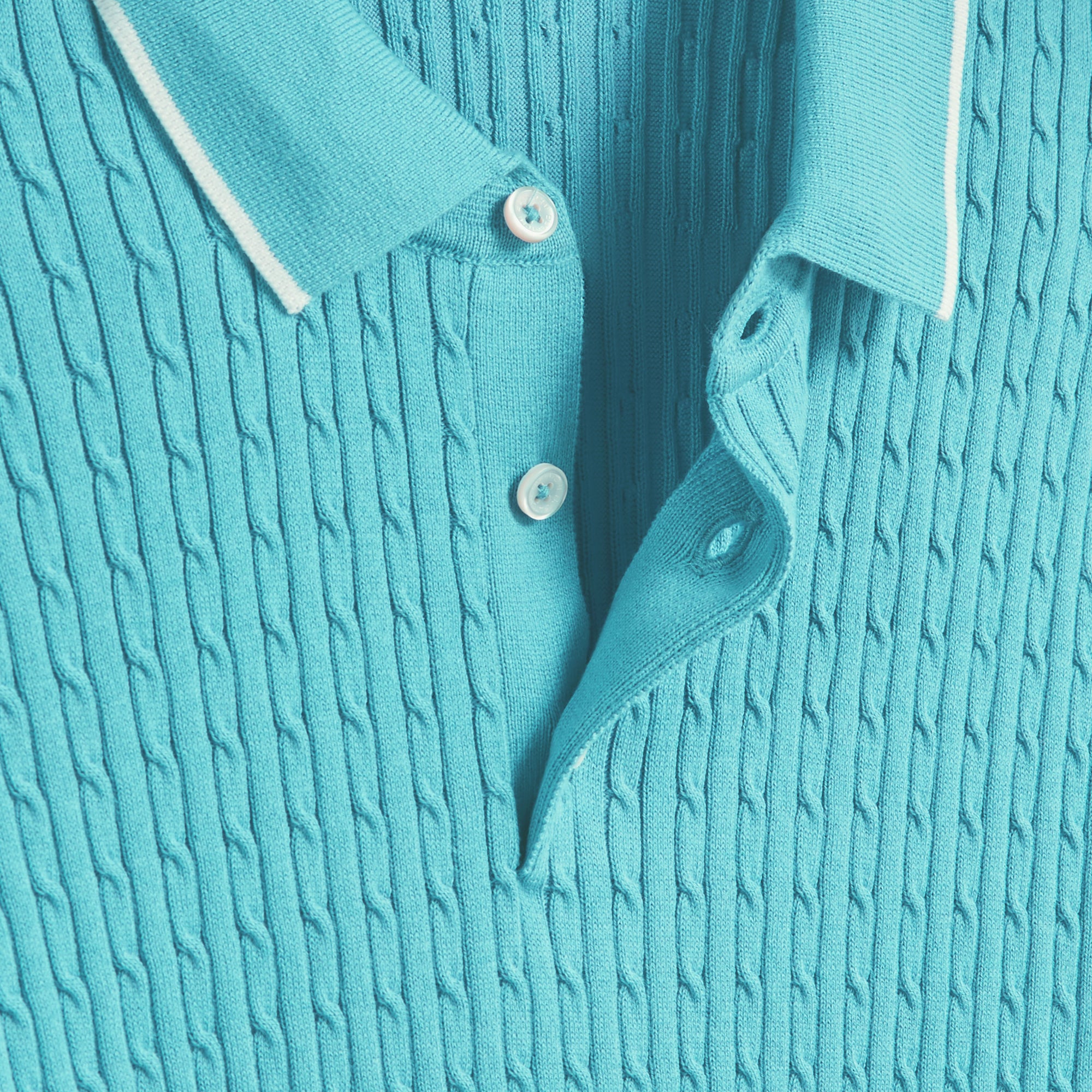 Crafted in a durable blend of cotton and polyester, this cable stitch short-sleeved polo sweater boasts a three-button placket and solid flat knit collar, armbands, and waist. Soft against the skin with comfort stretch and added strength for lasting wear, it strikes a perfect balance between comfort and durability.