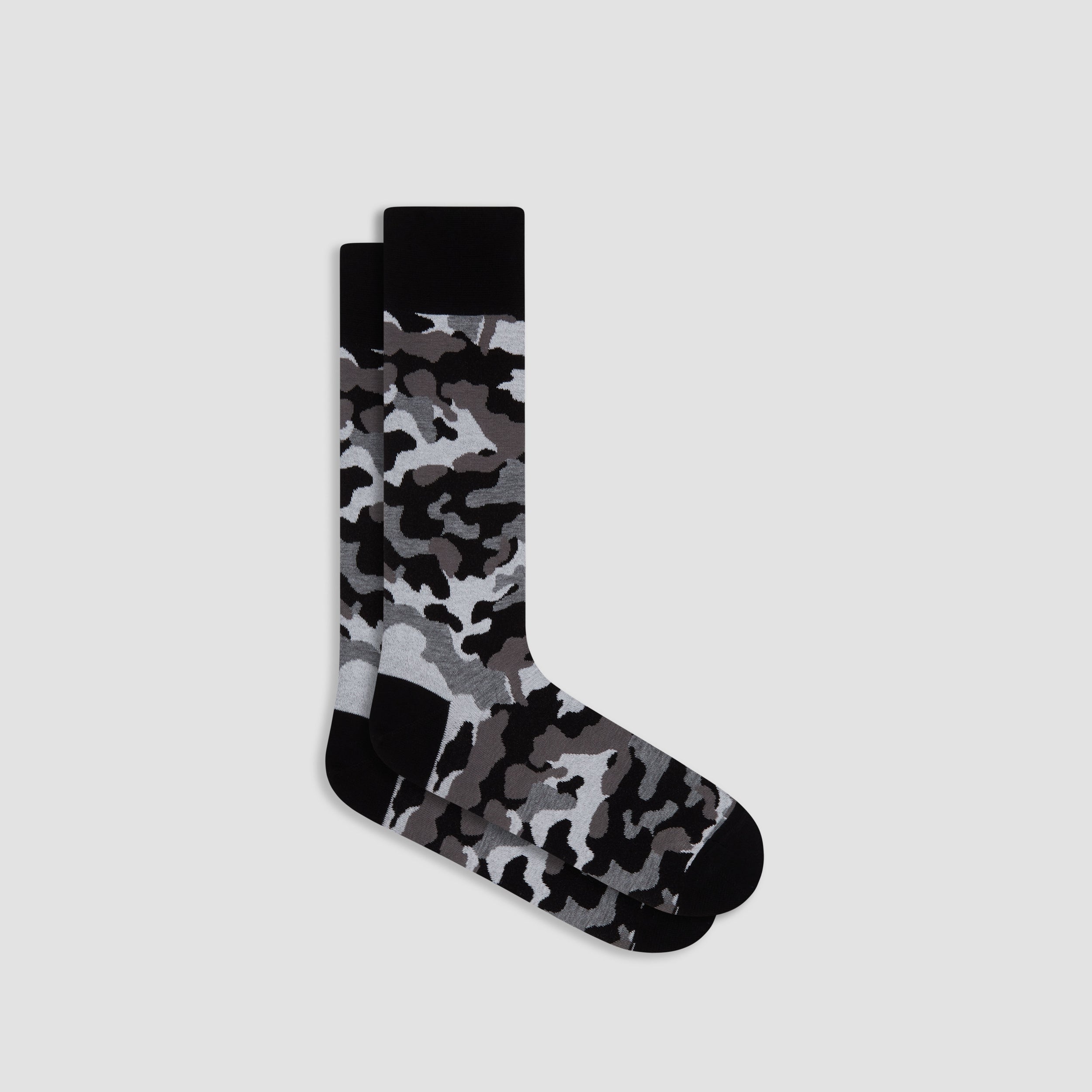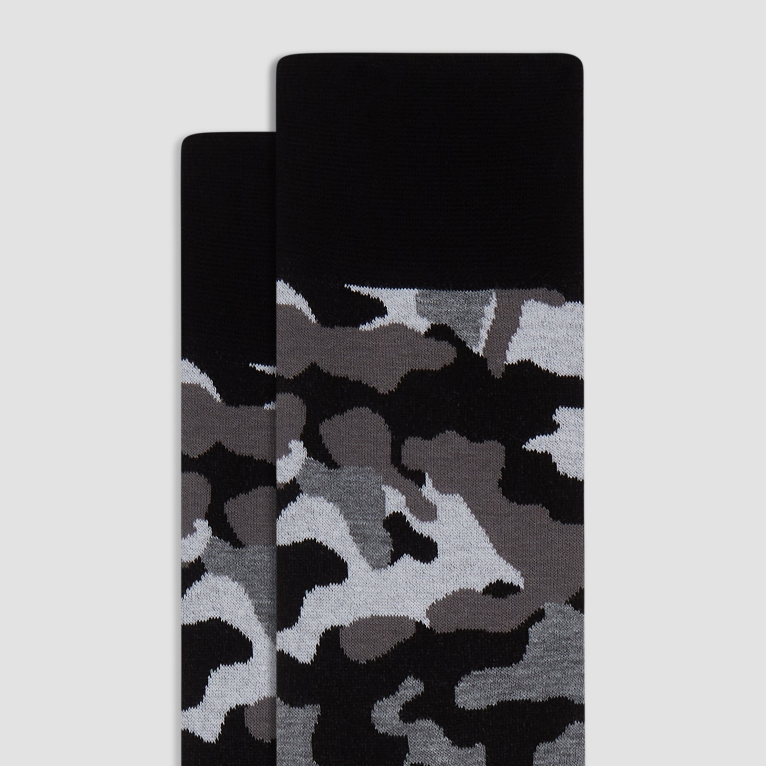 Camouflage mid-calf socks in fine gauge mercerized cotton blend with rib knit cuff band, hand linked toe and reinforced heel seams. Made in Italy.
