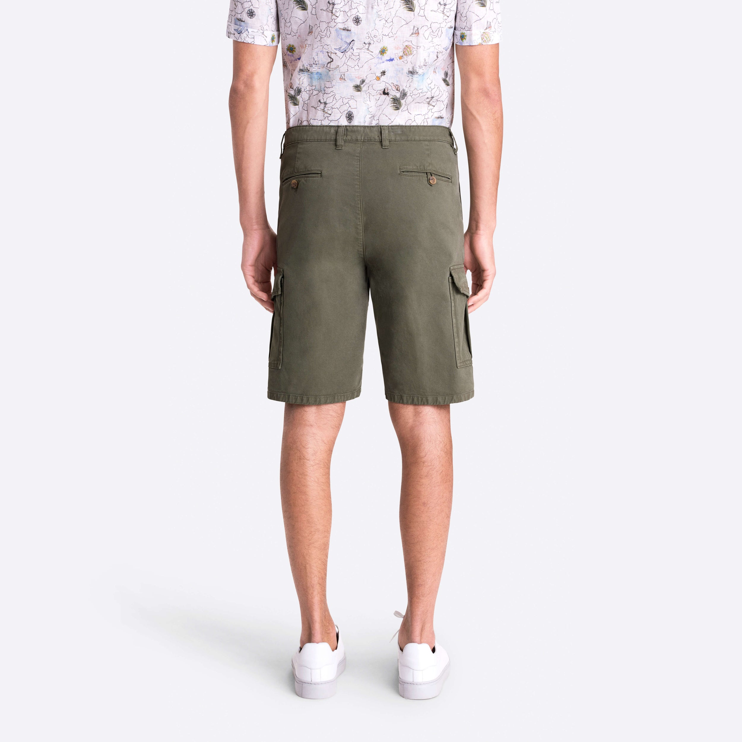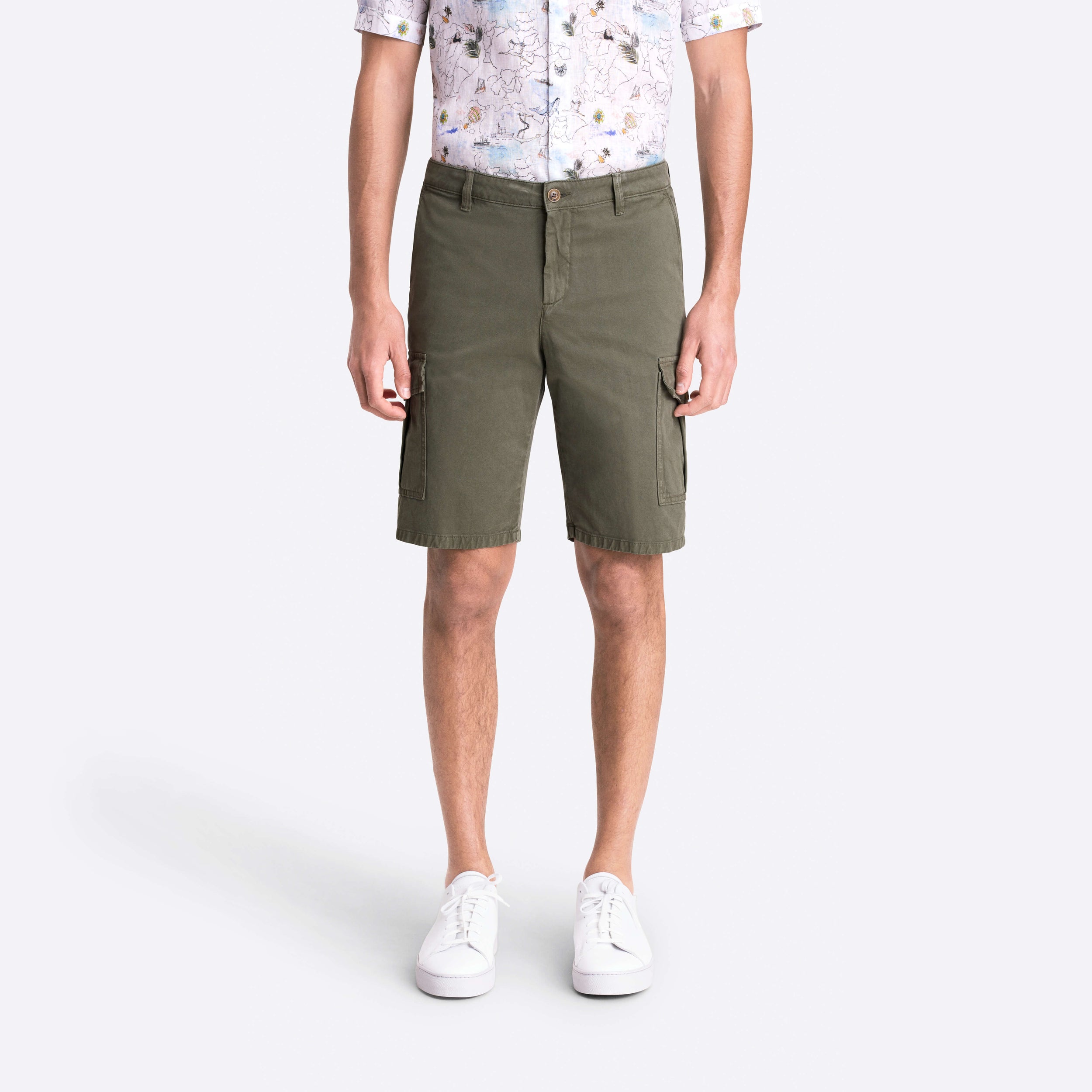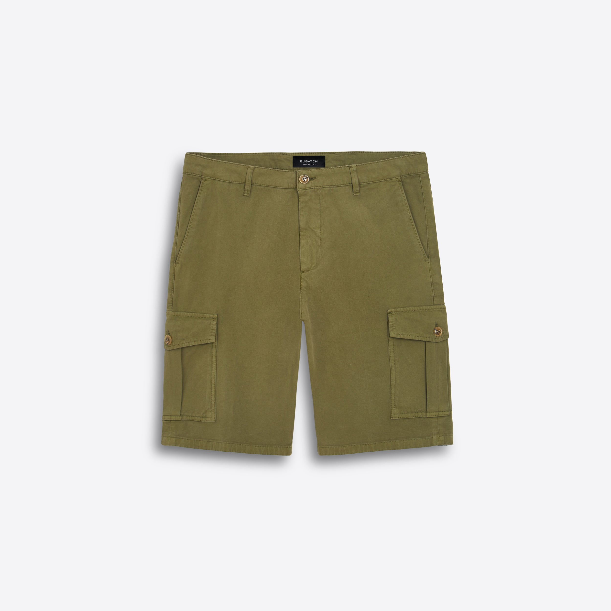 Cargo Bermuda shorts in stretch cotton feature a waistband with belt loops, a button and zip fly, angled side pockets, cargo style side pockets with flap and jetted back pockets with loop and button. Made in Italy