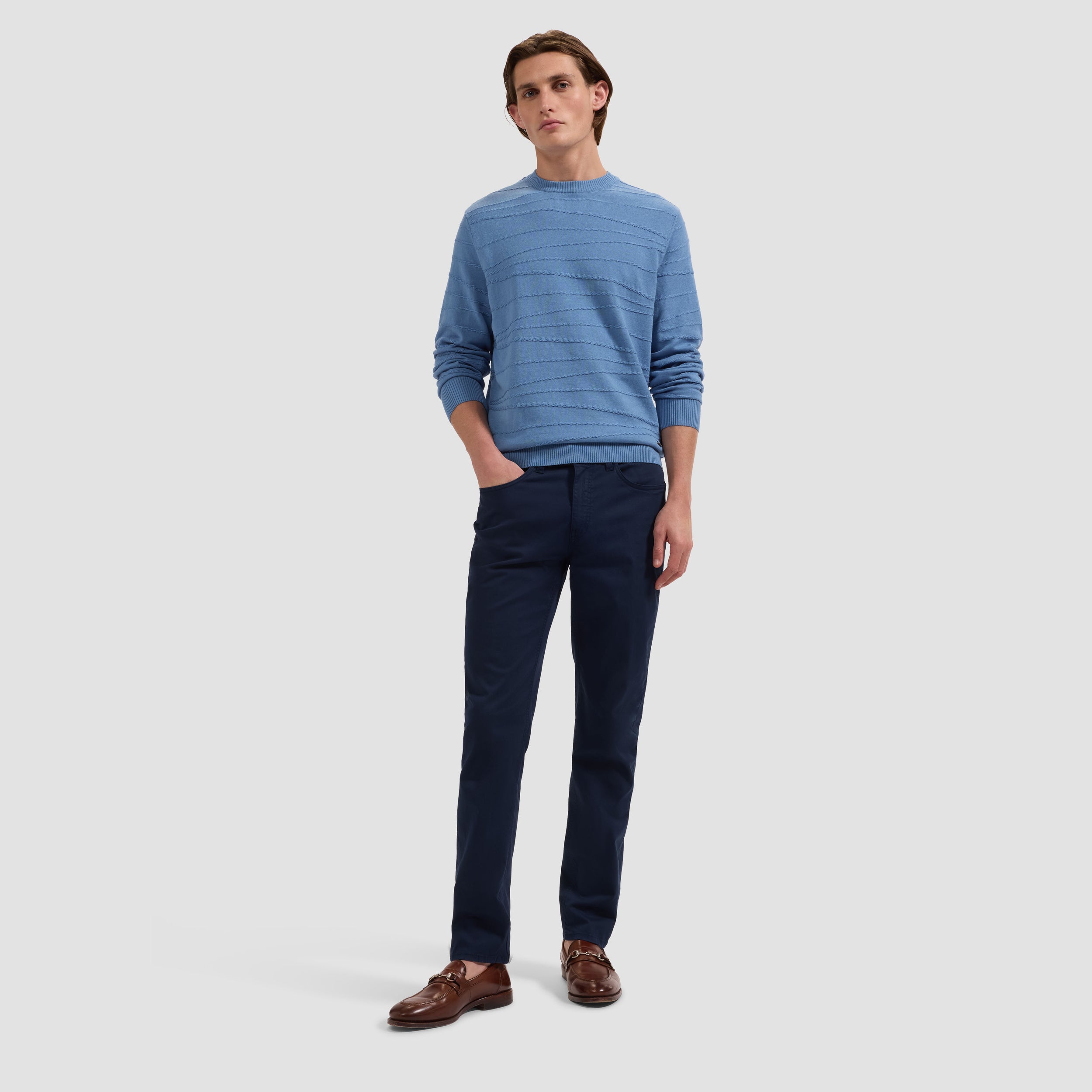 Crafted from a luxurious cotton-silk blend, this elevated crewneck sweater showcases an allover chain-link pattern for distinctive texture and refined dimension. Finished with ribbed collar, cuffs, and hem, it's a versatile and polished layer perfect for sophisticated everyday style.